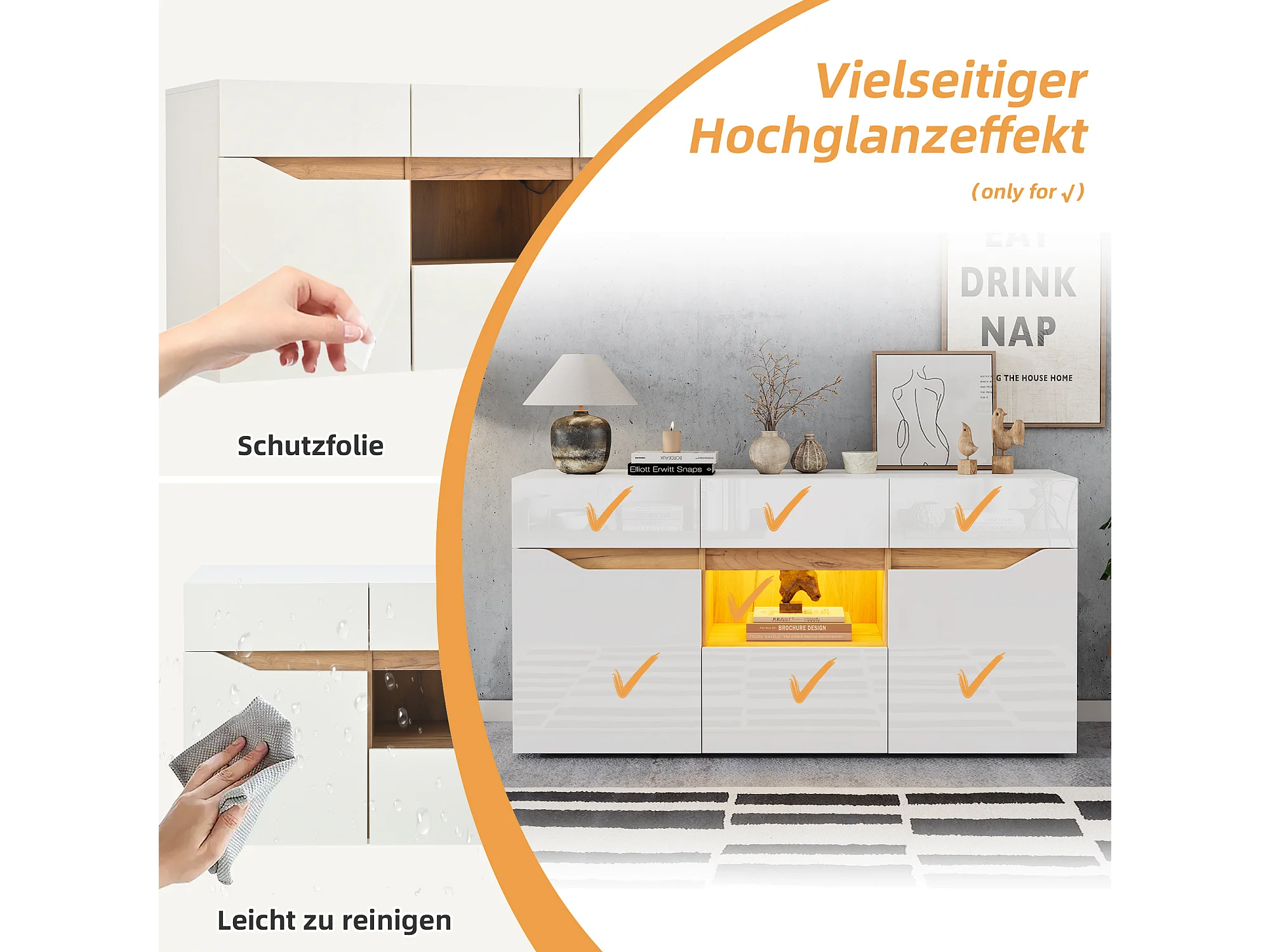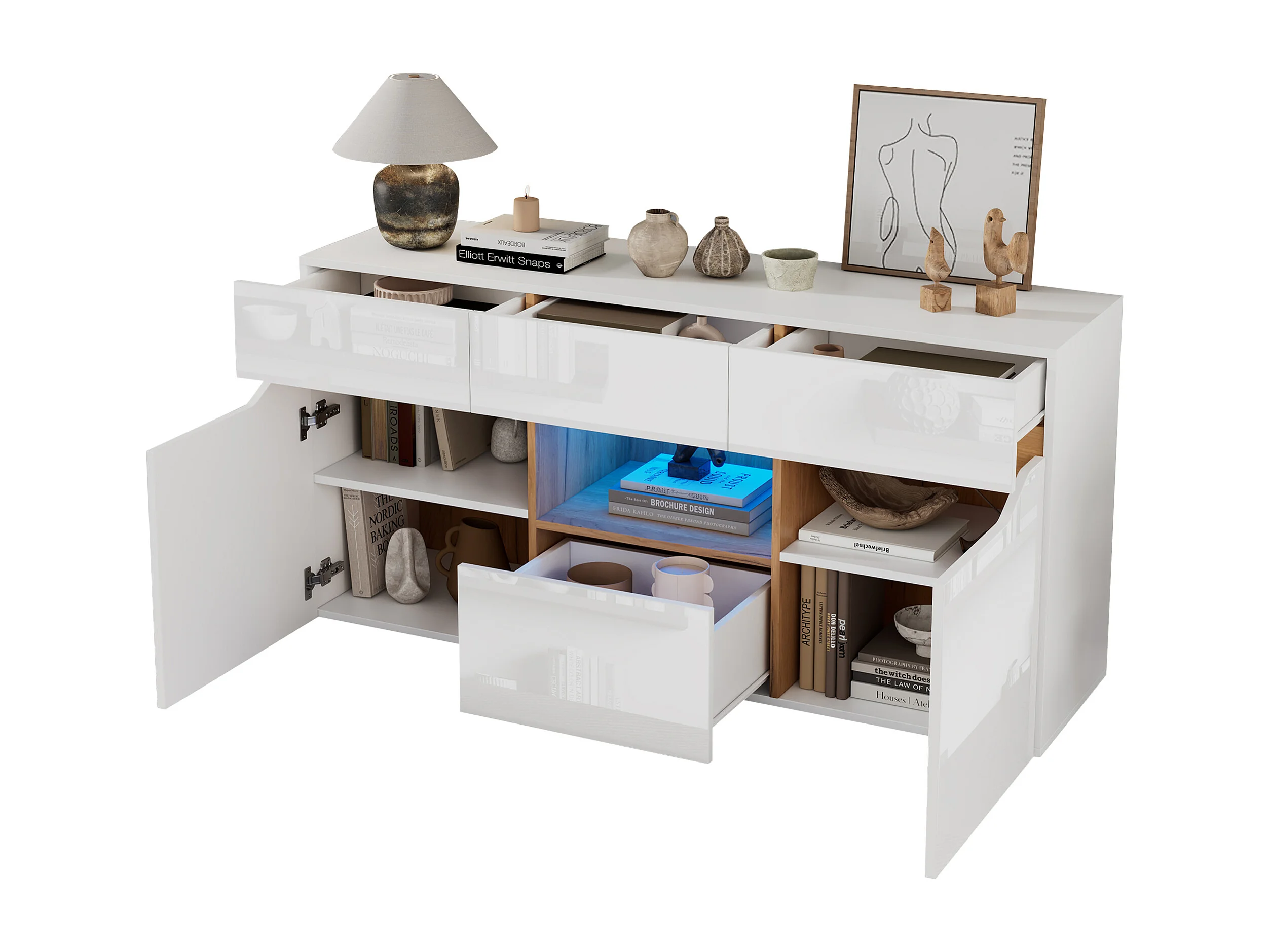 Buffet brillant de salon - 140 x 40 x 70cm - avec 4 tiroirs + 2 portes + Leds - aggloméré - blanc