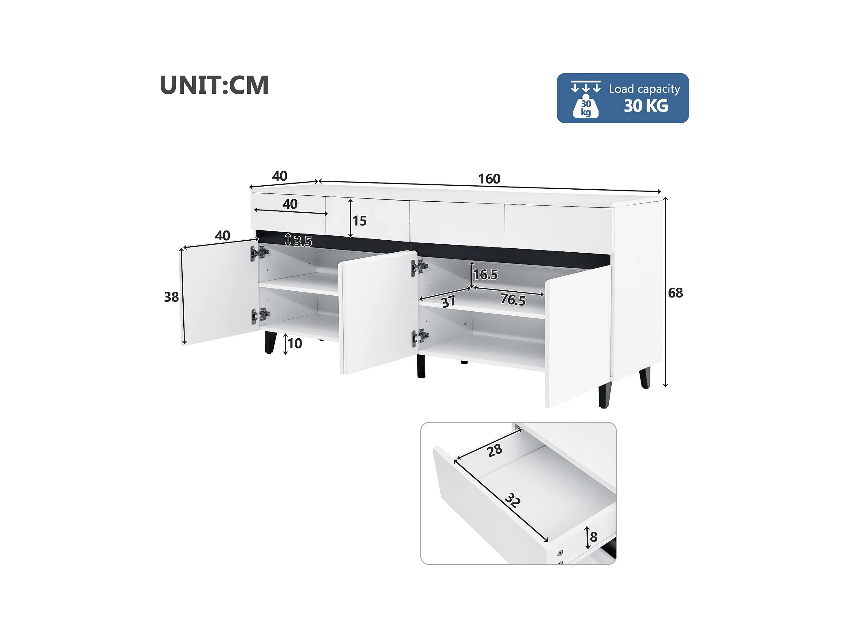 Buffet moderne 160x40x80.5cm - avec 4 portes - MDF - blanc