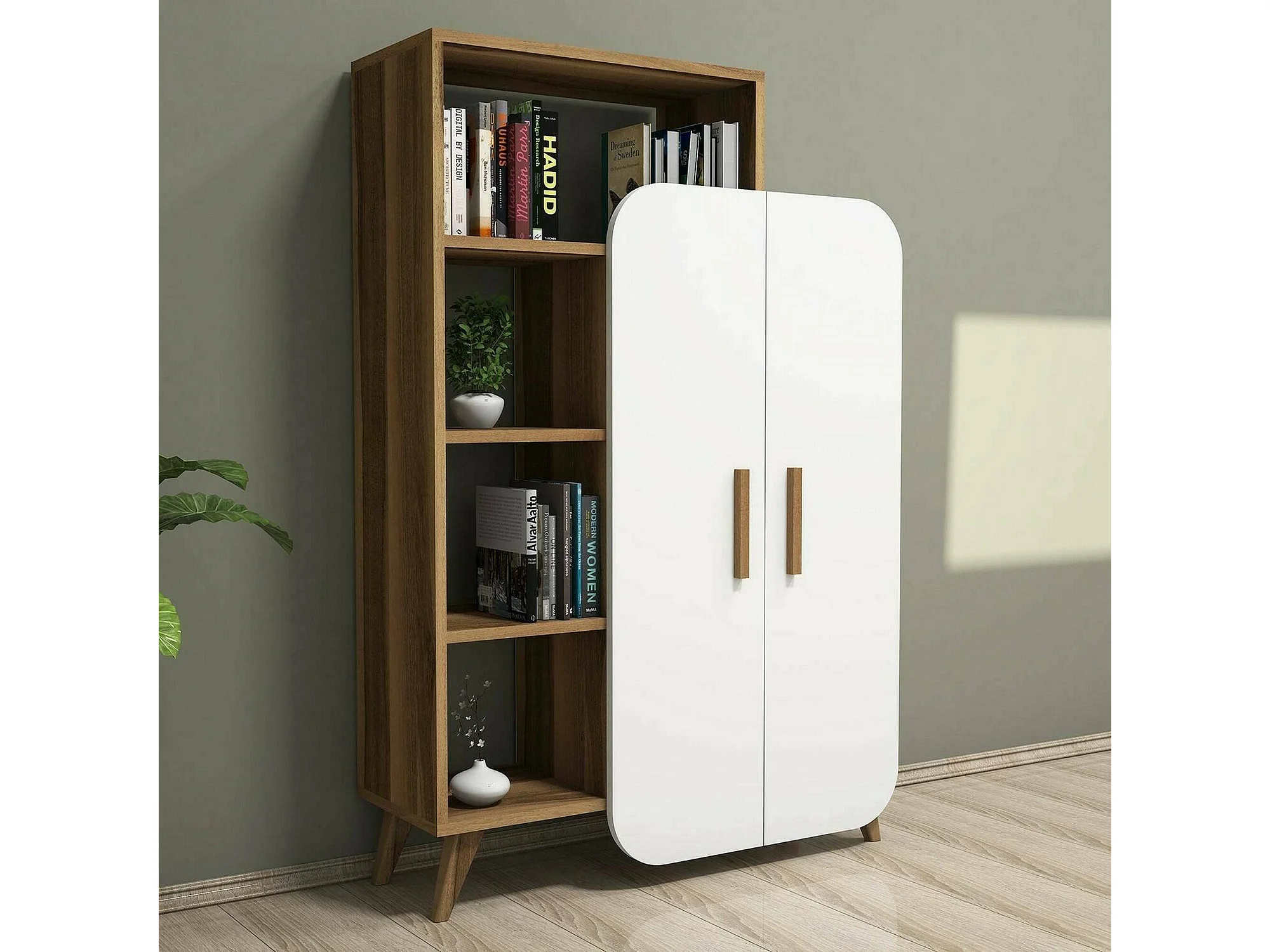 Buffet Capella, Buffet du salon, Commode de salon, Garde-manger de cuisine, 90x32h132 cm, Noyer et Blanc