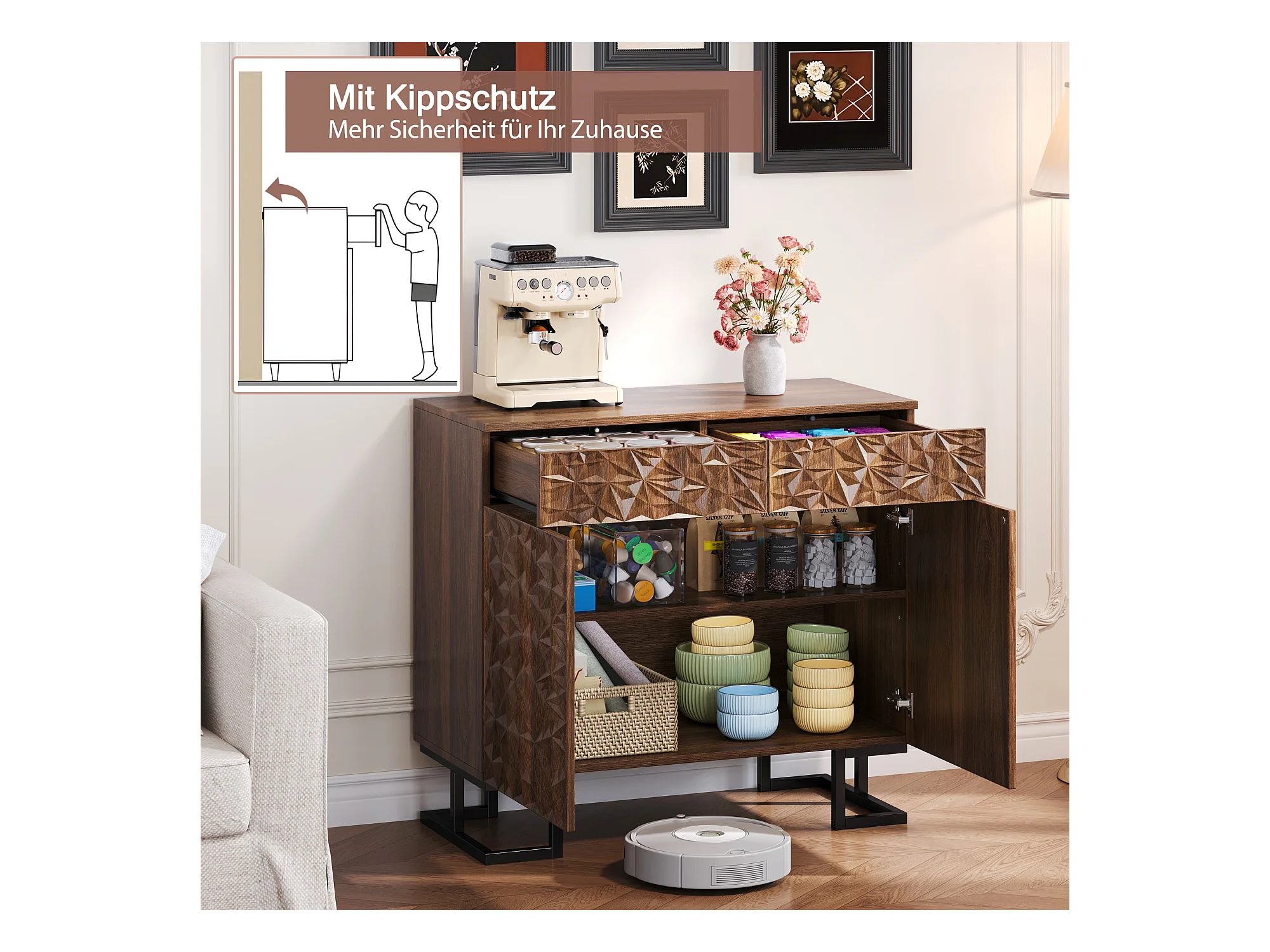 Buffet commode vintage - 80 x 40 x 78 cm - avec relief de feuilles + 2 tiroirs + 2 portes - MDF - marron