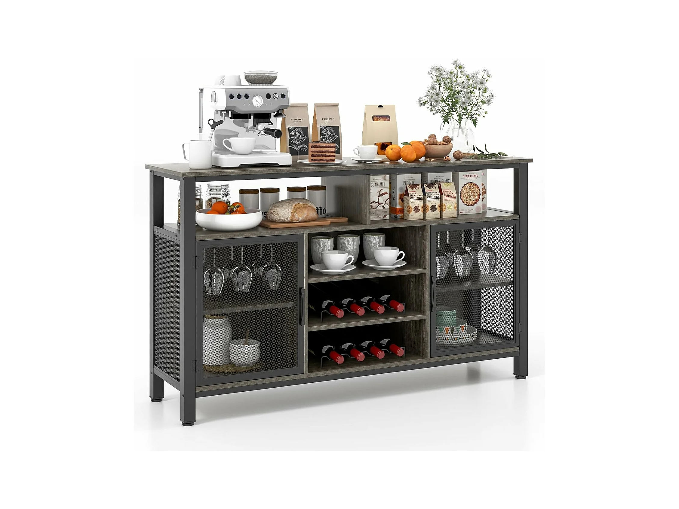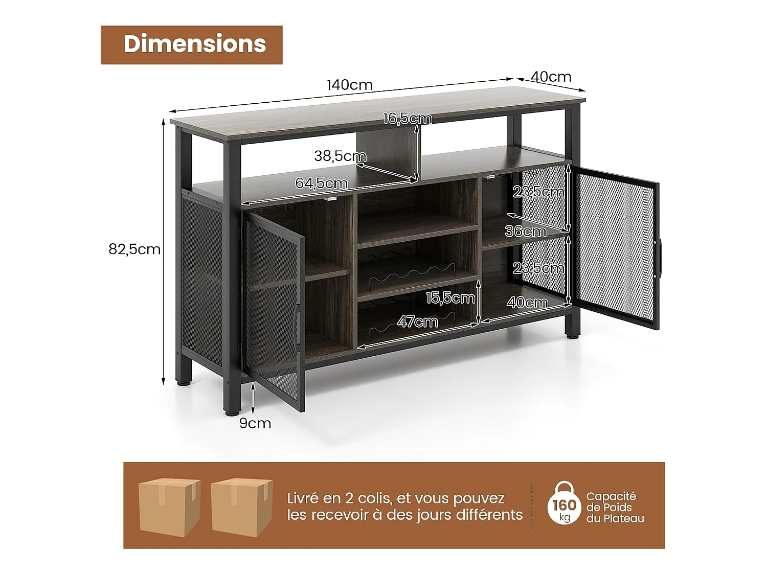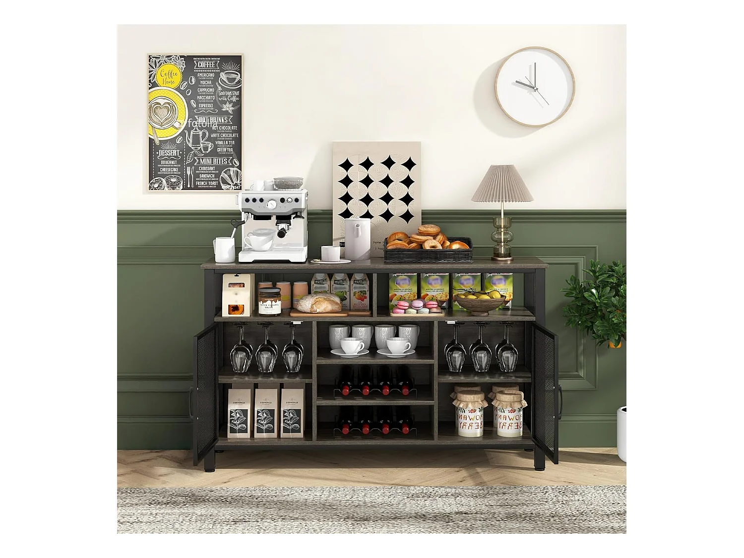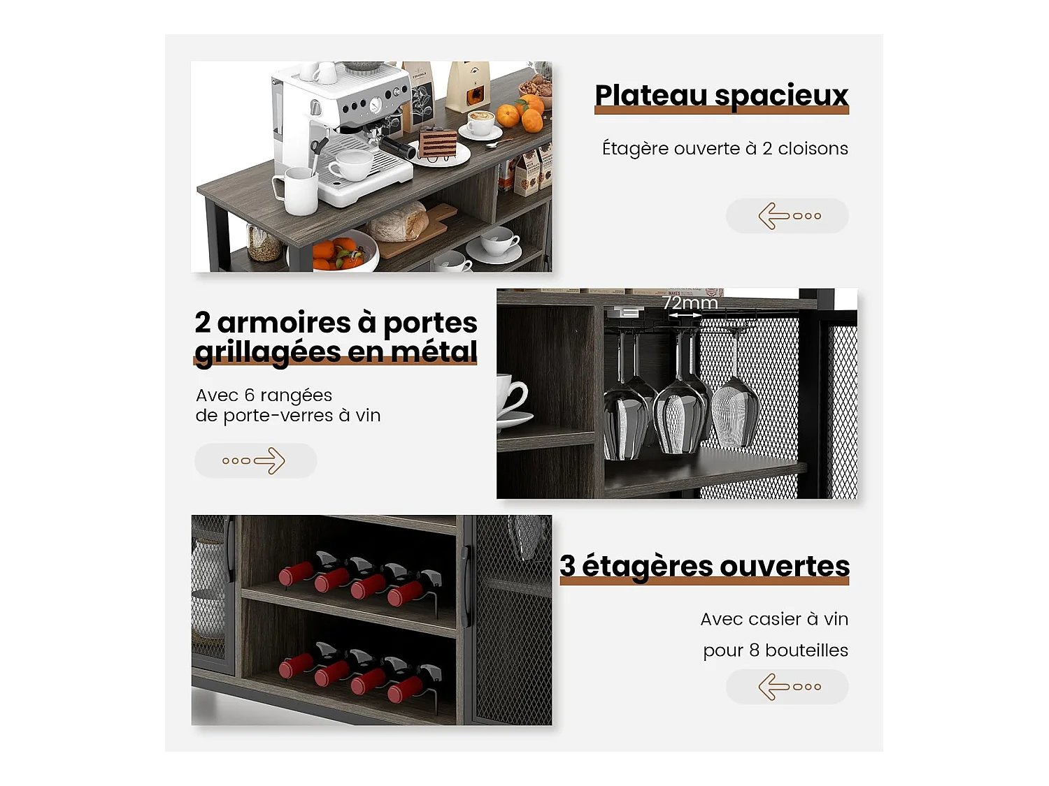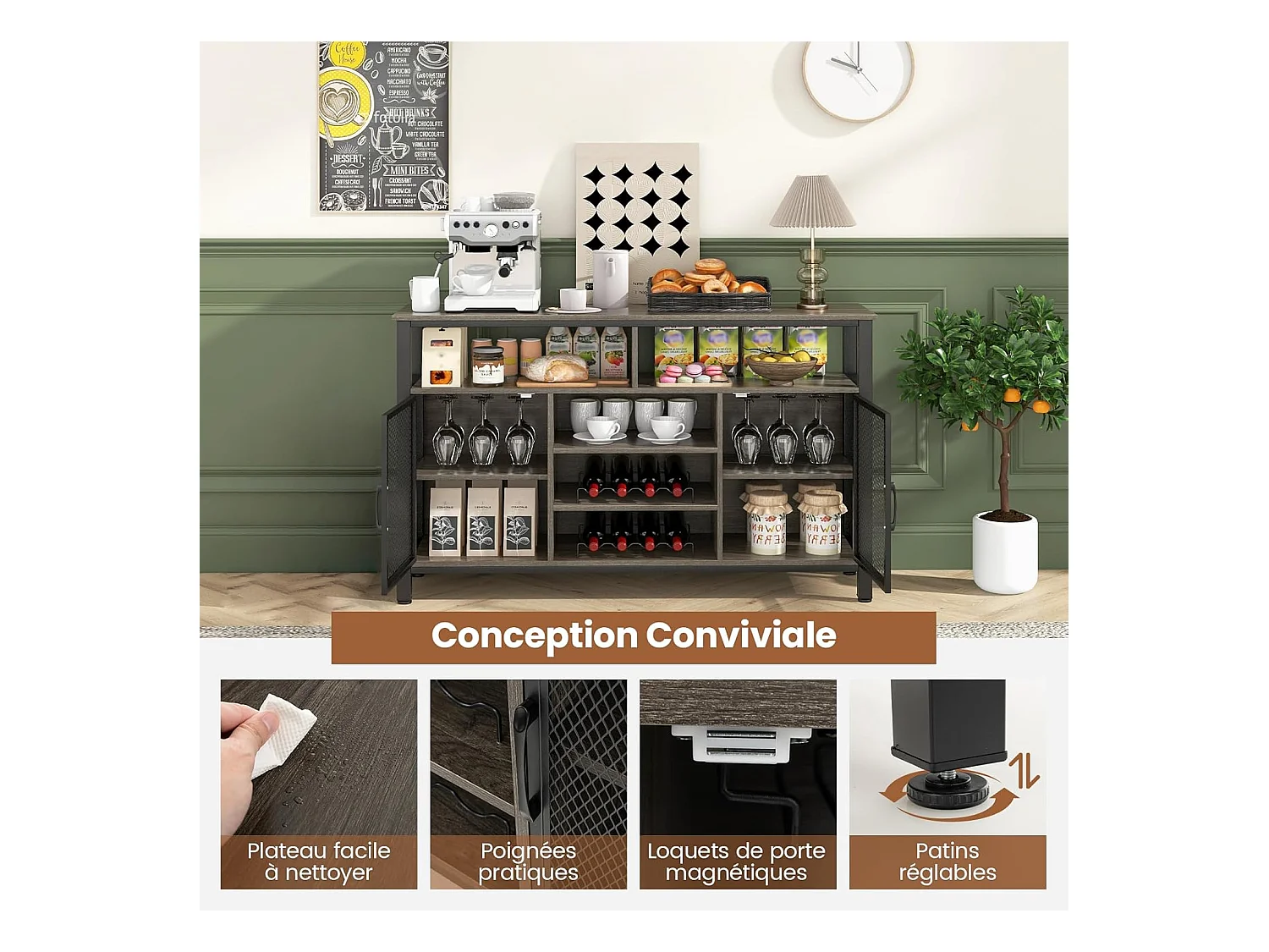 Buffet cuisine, meuble avec cassier à vin & étagères, armoire avec cadre métallique(gris)