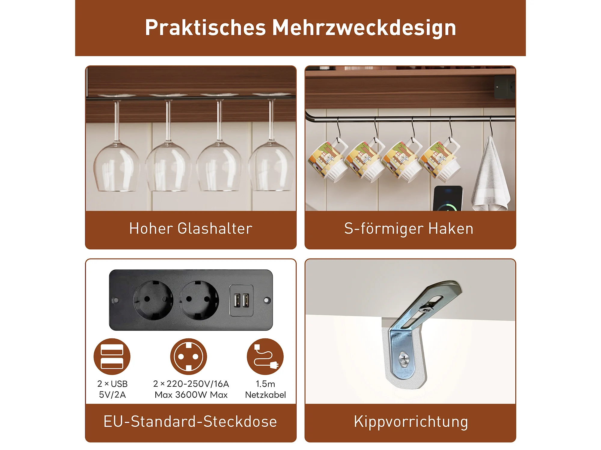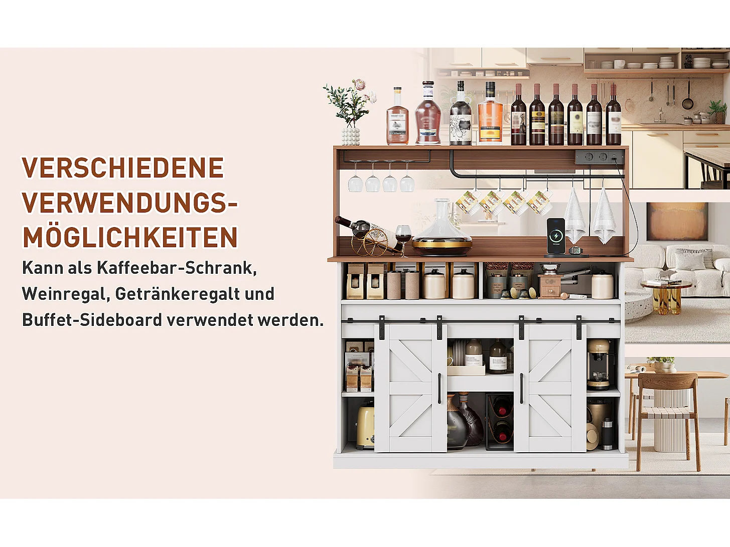 Buffet cuisine de style campagnard - 120 x 40 x 130 cm - avec porte-verres + prises + portes coulissantes - MDF - blanc + naturel