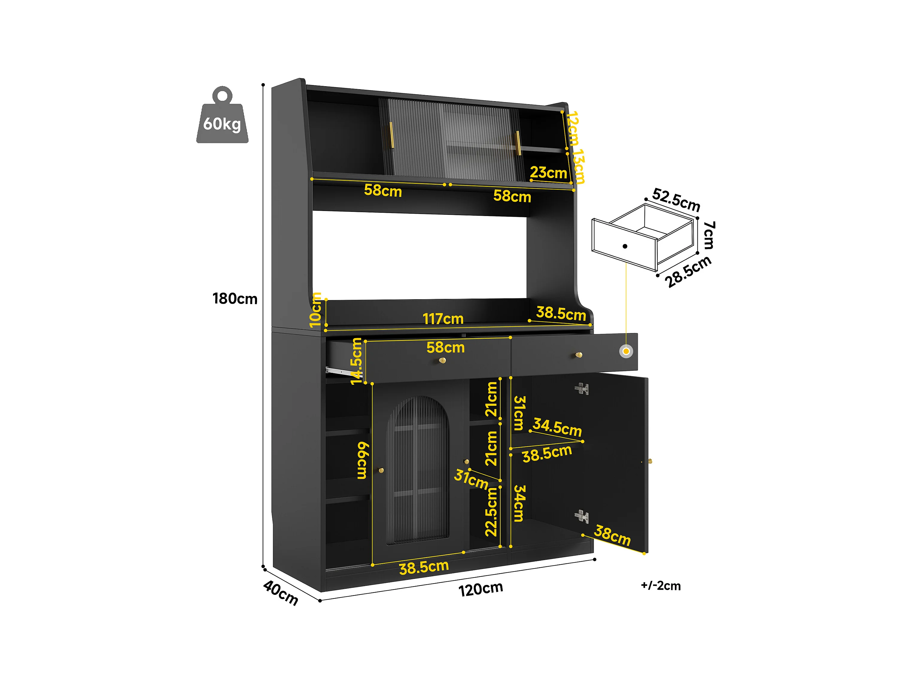 Buffet cuisine haut - 120 x 40 x 180 cm - avec étagères réglables + 2 tiroirs + 3 portes + Leds - MDF + PB - noir