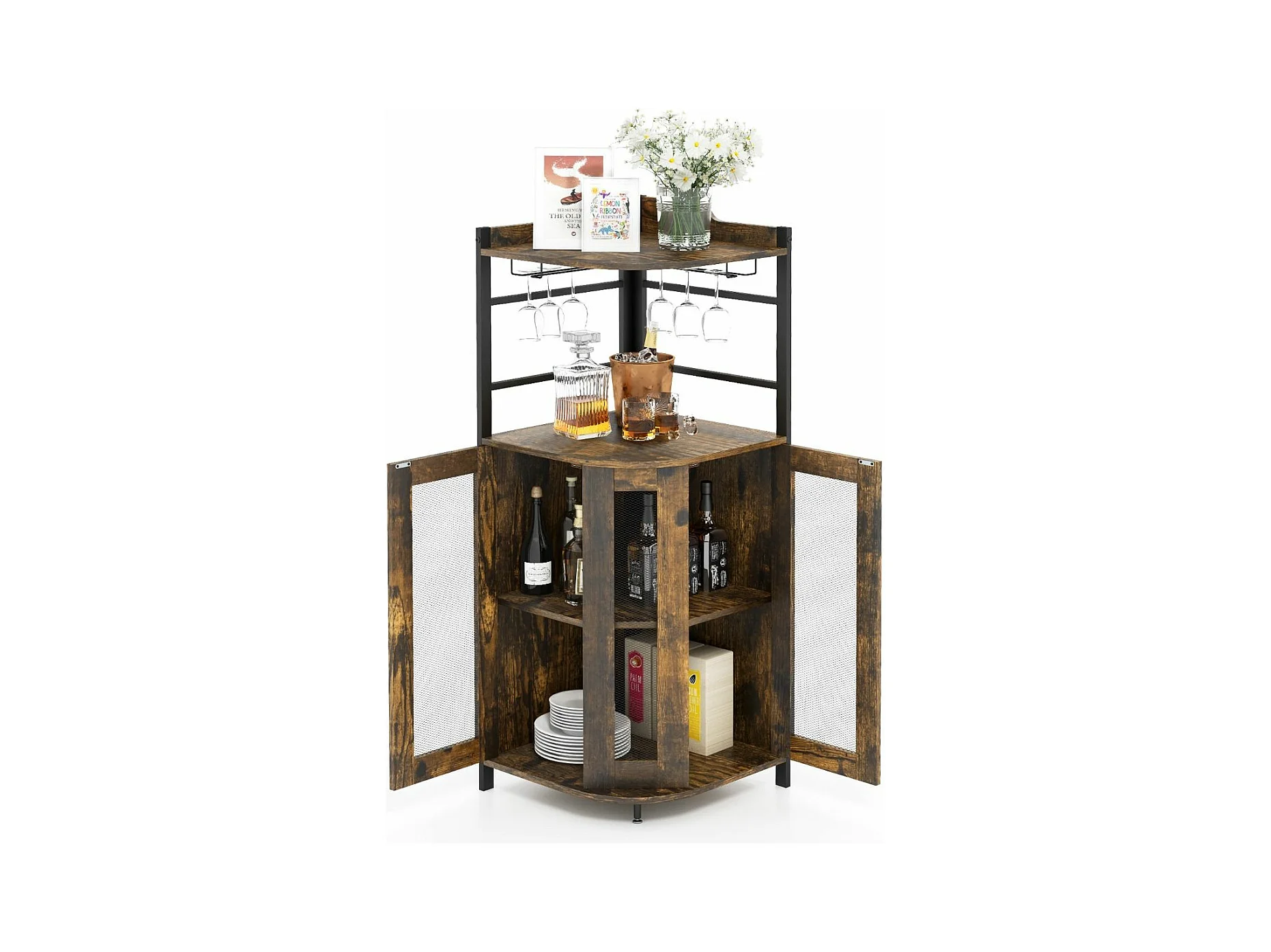 Buffet Cuisine Industriel, Armoire d’Angle, Étagère Réglable, Meuble Bar avec Porte-Verres, Placard à Porte en Maille Métallique, Kit Anti-basculement Inclus, 46 x 46 x 130 CM (Marron Rustique)