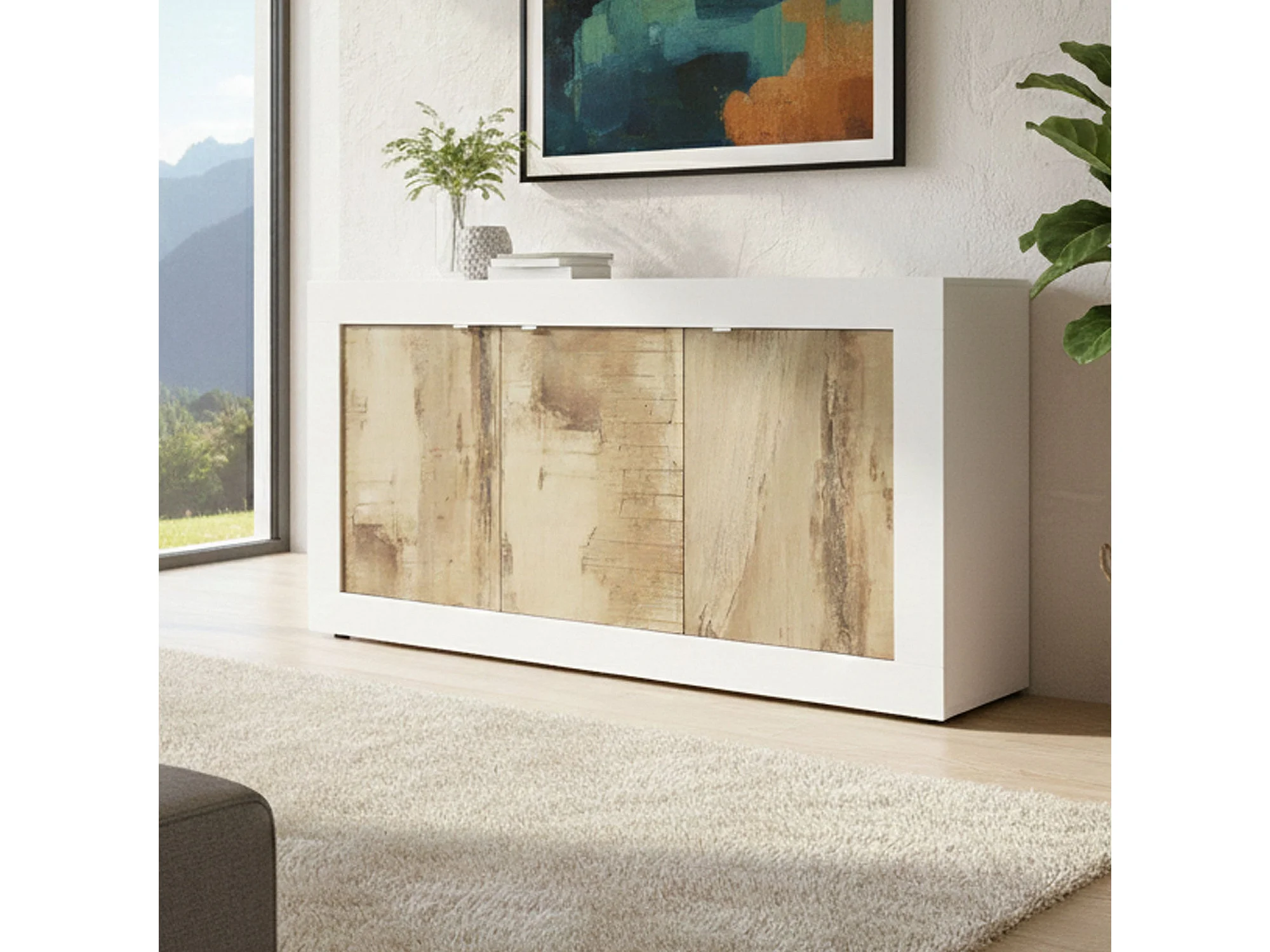 Buffet Dabat, Buffet du salon, Commode de salon, Garde-manger de cuisine, Made in Italy, 160x43 h86 cm, Blanc et Acacia