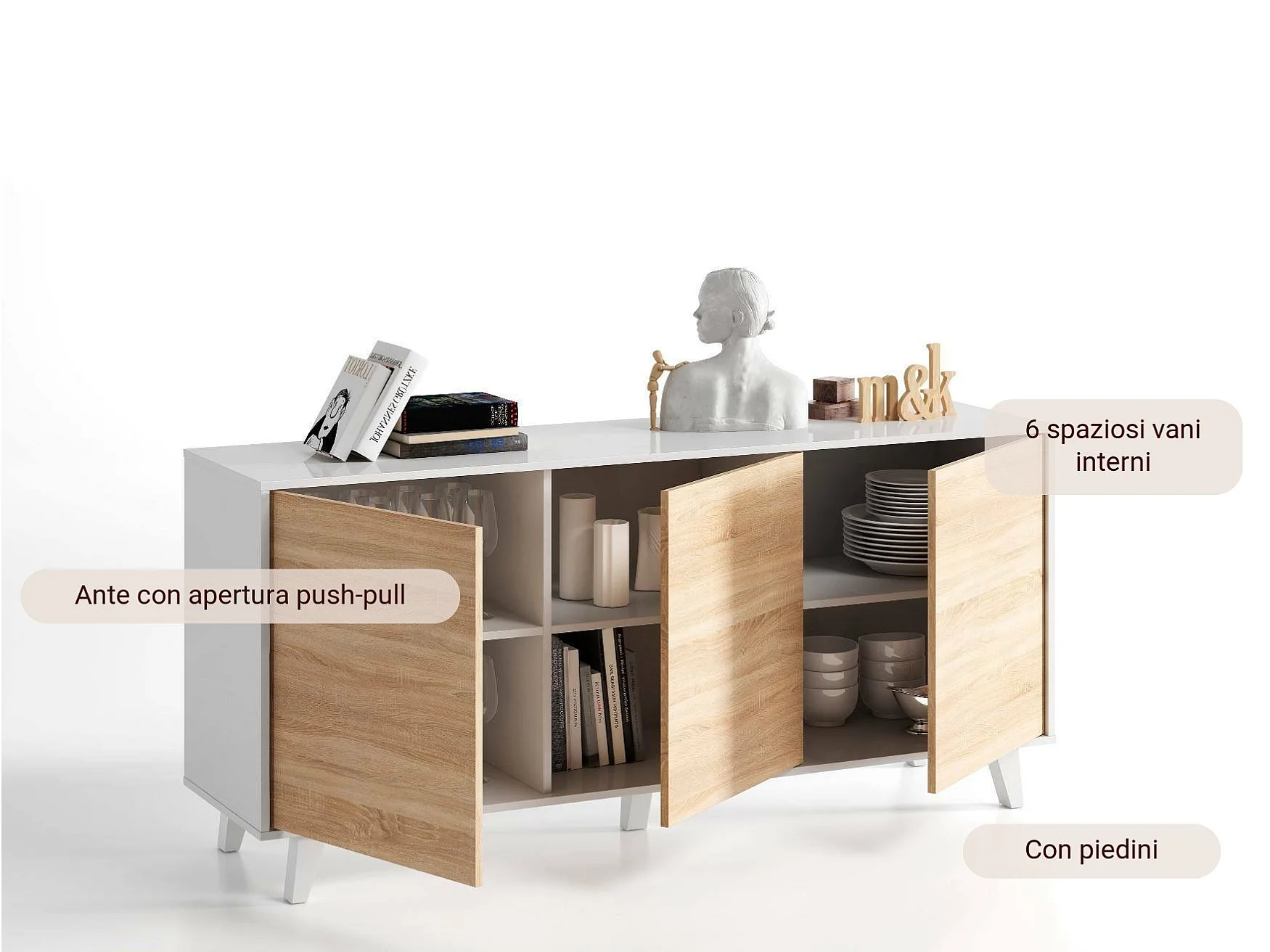 Buffet Dabello, Buffet de cuisine, Armoire design de salon, Buffet moderne avec 3 portes et étagères, 154x40h75 cm, Blanc et Chêne