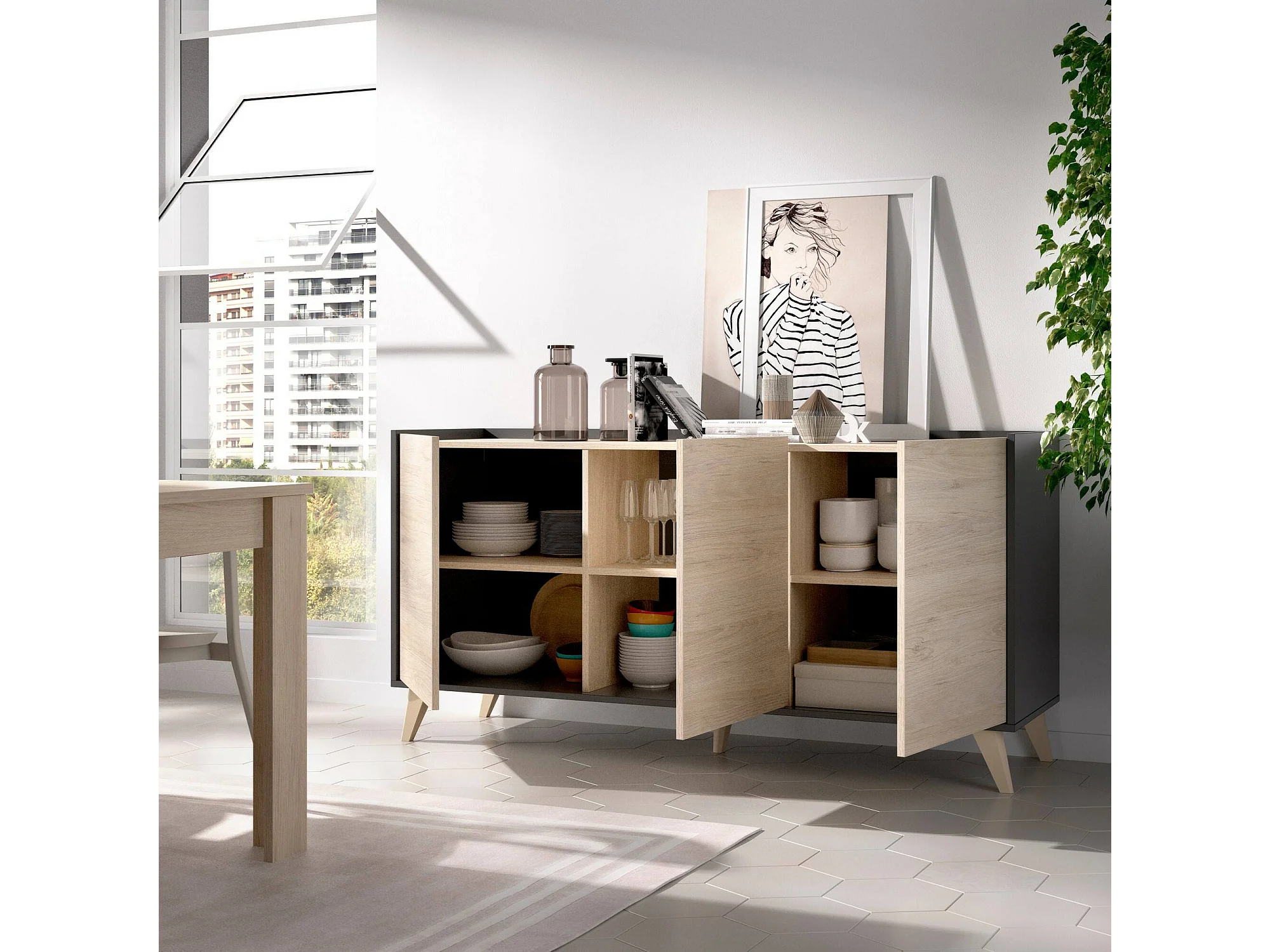 Buffet Dadop-vous, Buffet de salon, Buffet de salon moderne avec 3 portes, 155x43h75 cm, Chêne et Anthracite