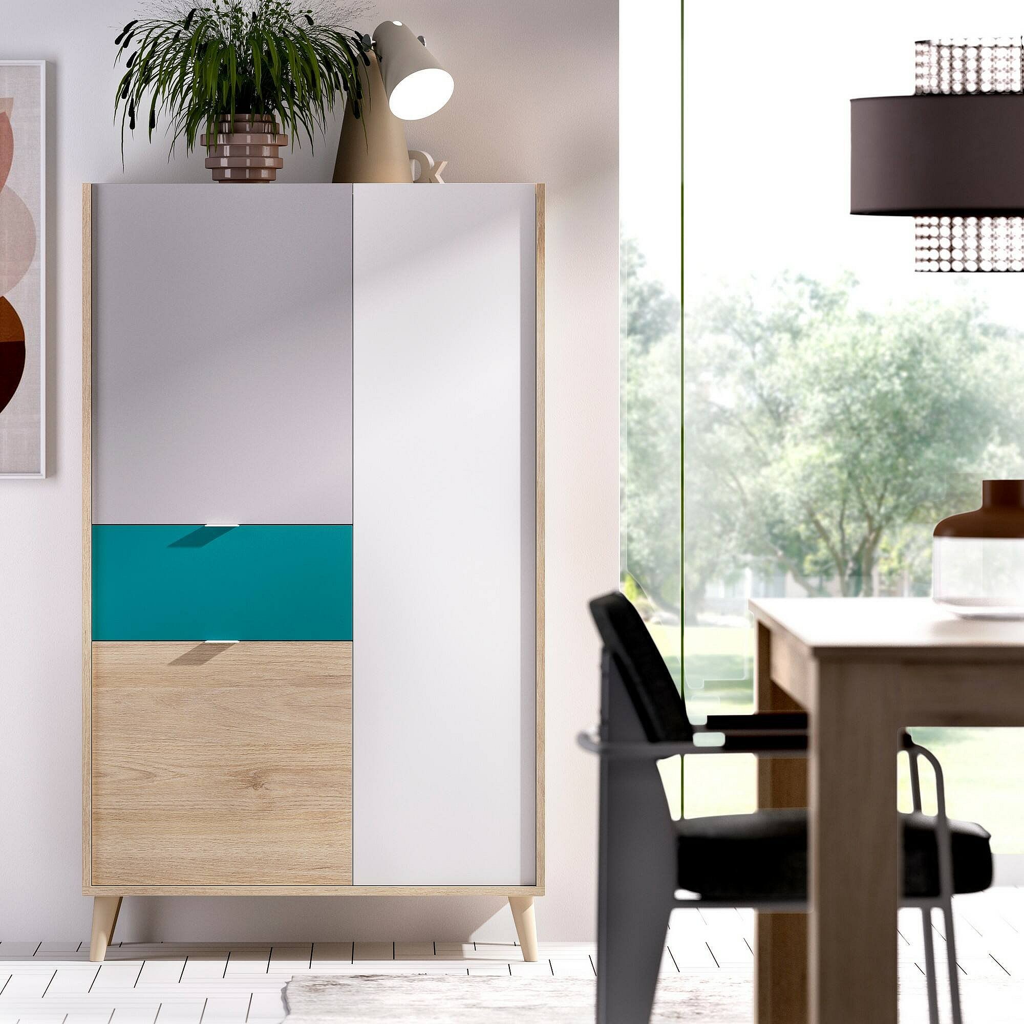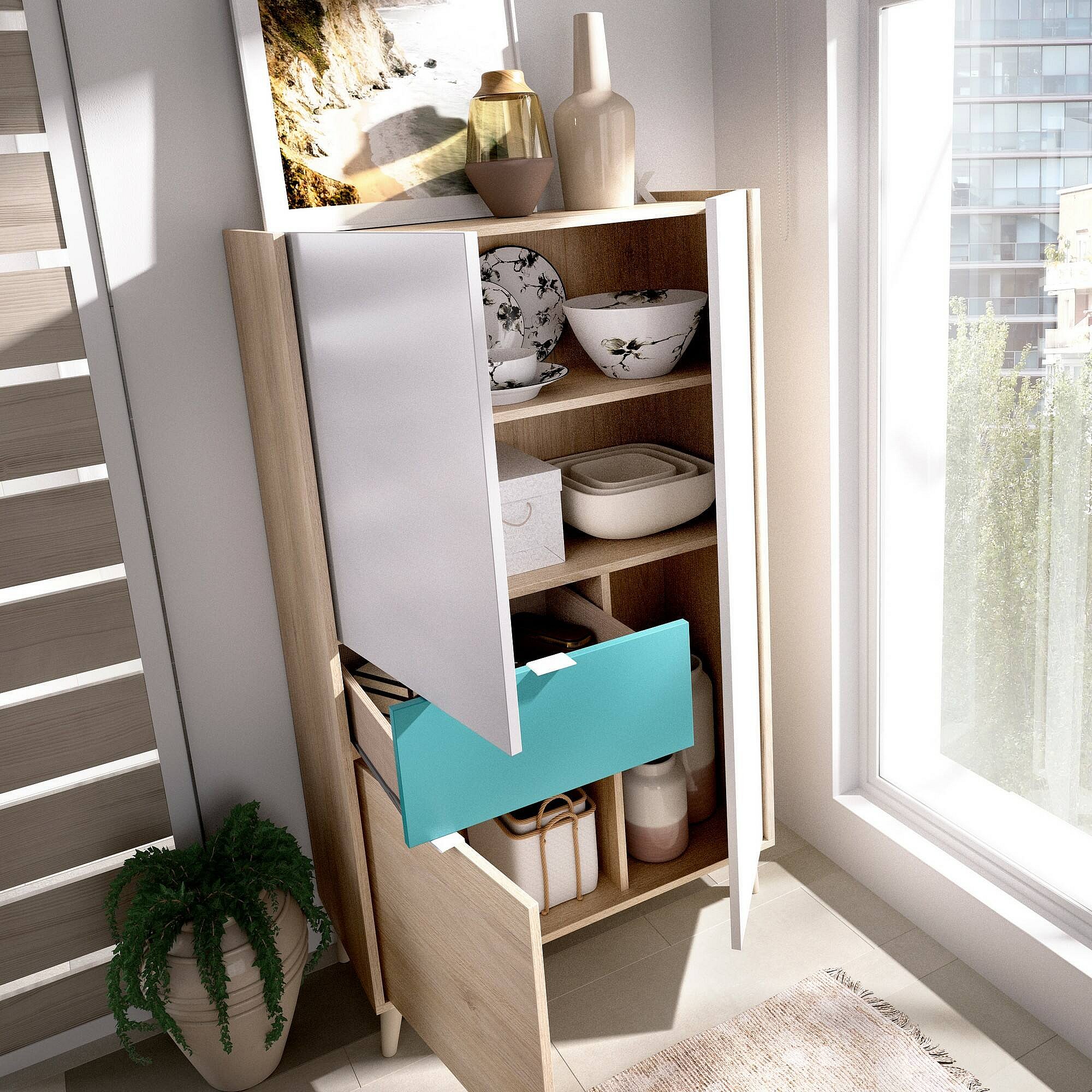 Buffet Dcelia, Buffet garde-manger de salon, Buffet de salon moderne avec 3 portes, 81x43h137 cm, Blanc et Chêne