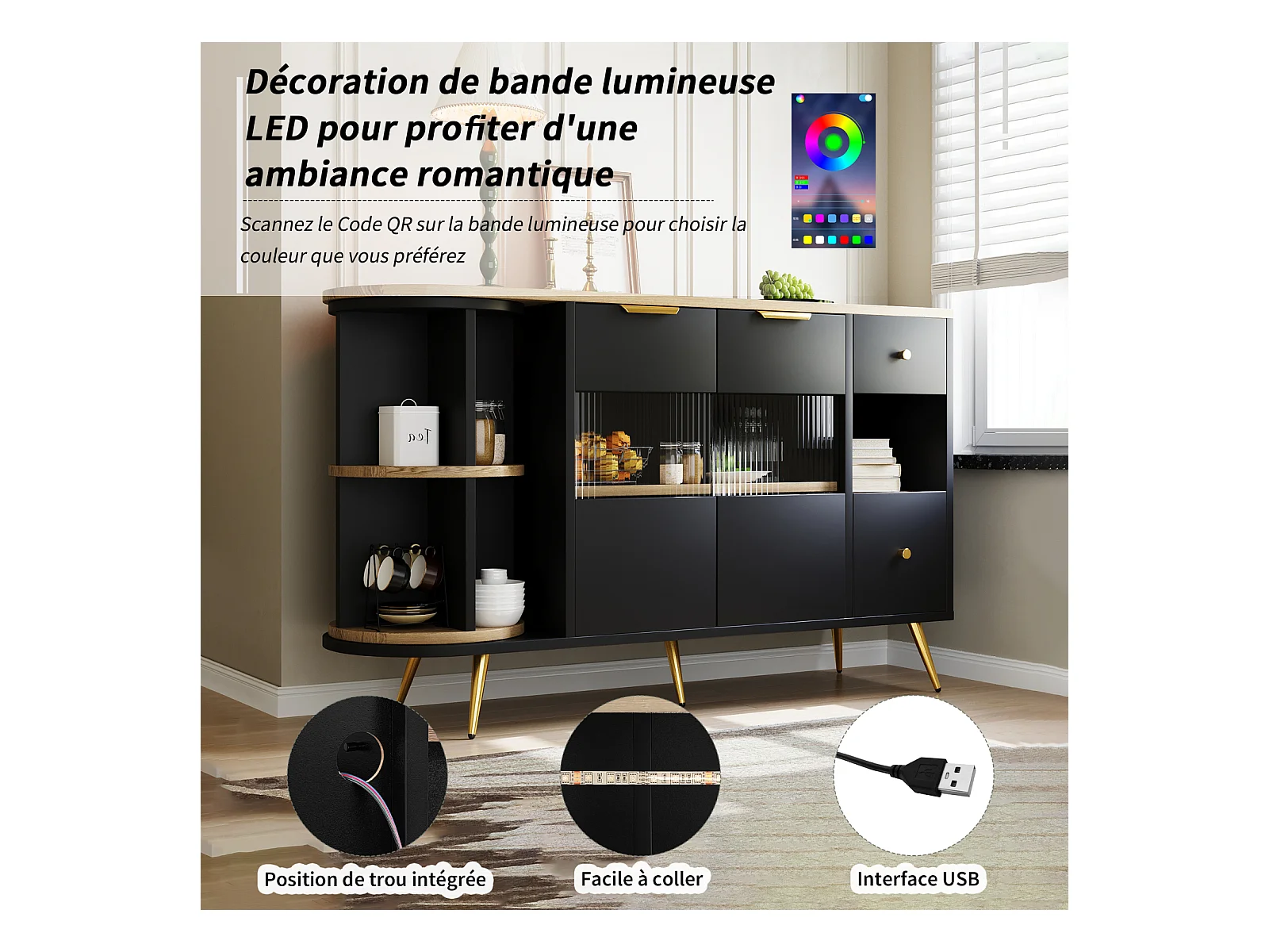 Buffet noir pour salle à manger et salon – Portes coulissantes en verre avec éclairage LED, buffet en bois autoportant, élégant et pratique