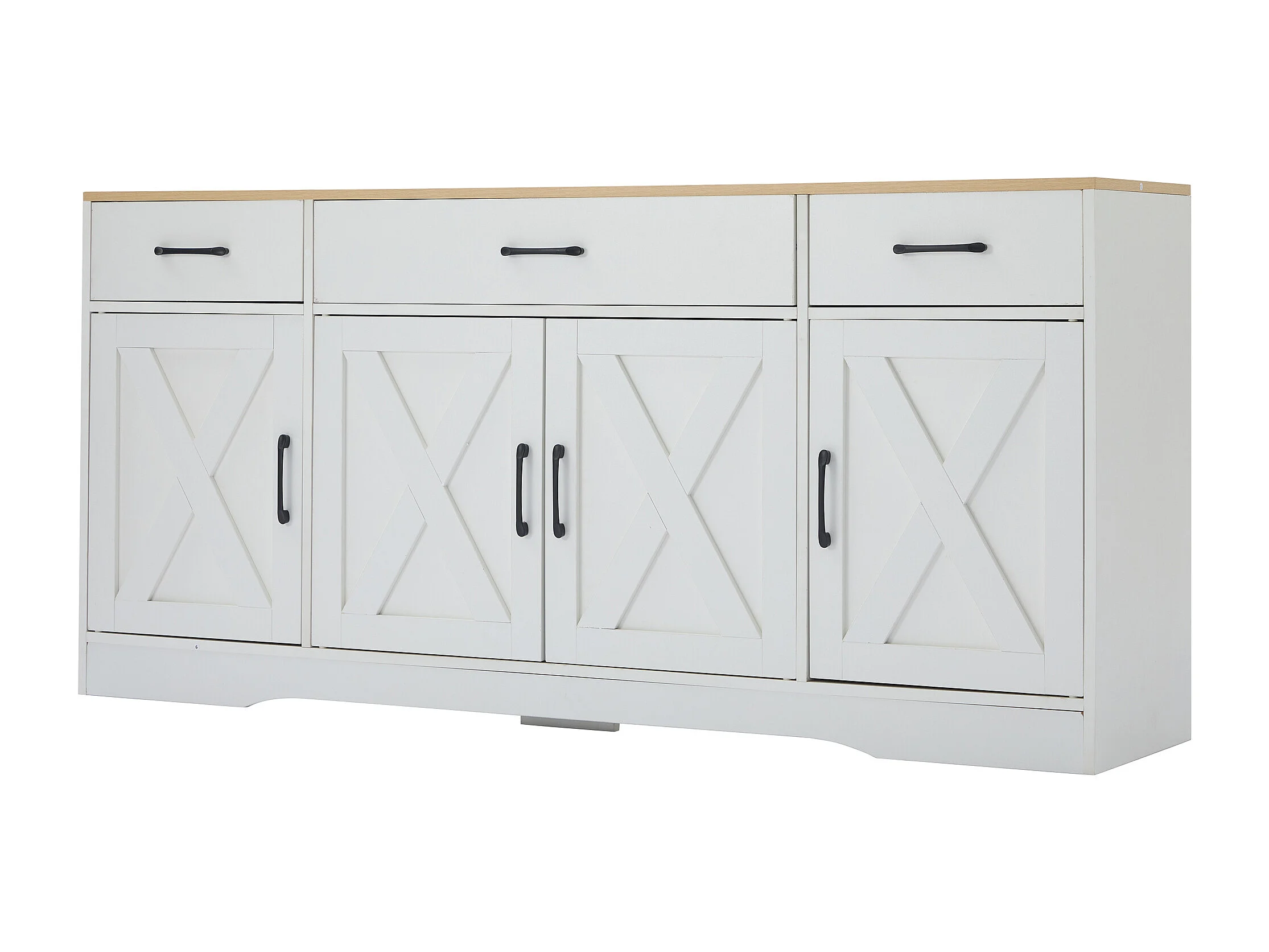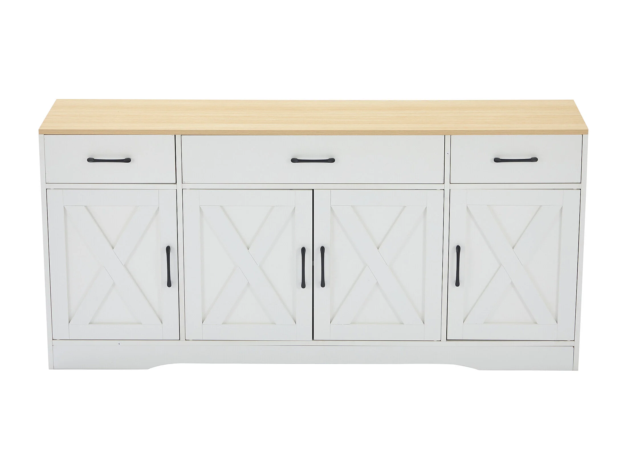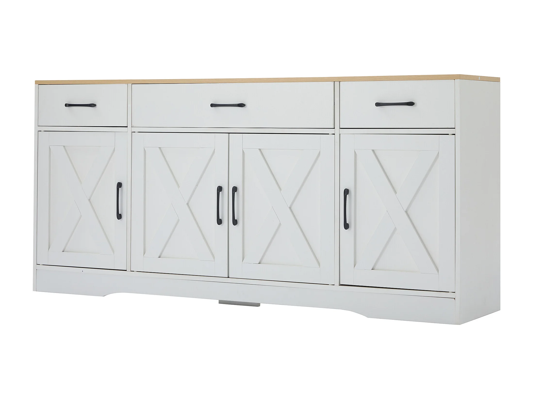 Buffet 160x37x75cm avec 4 portes et 3 tiroirs, blanc, plateau en finition bois naturel