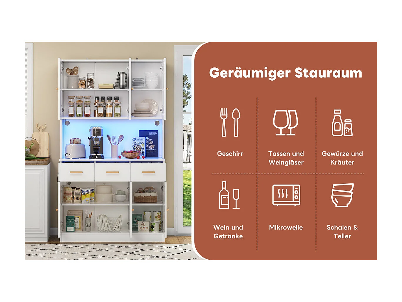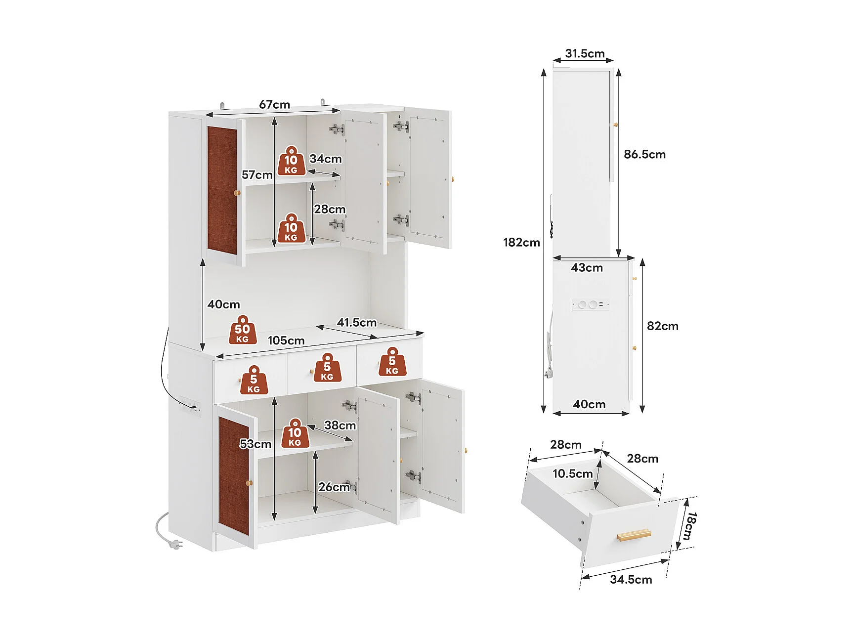 Buffet de cuisine 182 cm avec éclairage LED et prise électrique, blanc, portes en tissu, poignées en bois massif