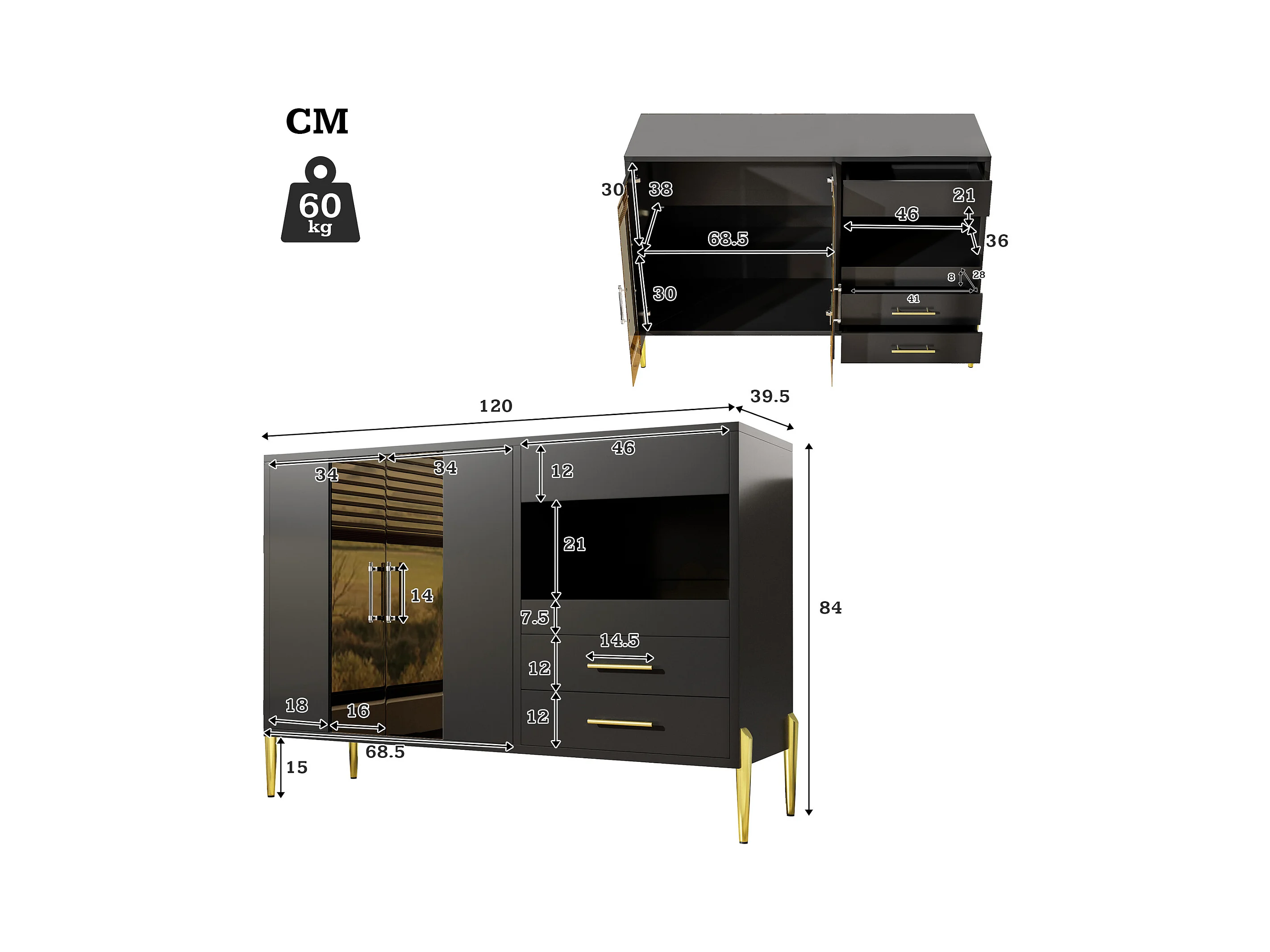 Buffet de cuisine avec 2 portes en verre et 3 tiroirs - 120 x 39.5 x 84 cm - MDF et pièds en métal doré - Noir