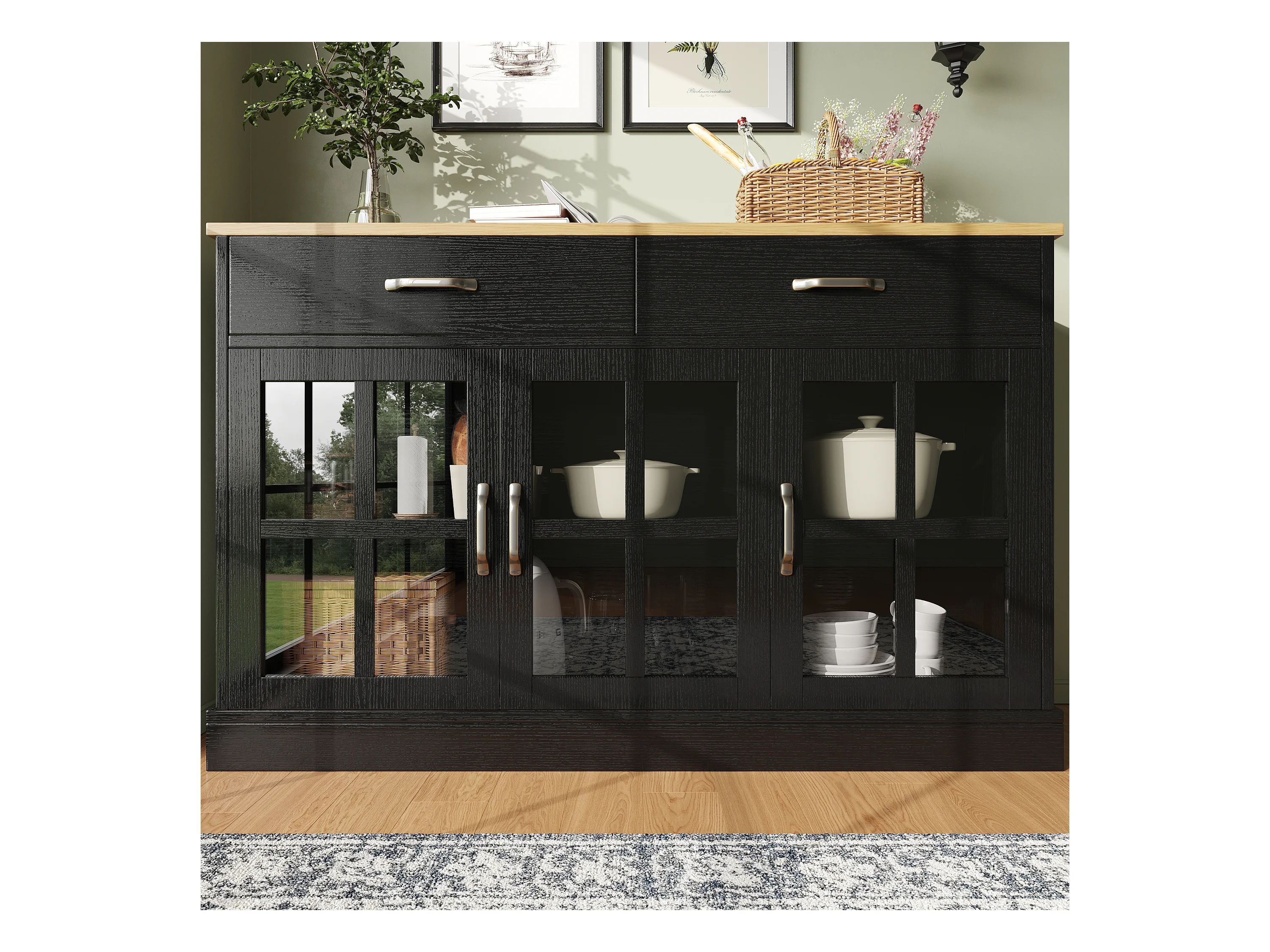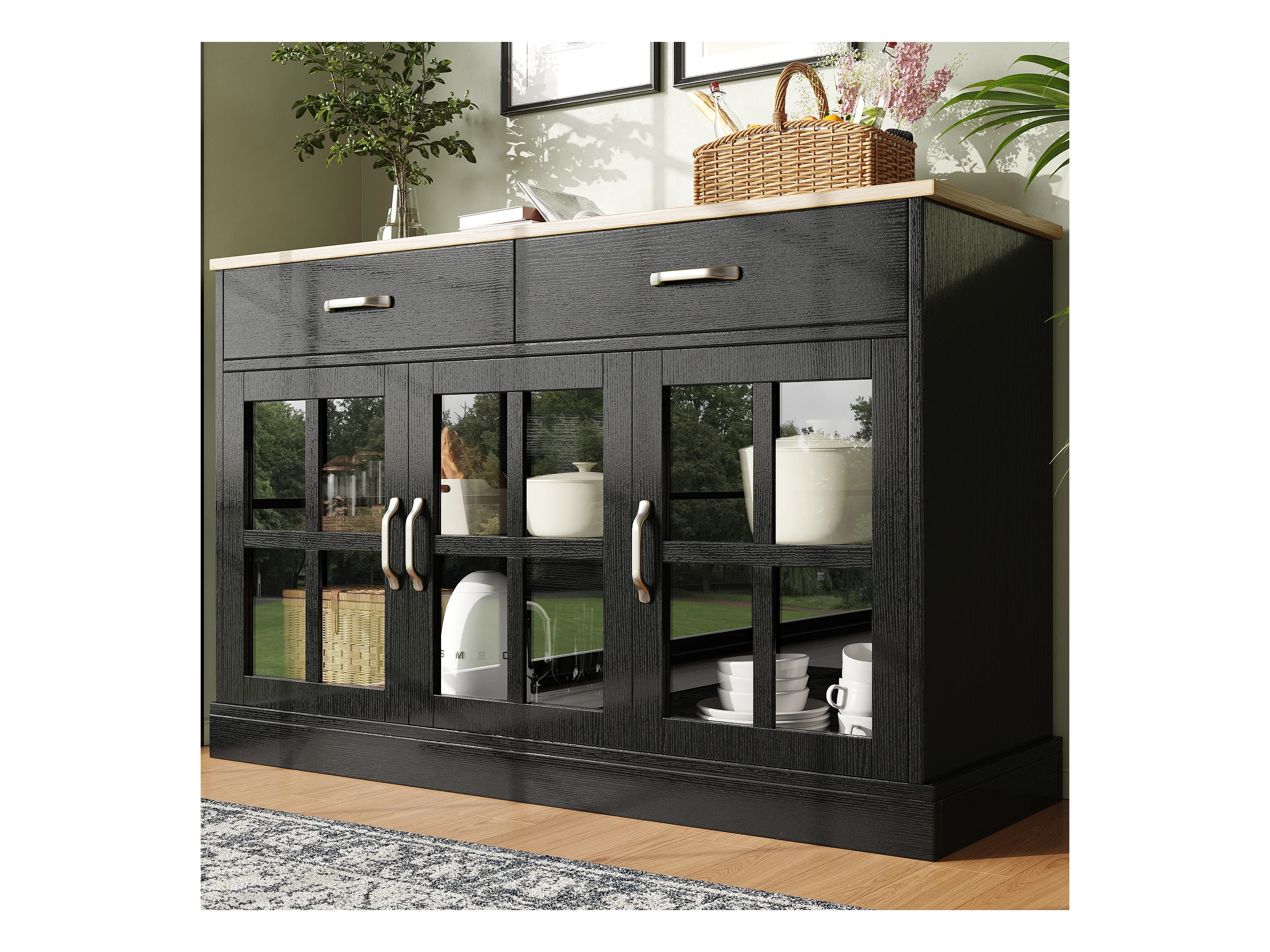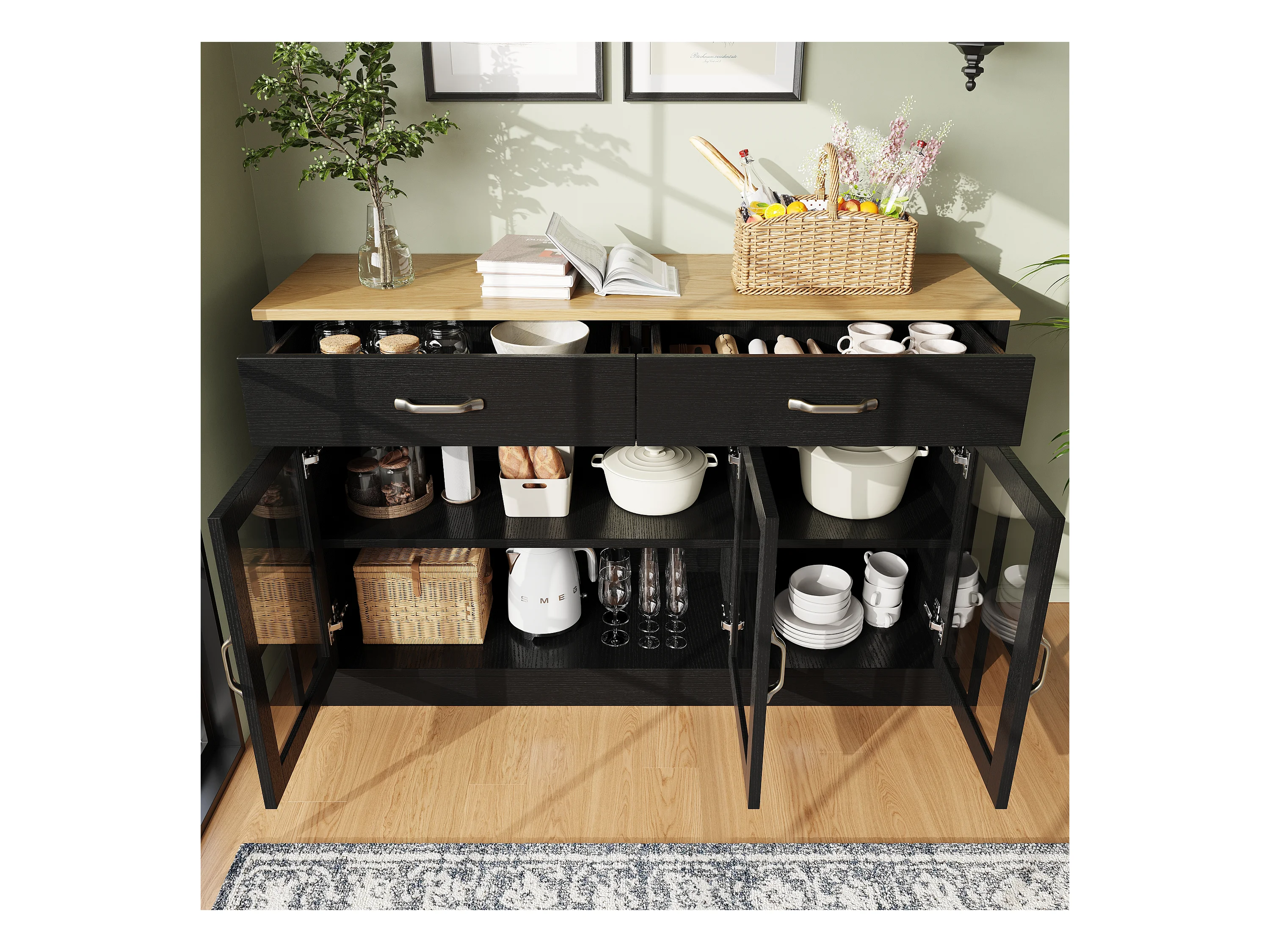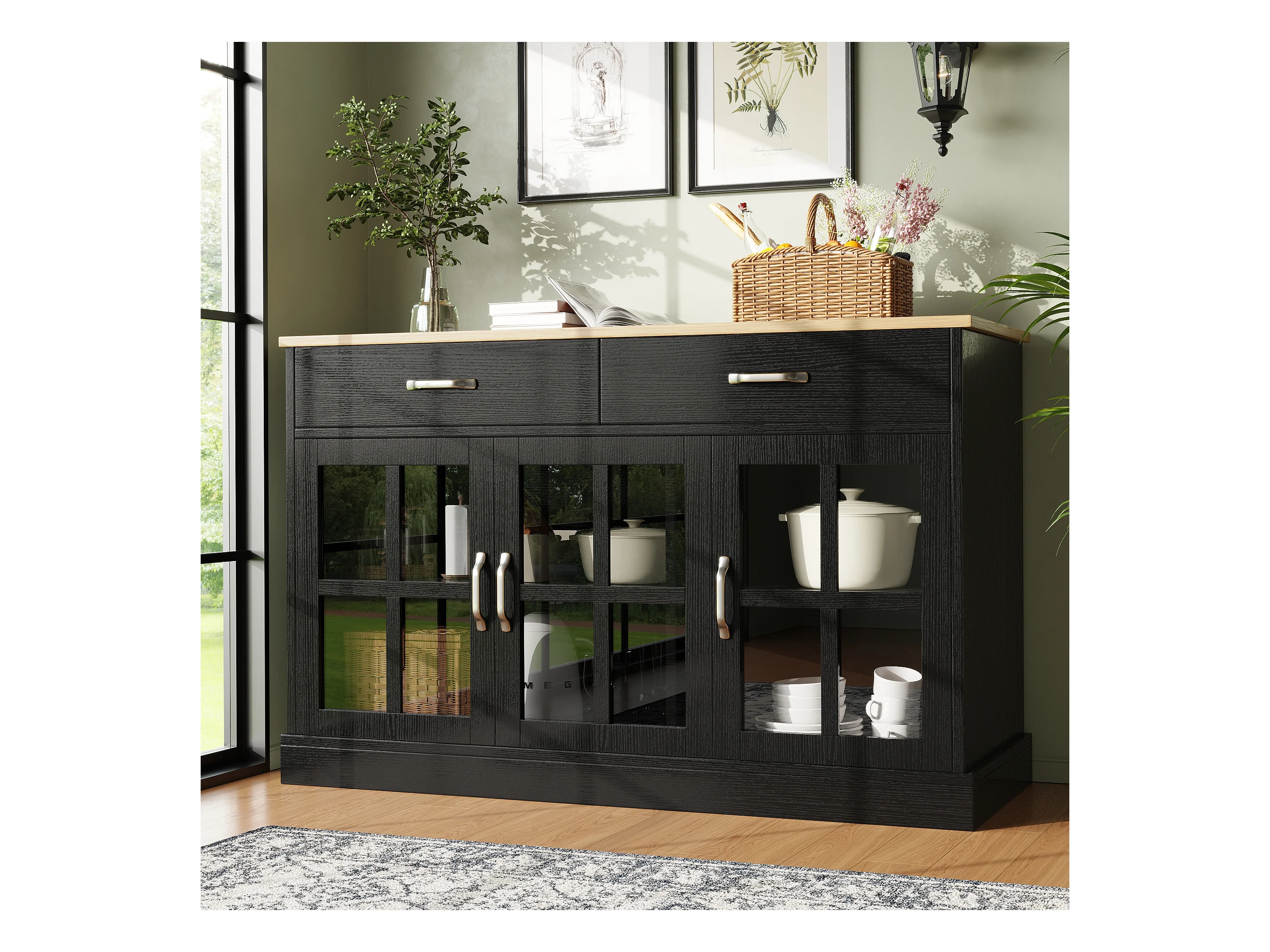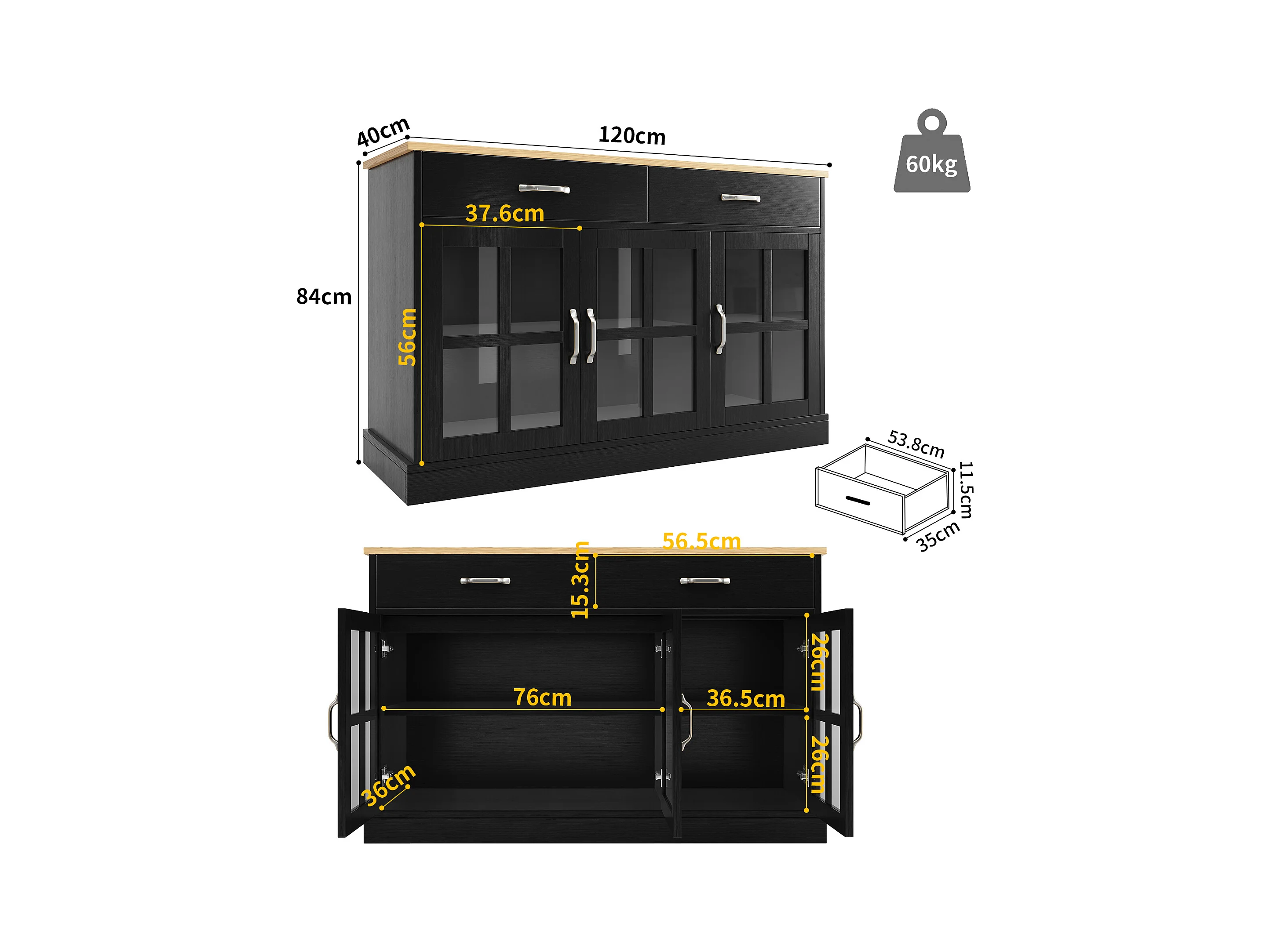 Buffet de cuisine avec 2 tiroirs et 3 portes en verre - 120 x 40 x 84 cm - Bois MDF - Noir + naturel