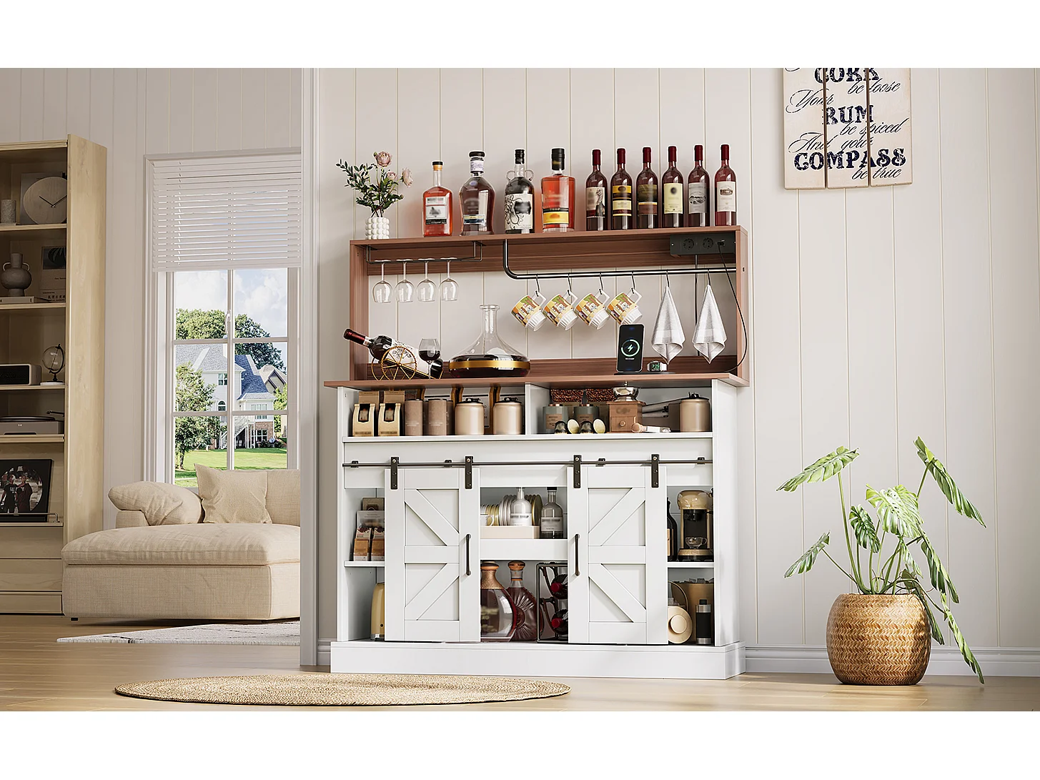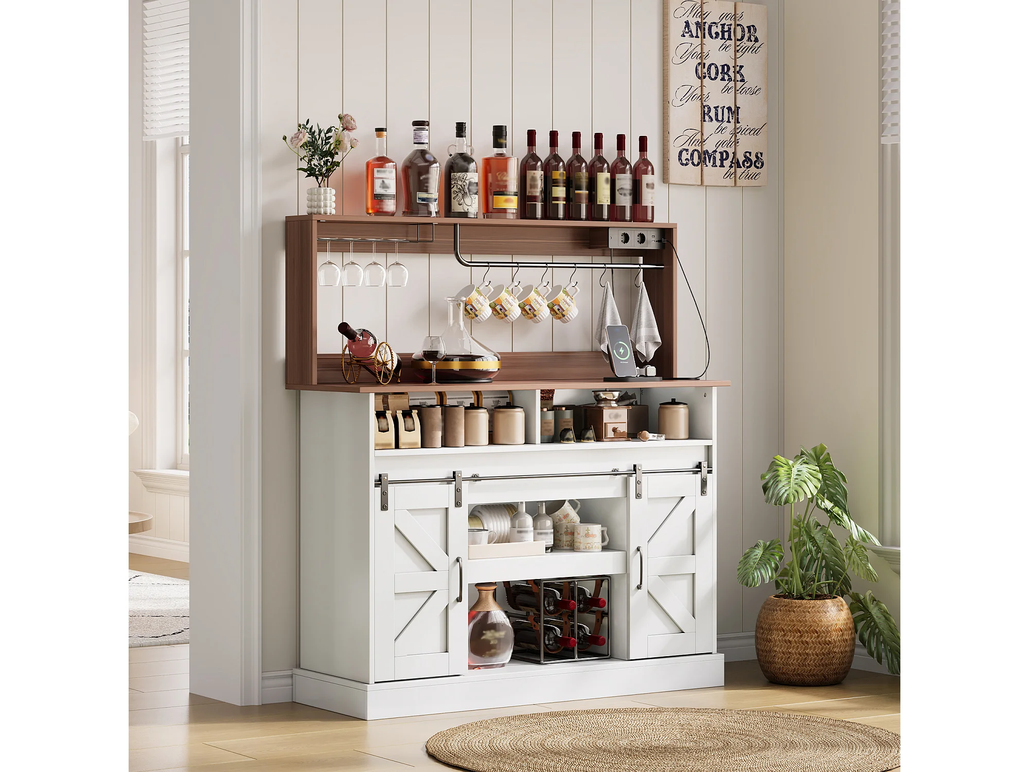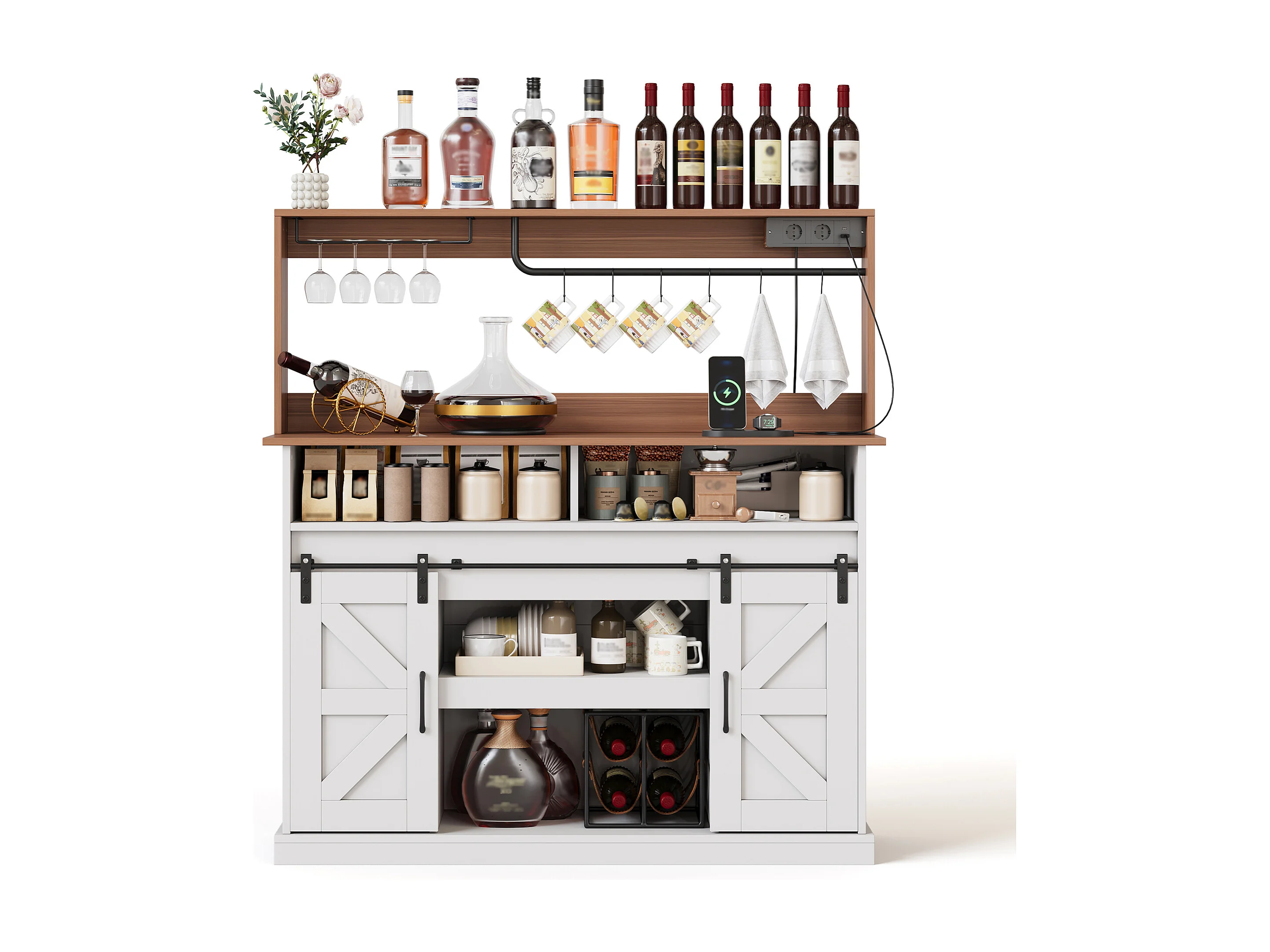 Buffet de cuisine avec portes coulissantes et prises - Couleur blanc et bois