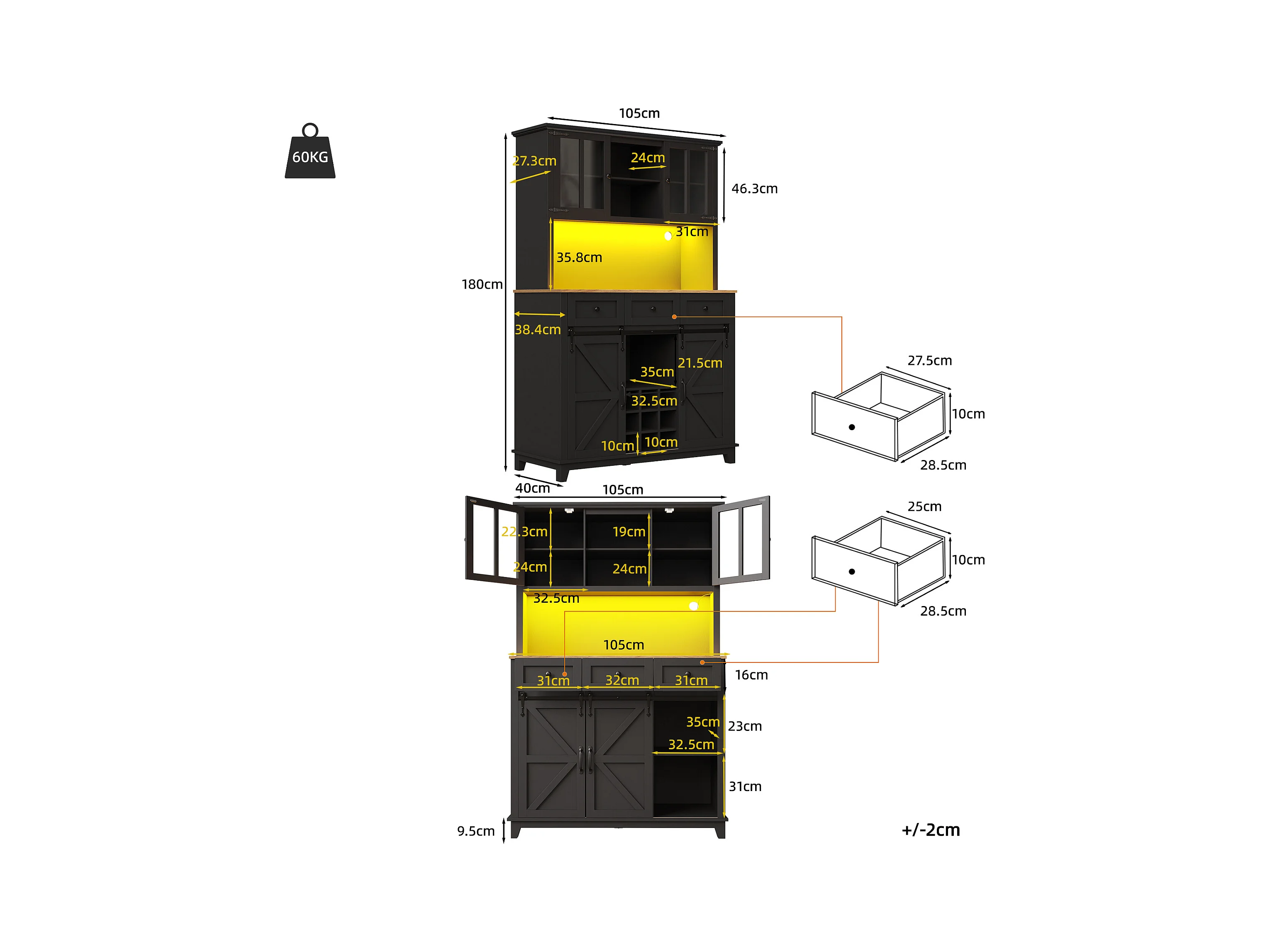 Buffet de cuisine haut - 105 x 40 x 180 cm - avec étagères réglables + Leds + 4 portes + 3 tiroirs - Métal + MDF - noir