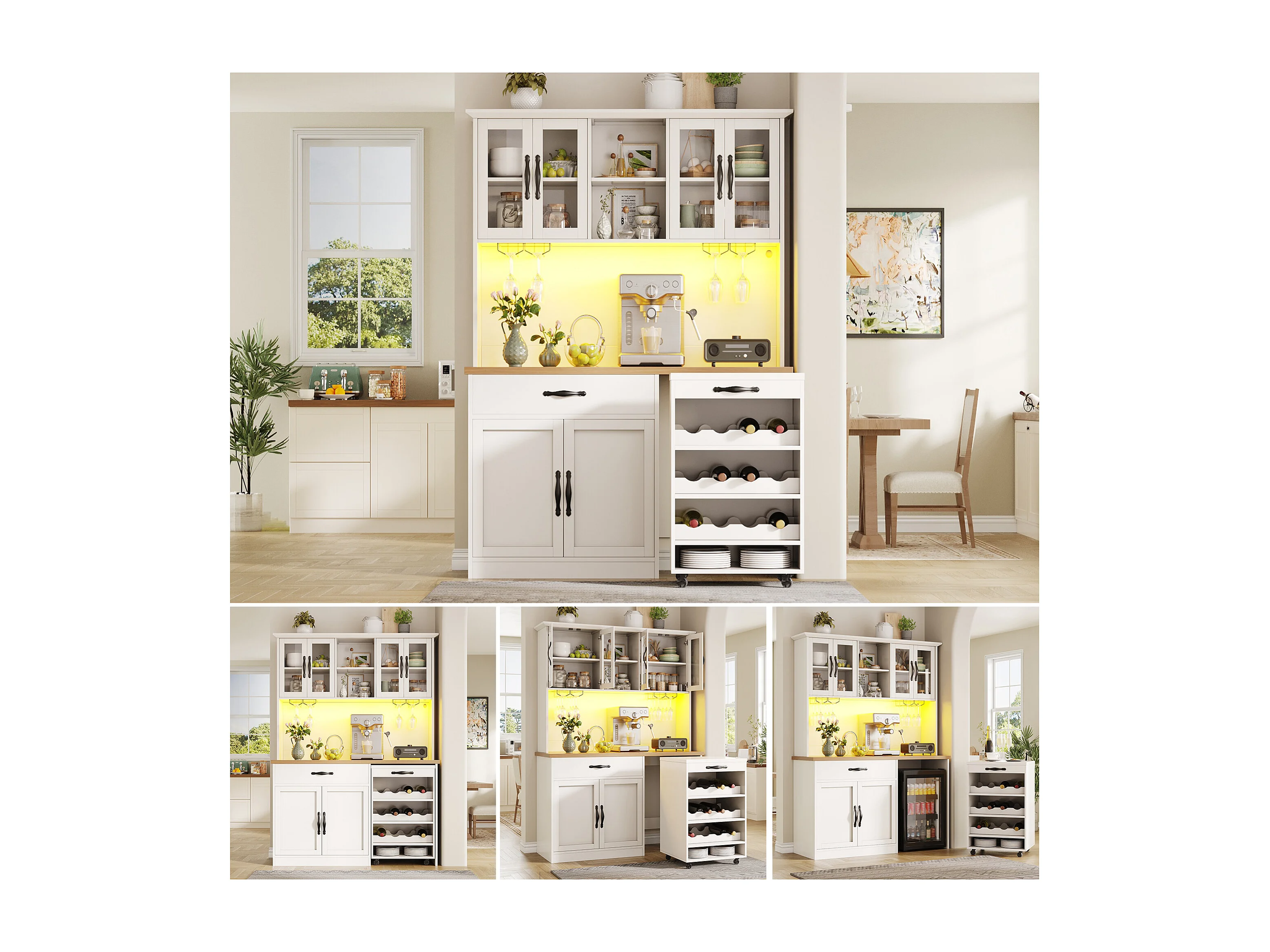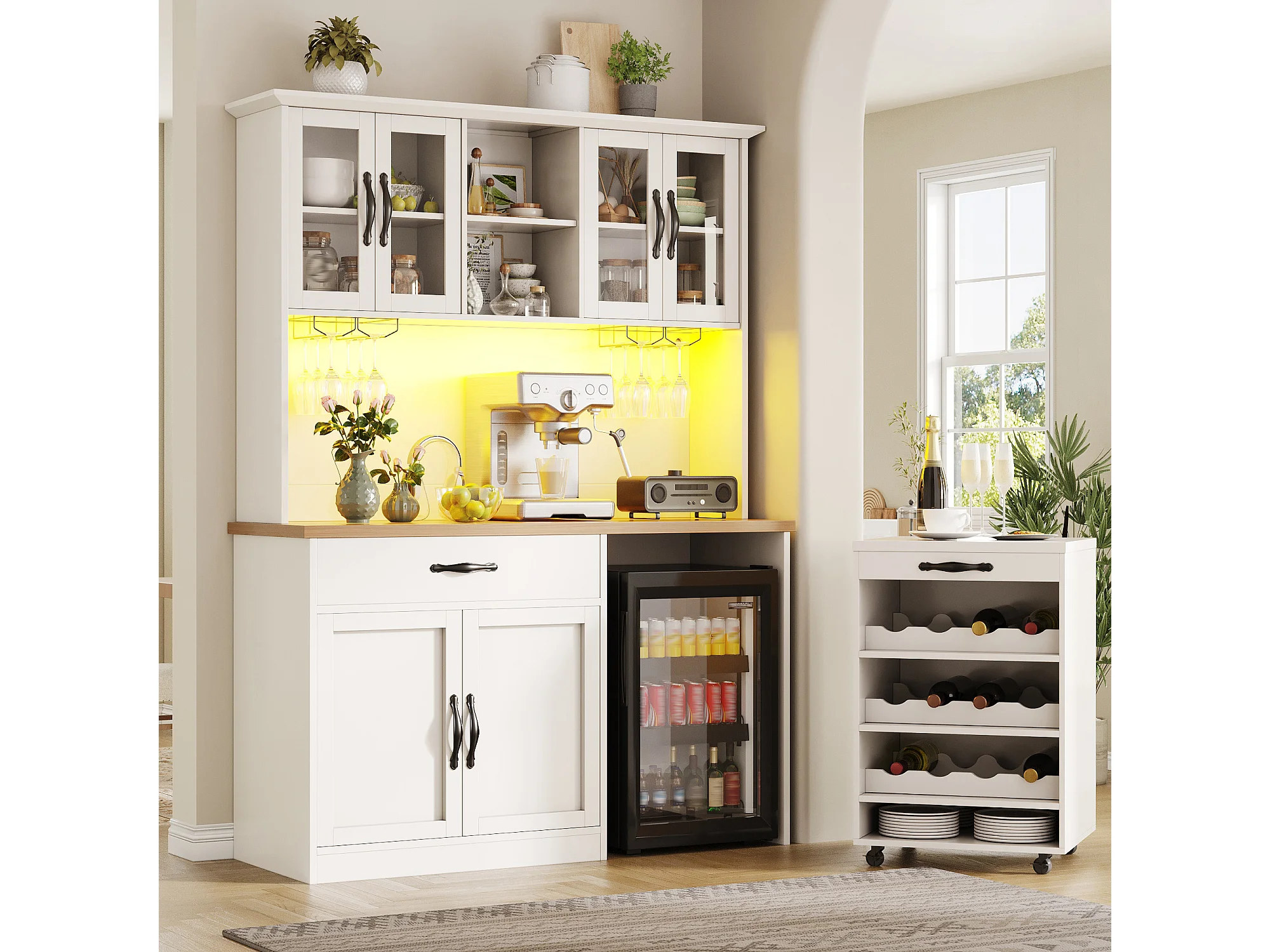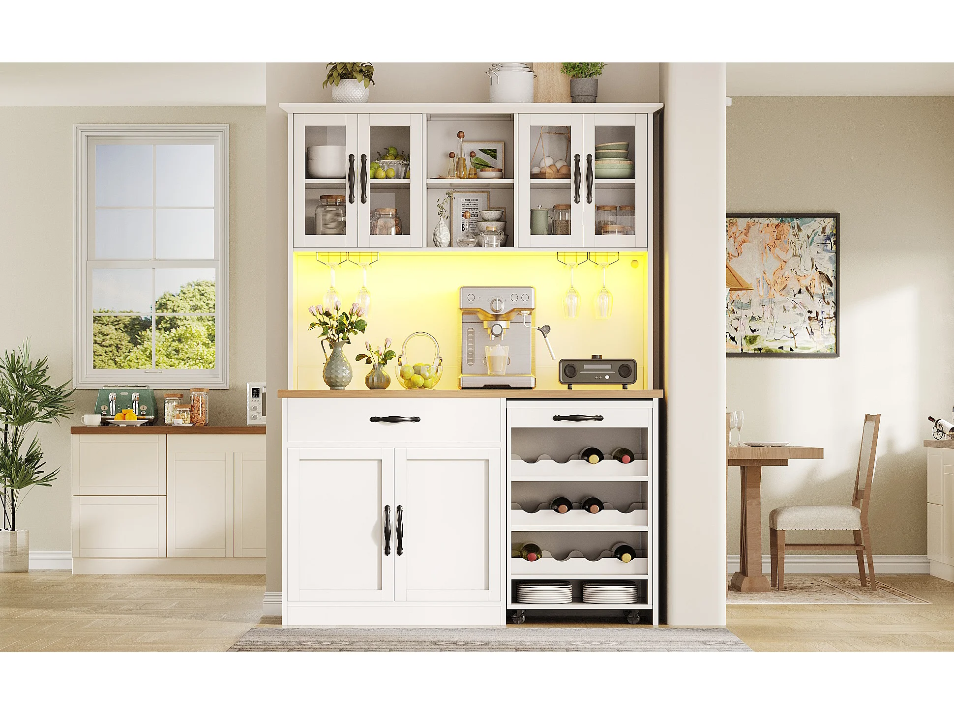 Buffet de cuisine haute - 140 x 38 x 180 cm - avec tiroir + portes + Leds + chariot à roulettes - MDF - blanc