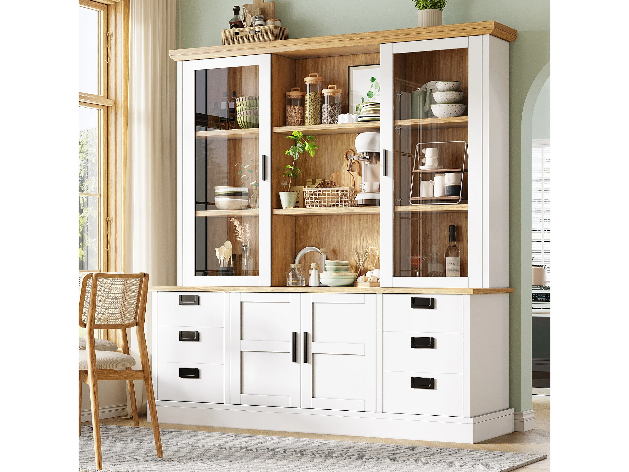 Buffet de cuisine haute - 140 x 40 x 185 cm - avec 6 tiroirs + portes vitrées + étagères - MDF - blanc