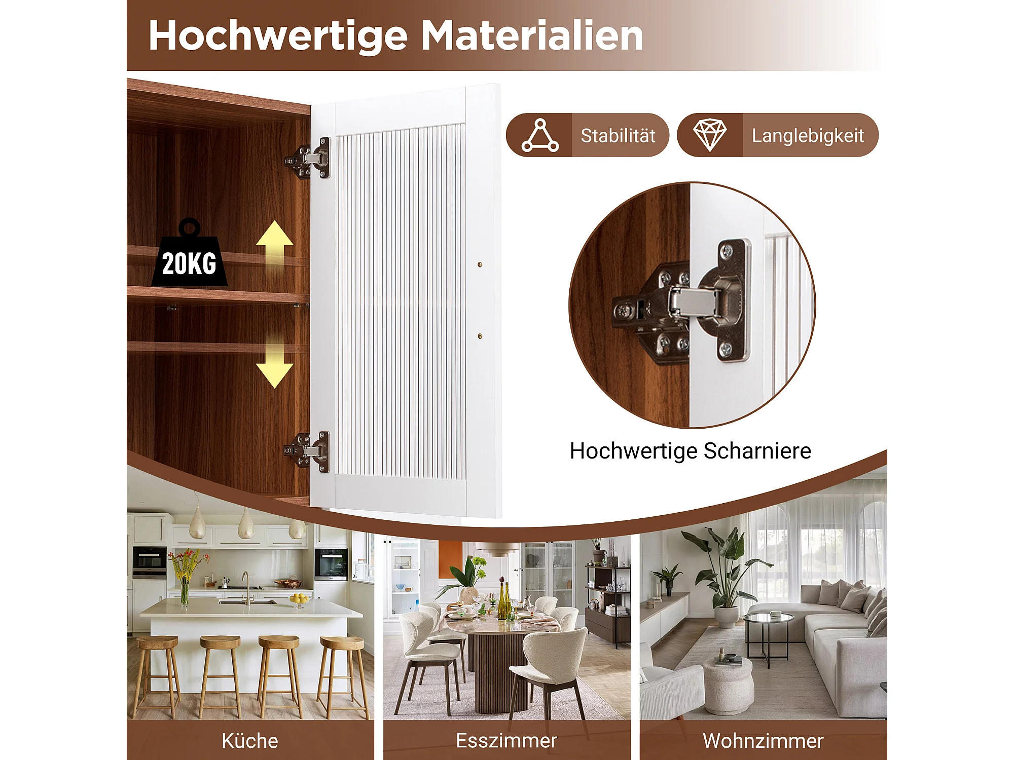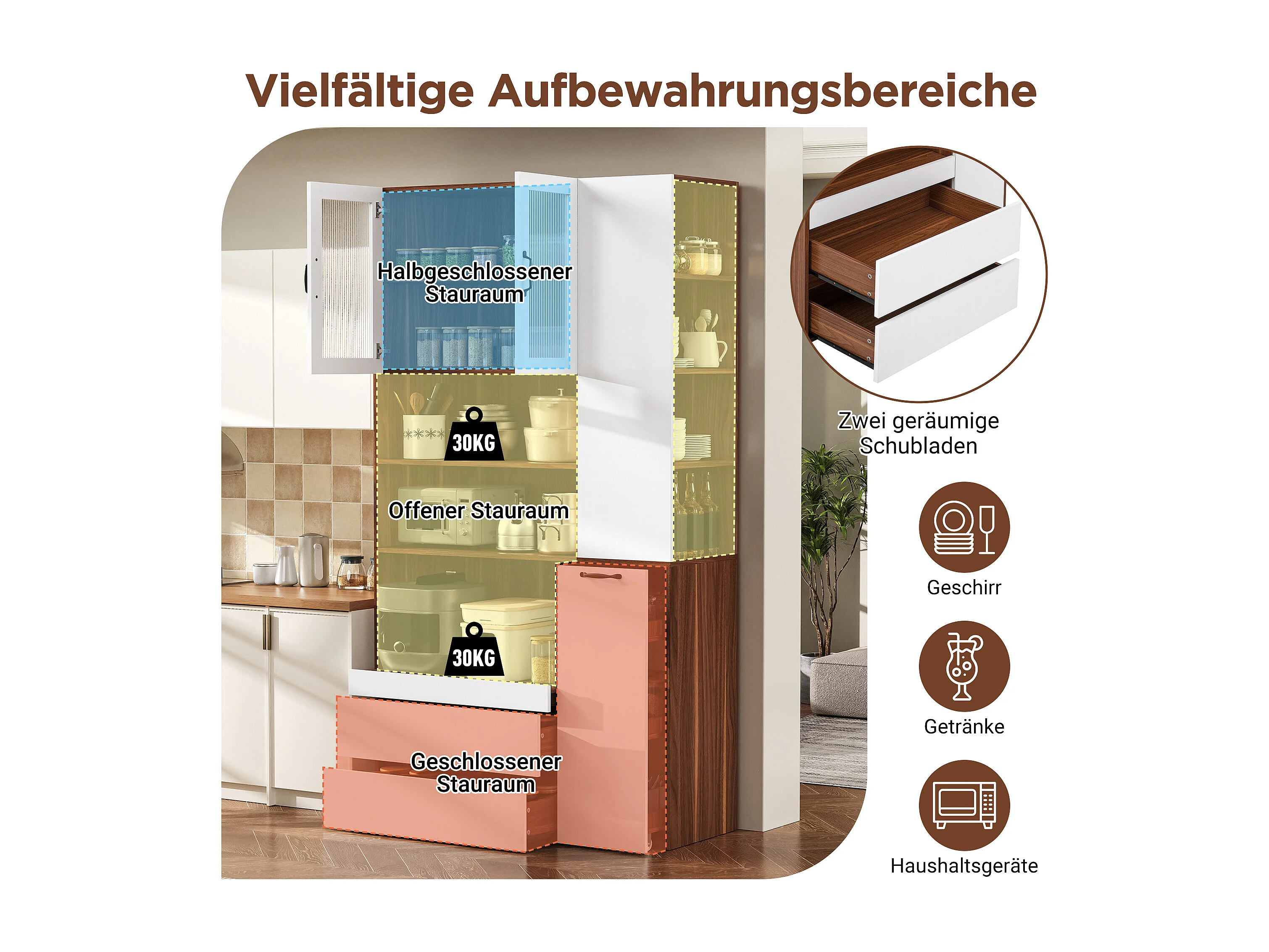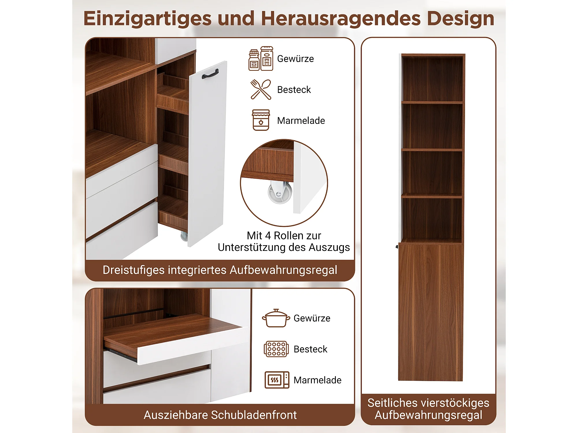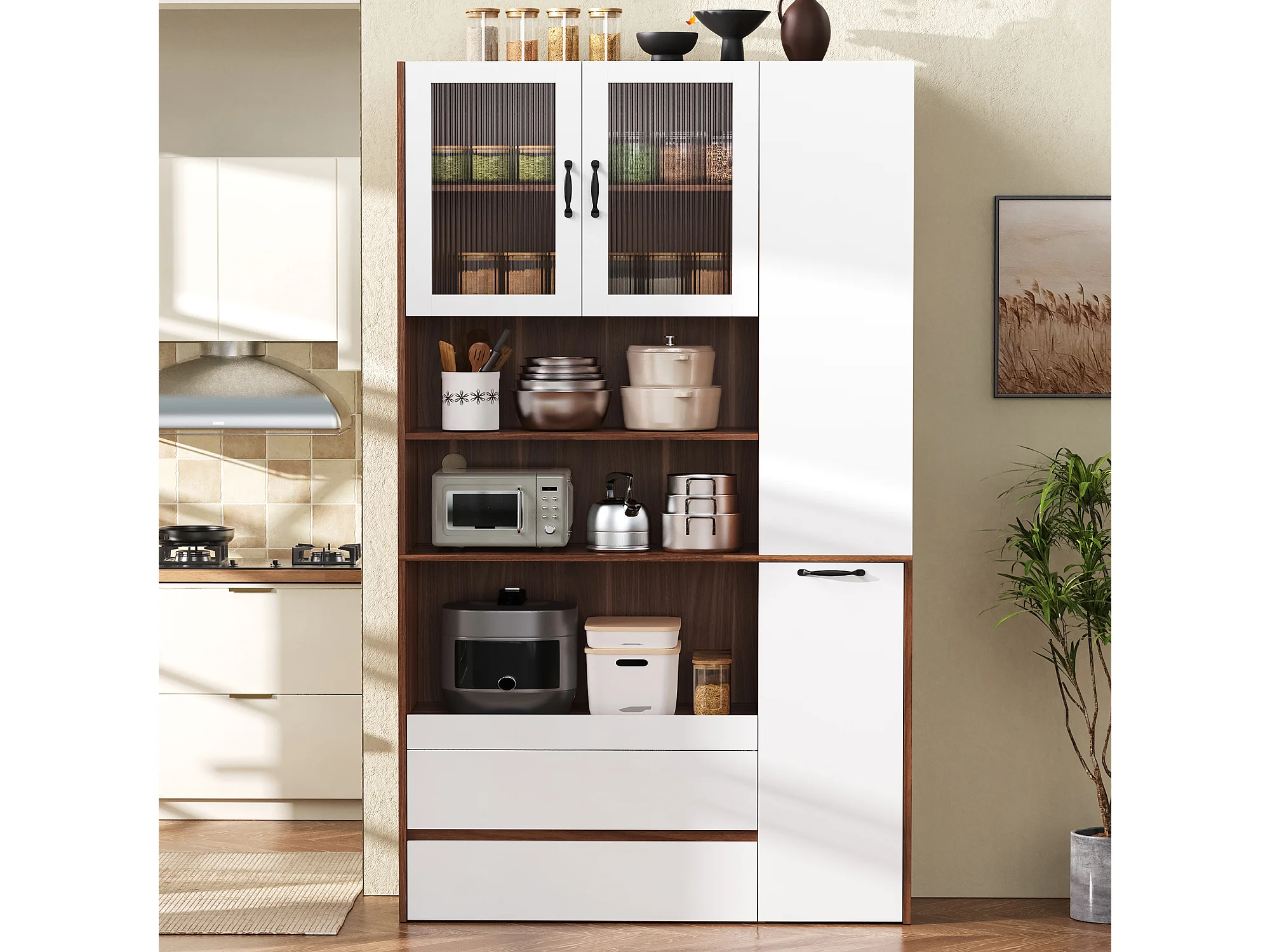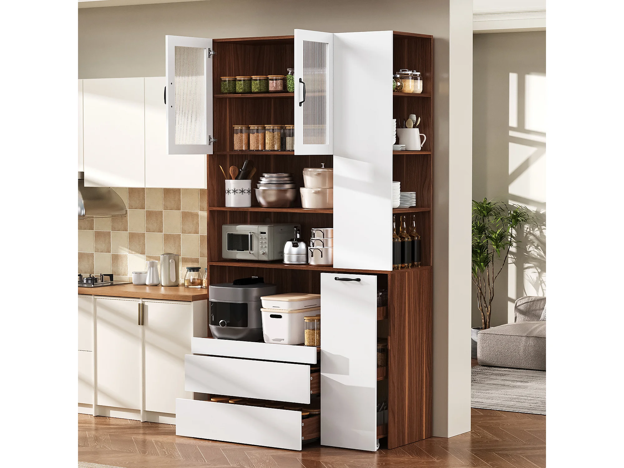 Buffet de cuisine moderne 100x40x200cm - avec tiroirs et étagères réglables - verre rayé - Blanc + Couleur bois de noyer