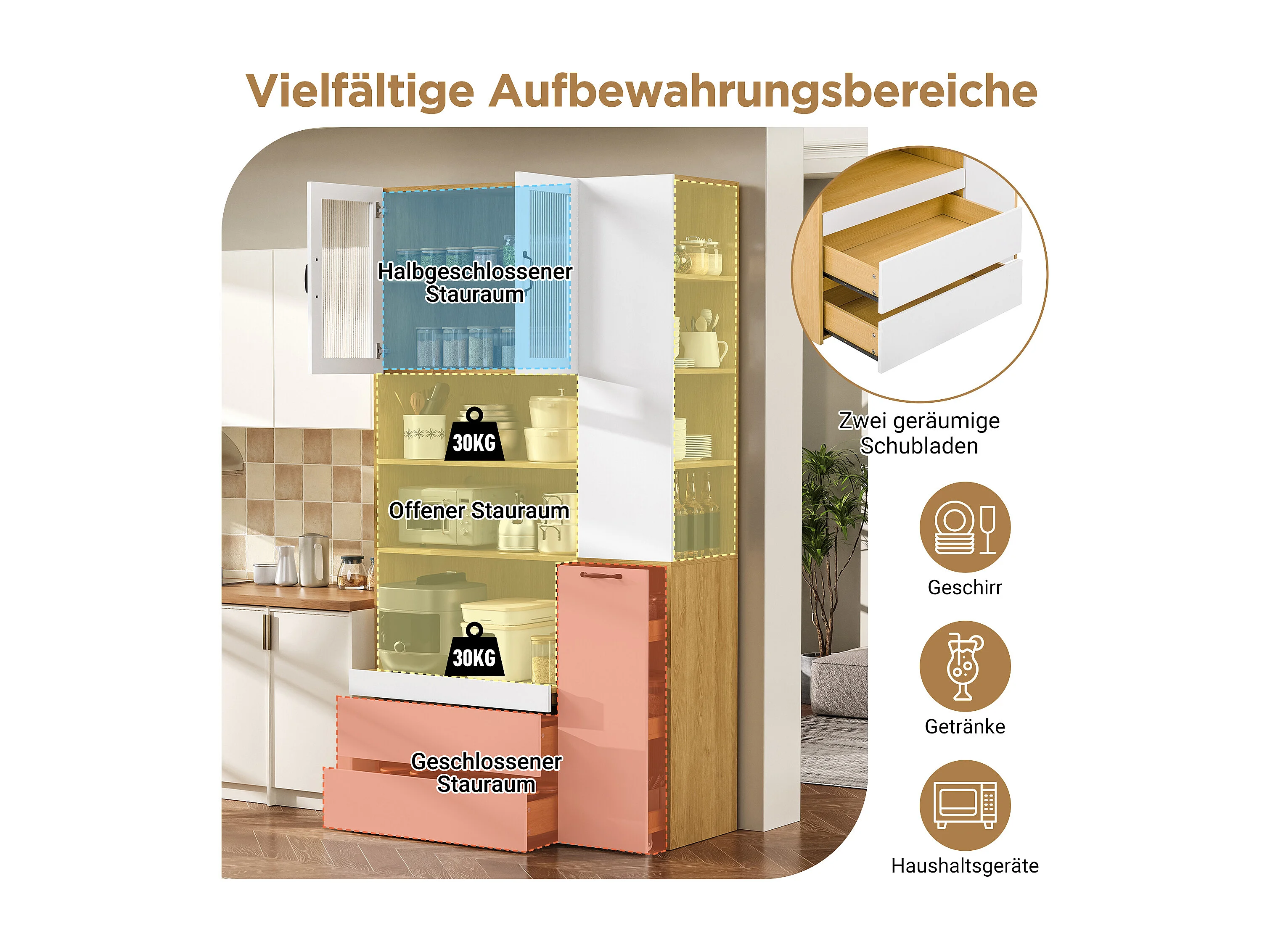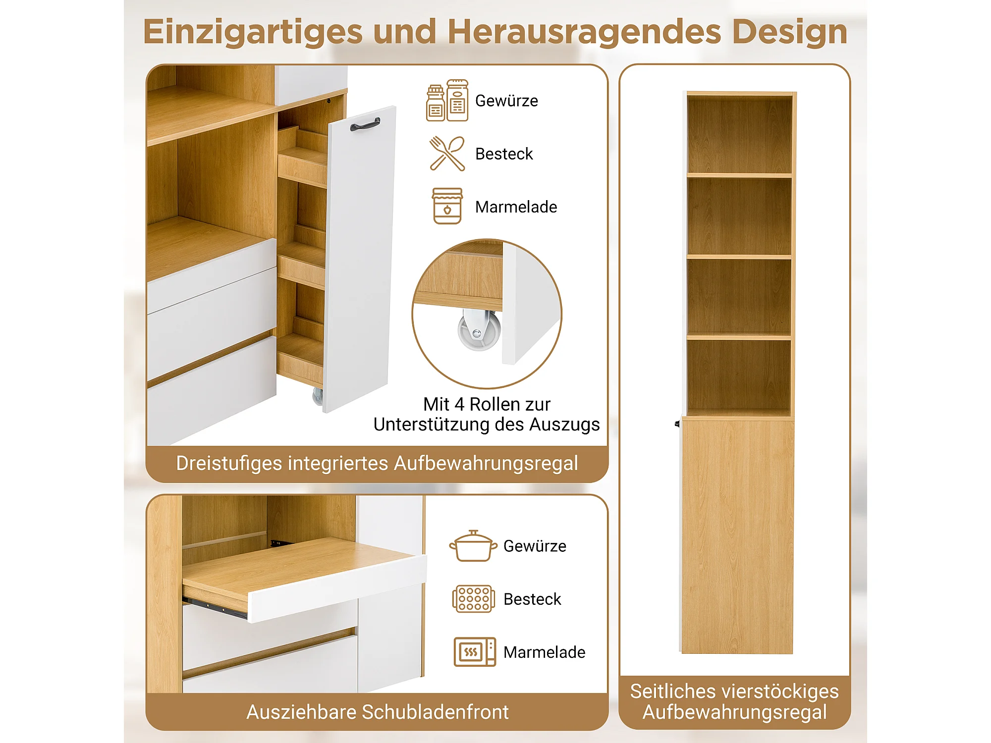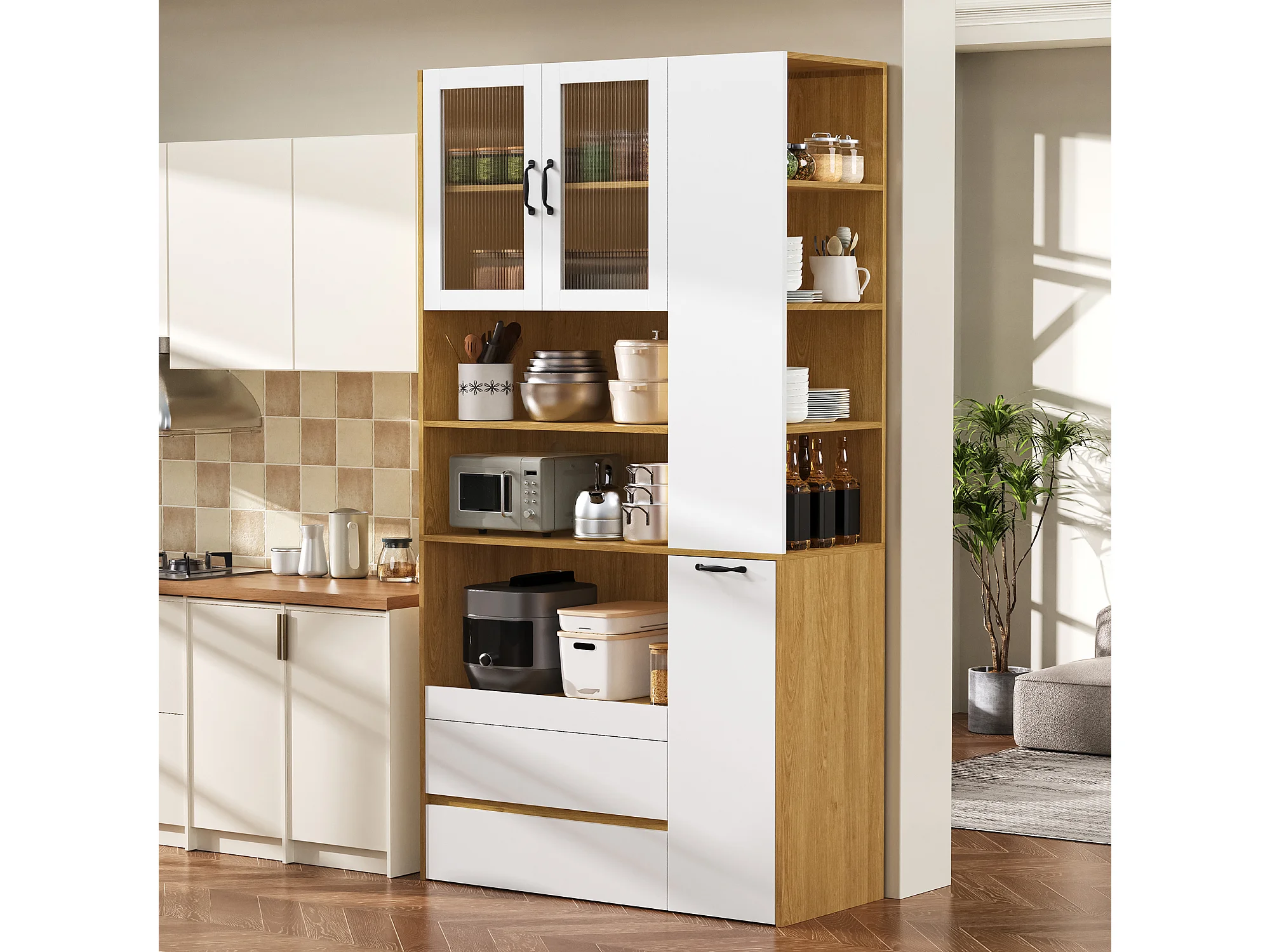 Buffet de cuisine moderne 100x40x200cm - avec tiroirs et étagères réglables - verre rayé - Blanc + Naturel