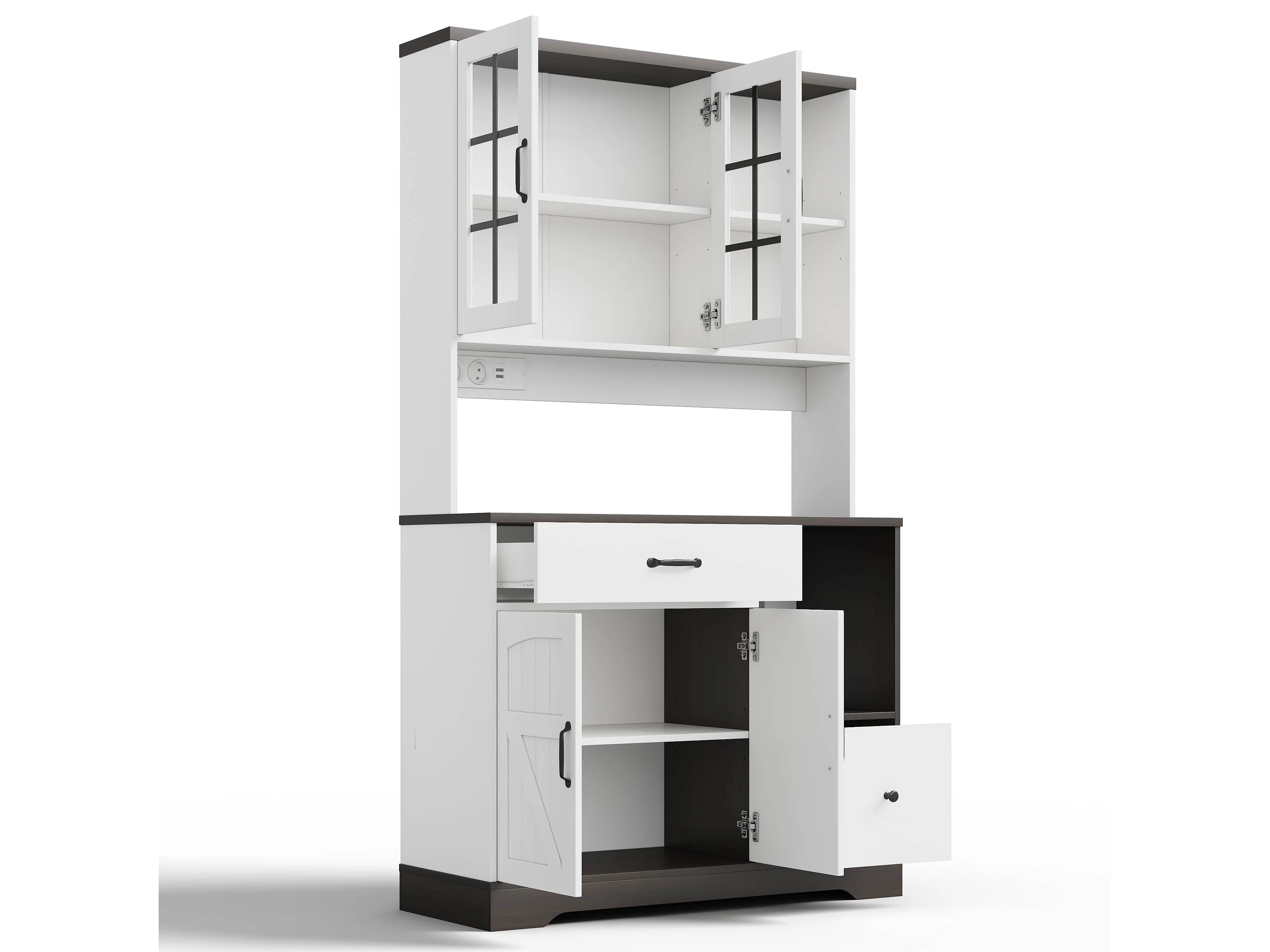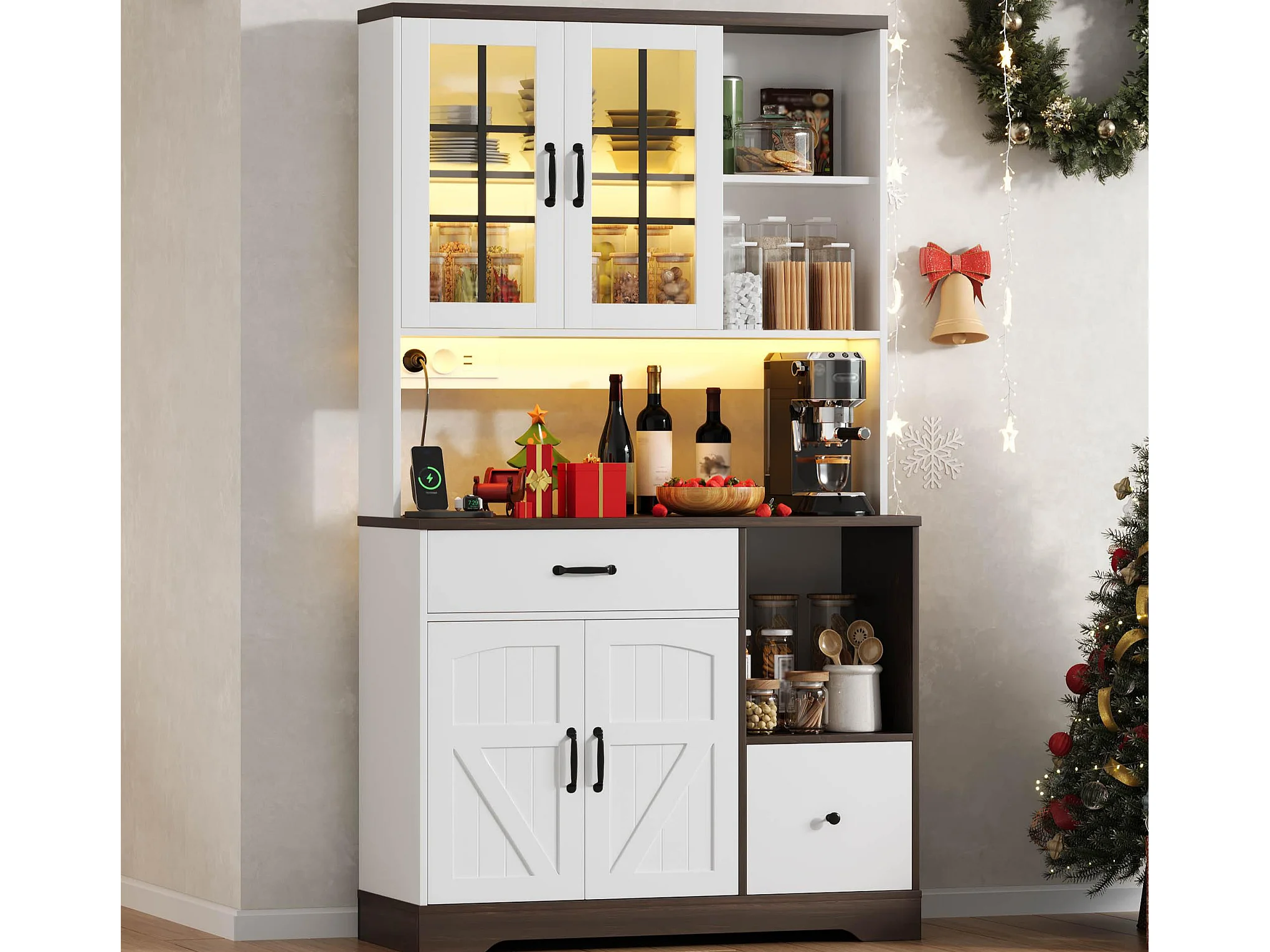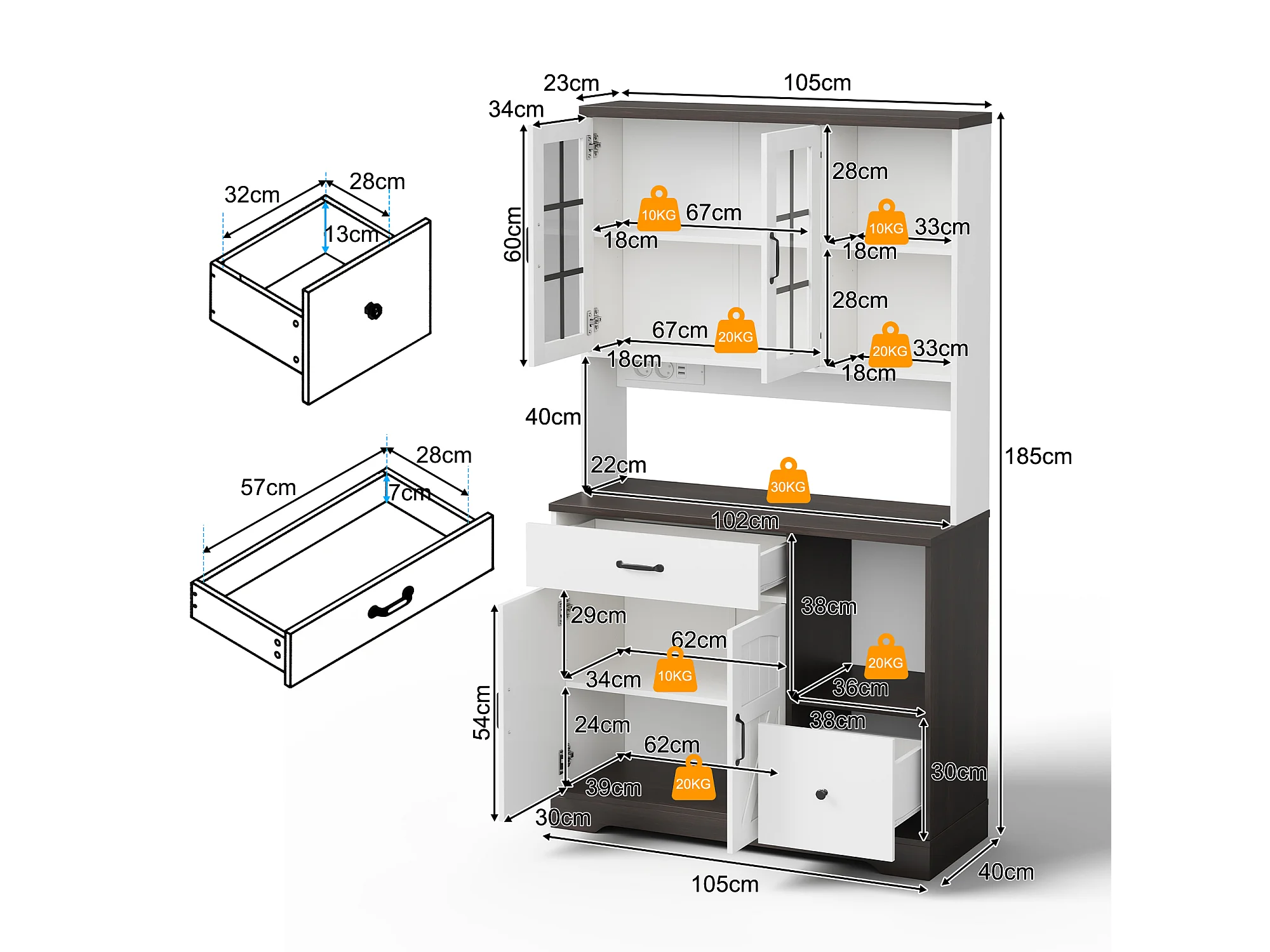 Buffet de cuisine moderne 105x40x180cm - avec éclairage LED et prise - avec étagère réglable - tiroirs et compartiment de rangement - Blanc