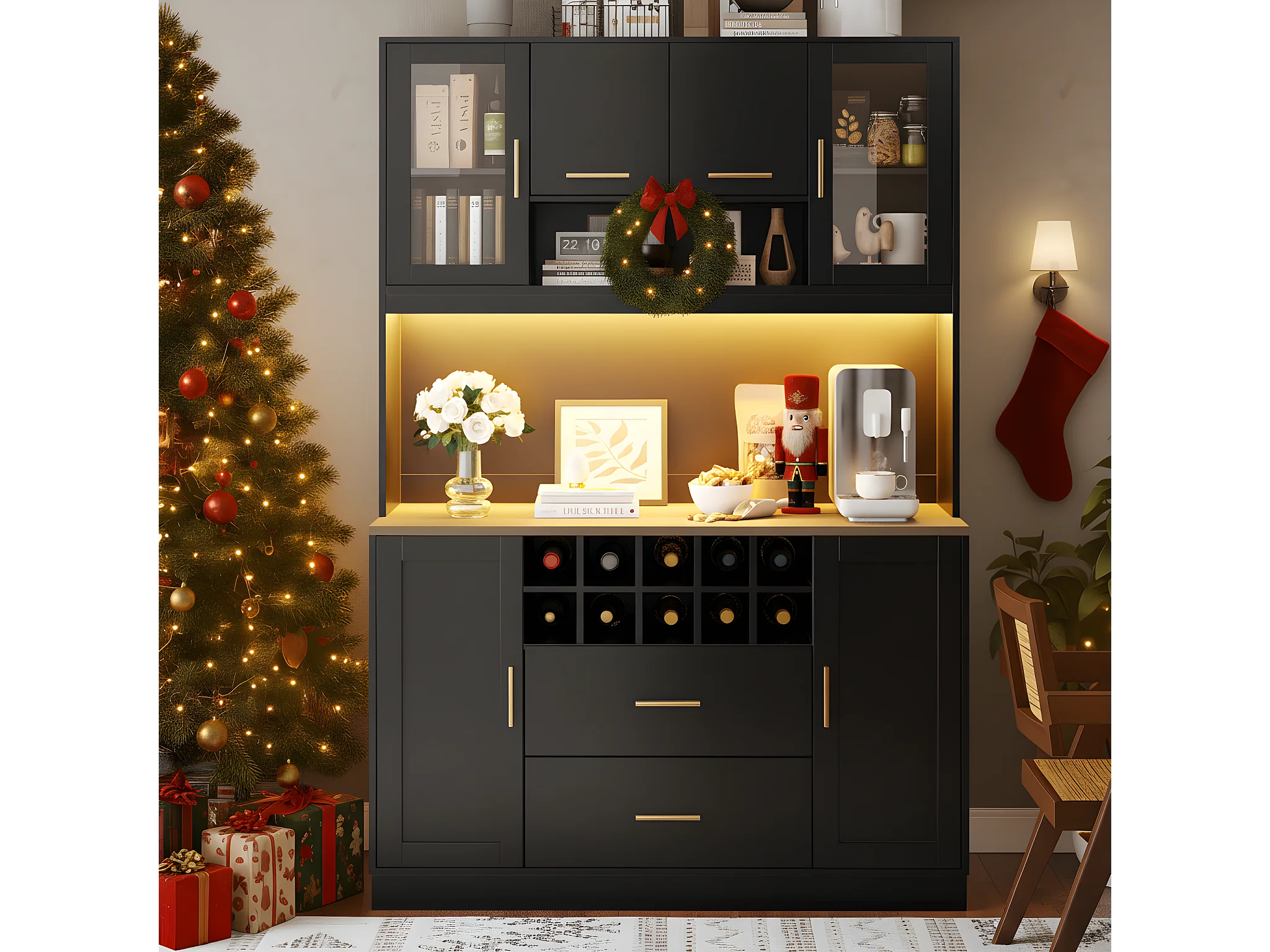 Buffet de cuisine moderne - 120 x 36.3 x 180 cm - avec Leds + prise + 6 portes + 2 tiroirs - noir