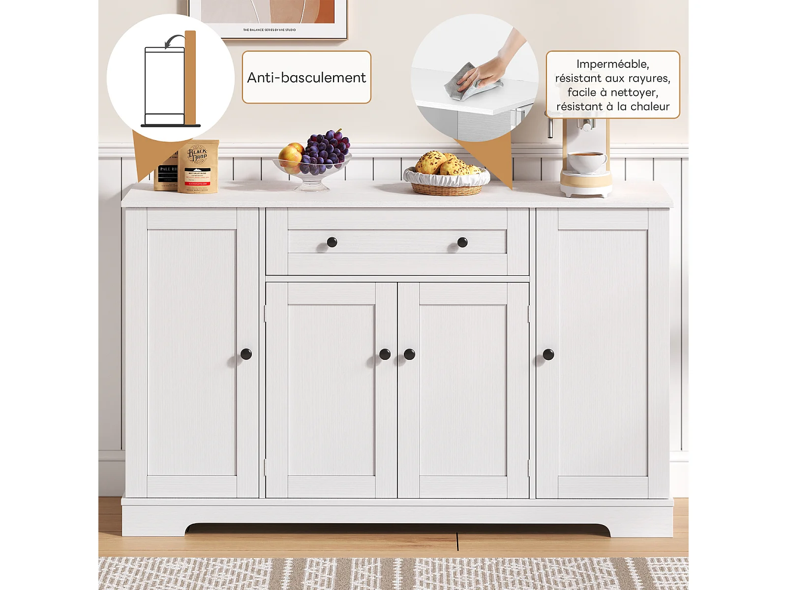 Buffet de cuisine multifonction, portes et étagères réglables, design moderne avec dispositif anti-basculement, idéal cuisine, salon