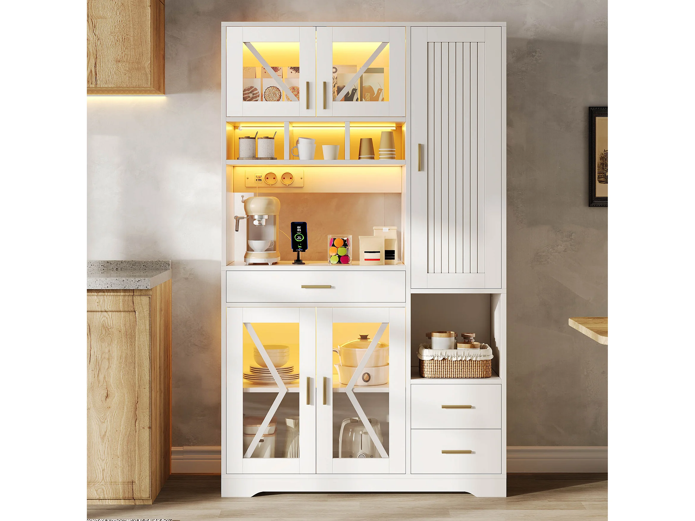Buffet de cuisine style grange 105x40x185cm - avec éclairage LED et prise - avec 5 portes et 3 tiroirs - Blanc
