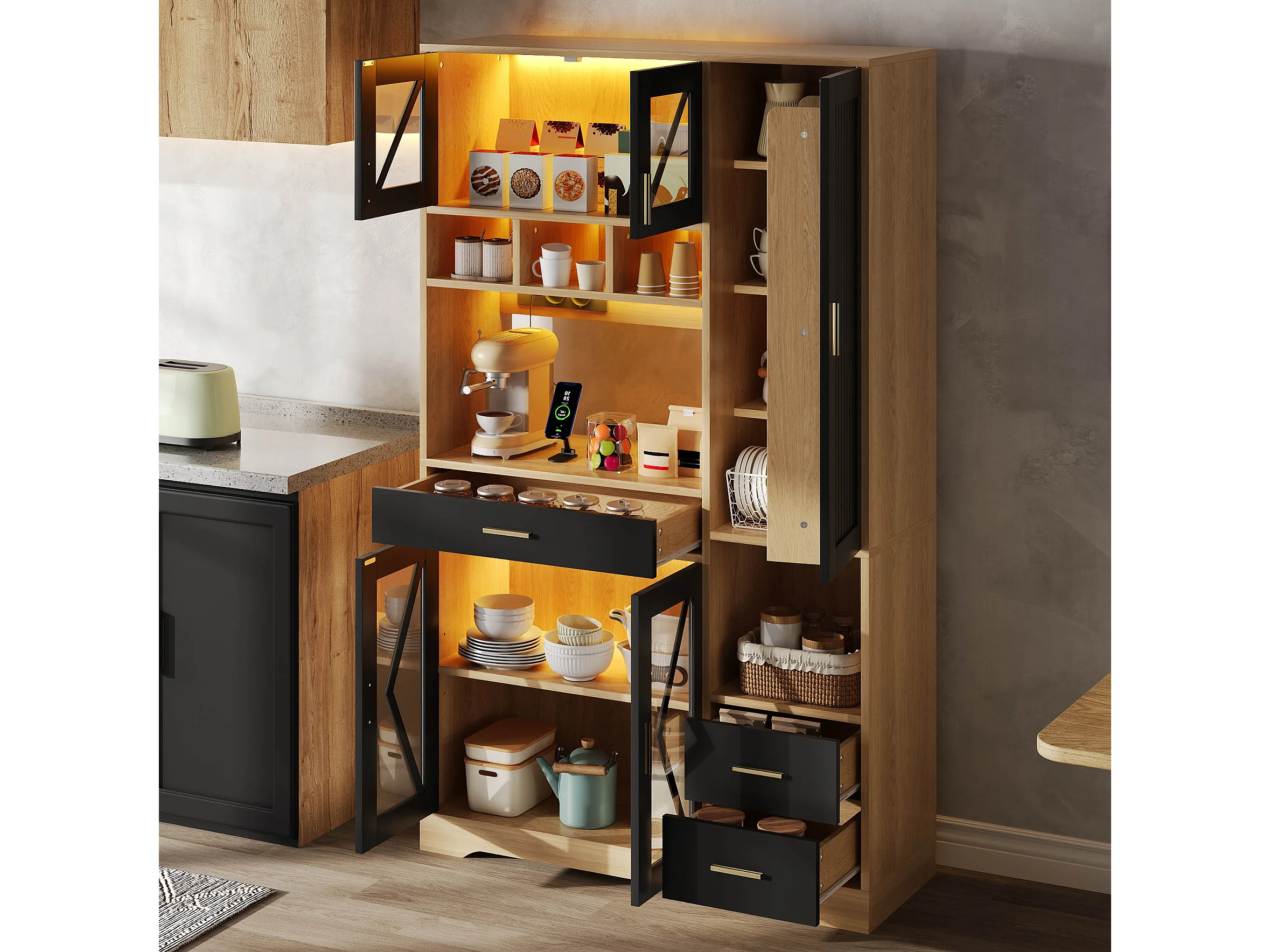 Buffet de cuisine style grange 105x40x185cm - avec éclairage LED et prise - avec 5 portes et 3 tiroirs - Naturel + Noir