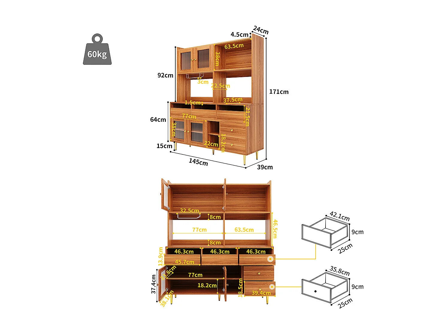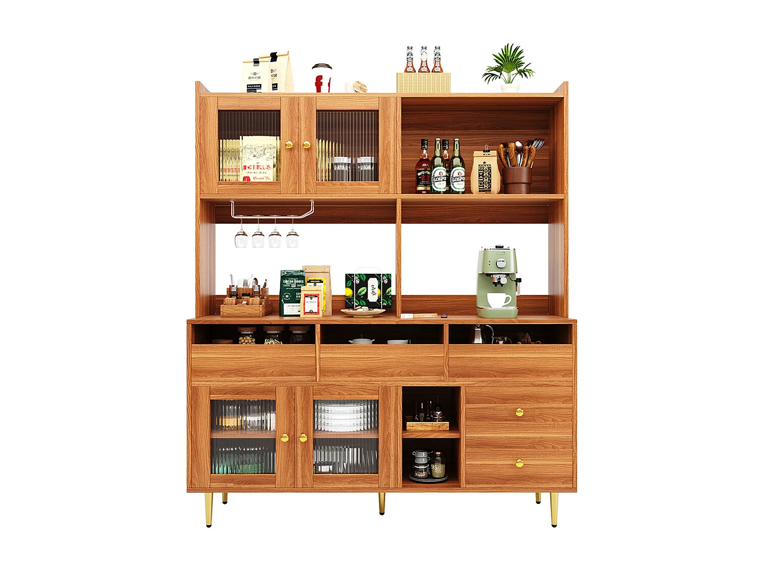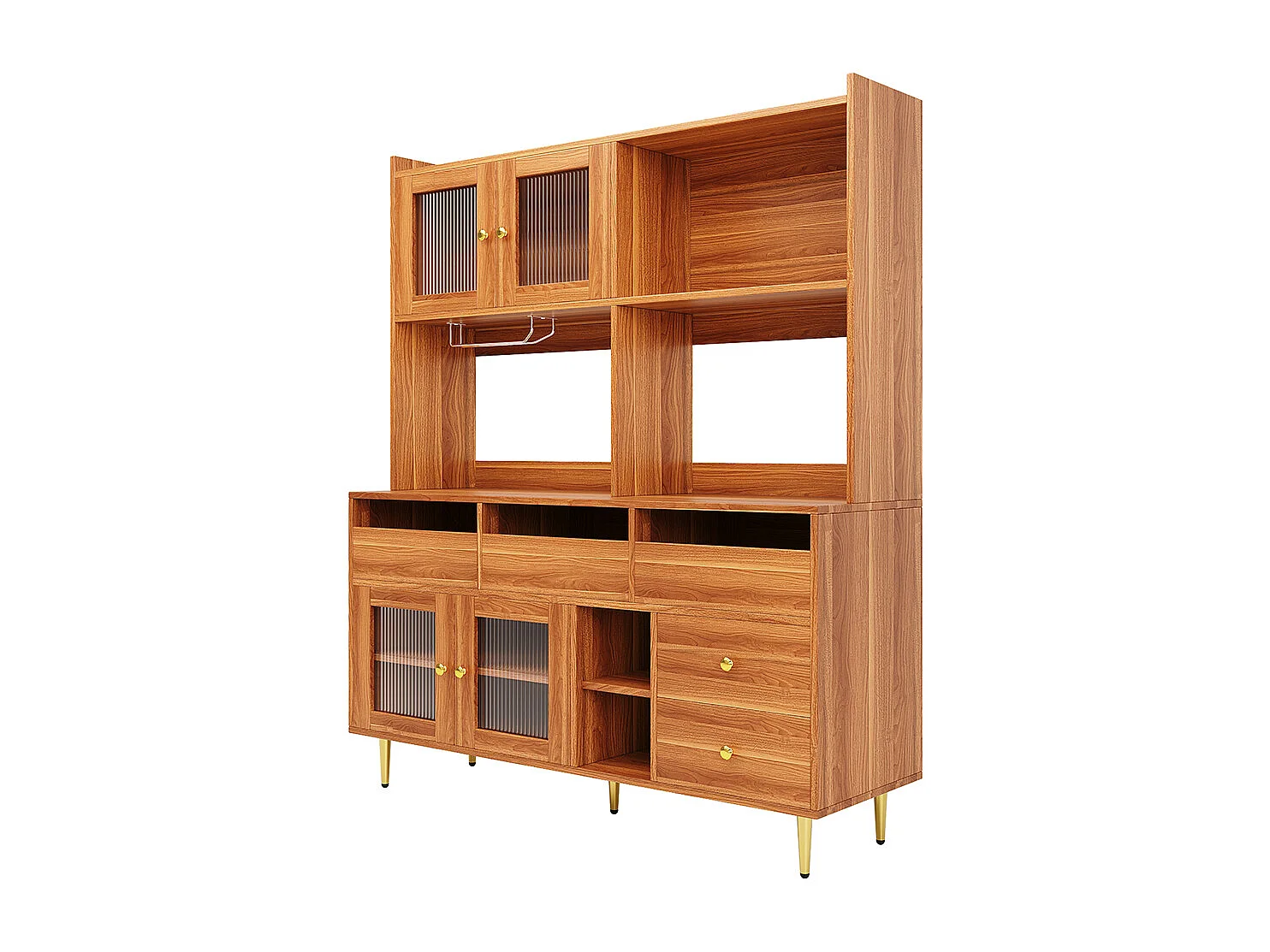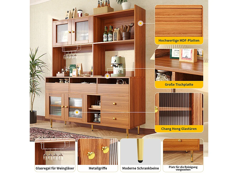Buffet de salle à manger (145 x 39 x 171 cm) avec de longues portes en verre arc-en-ciel, des porte-verres à vin, une structure en bois et des décorations dorées.