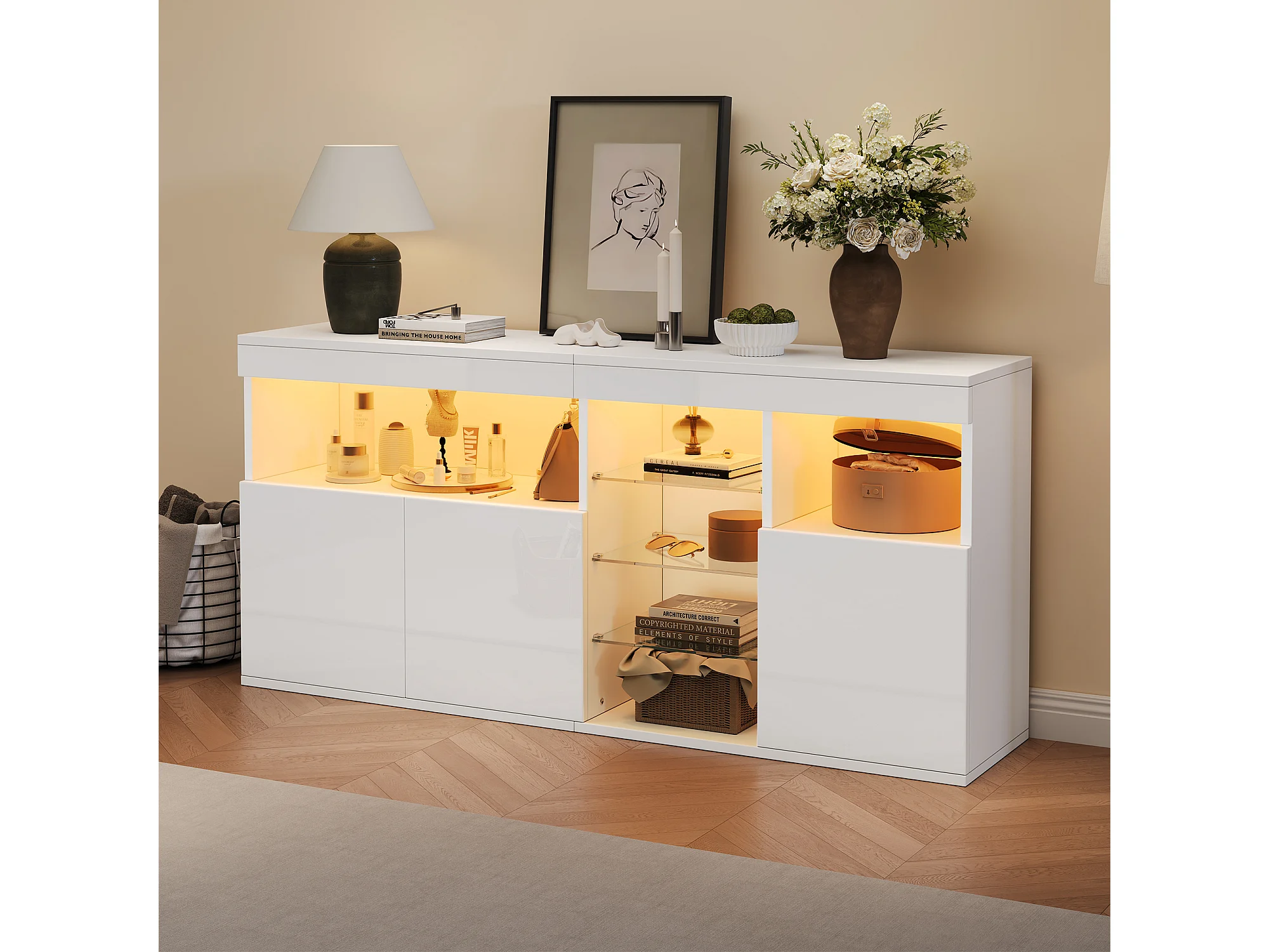 Buffet de salon laquée brillante - 155.5 x 35 x 72 cm - avec Leds + 3 portes + 3 compartiments vitrés - aggloméré - blanc