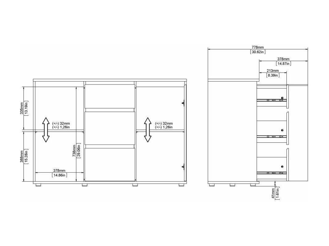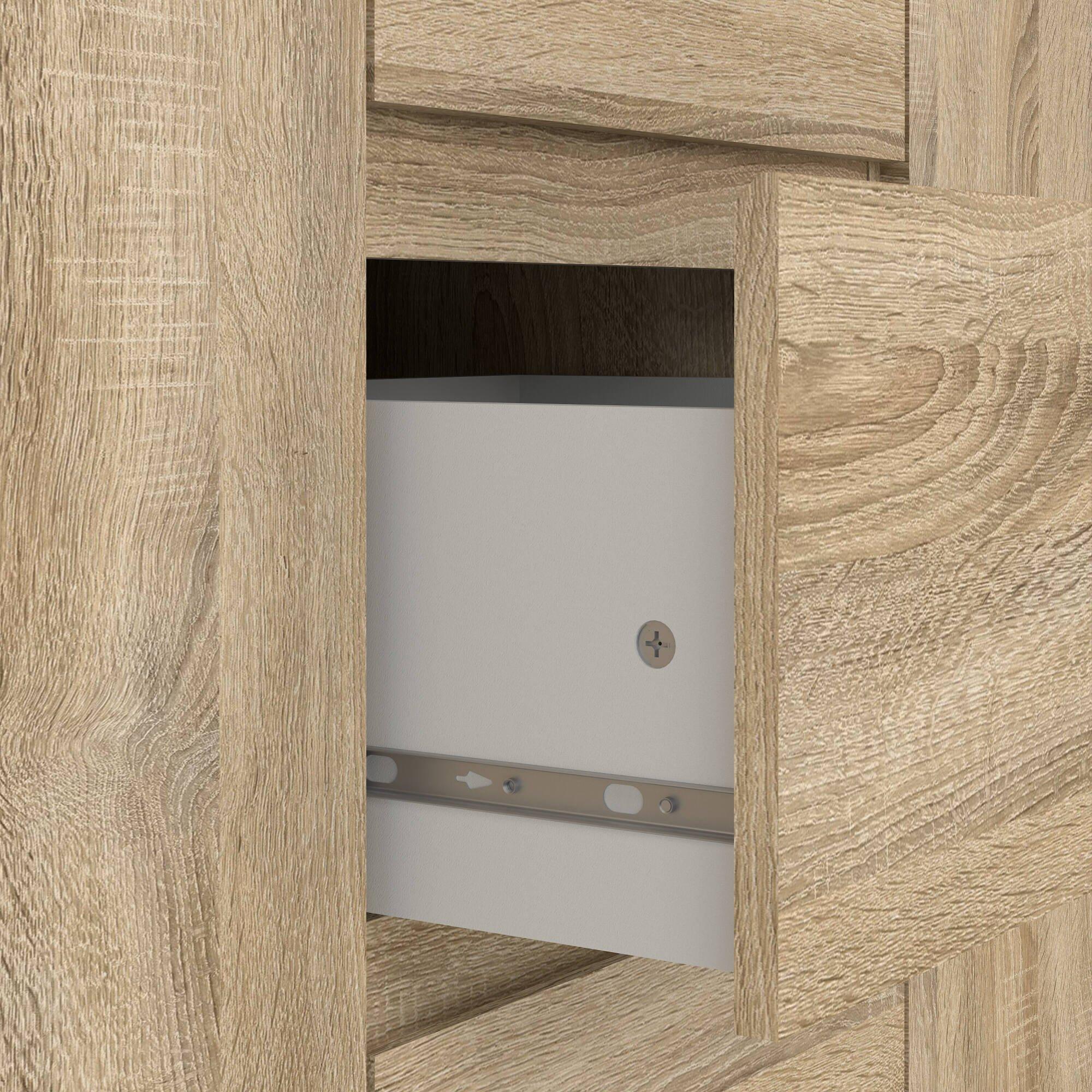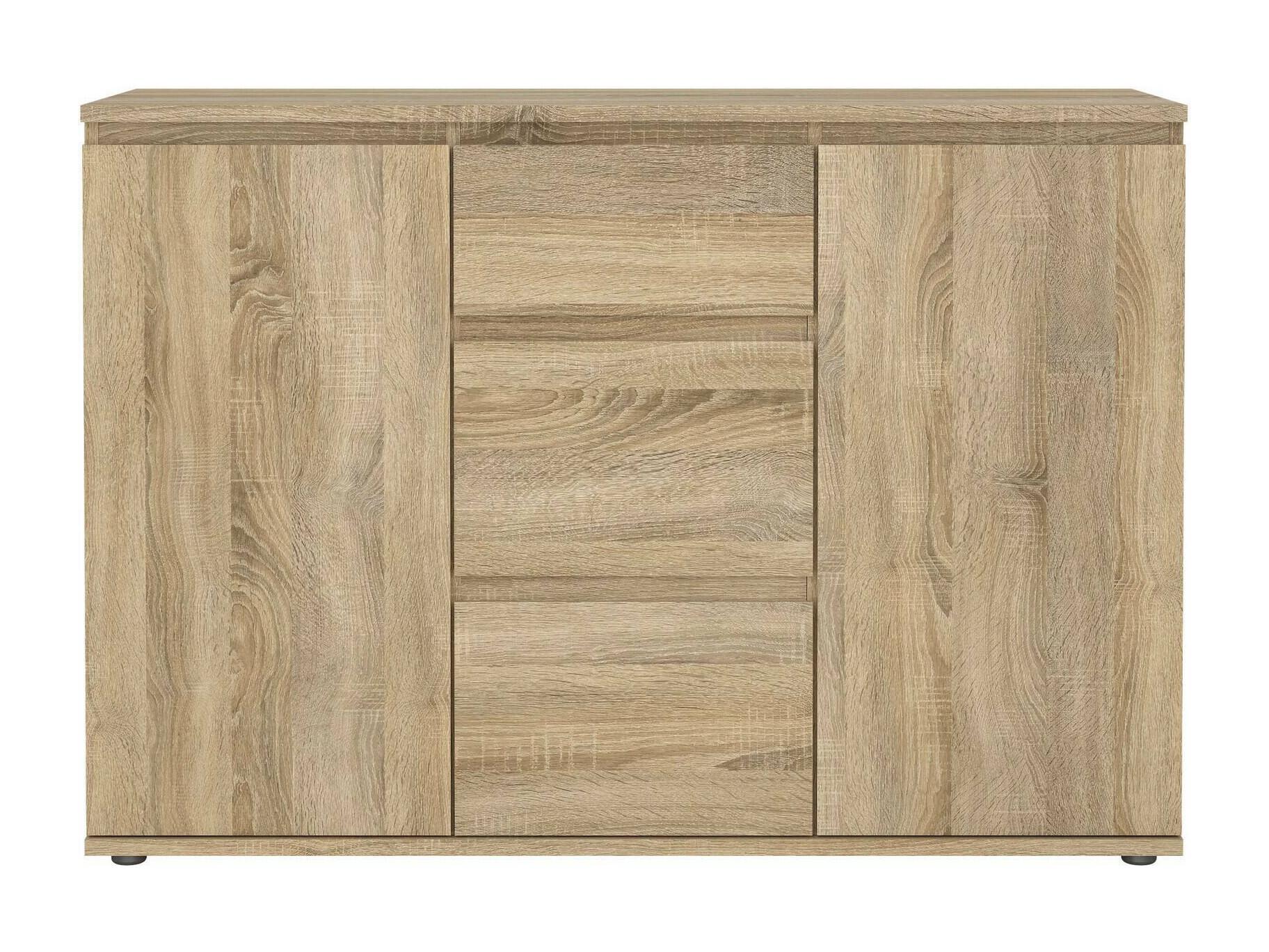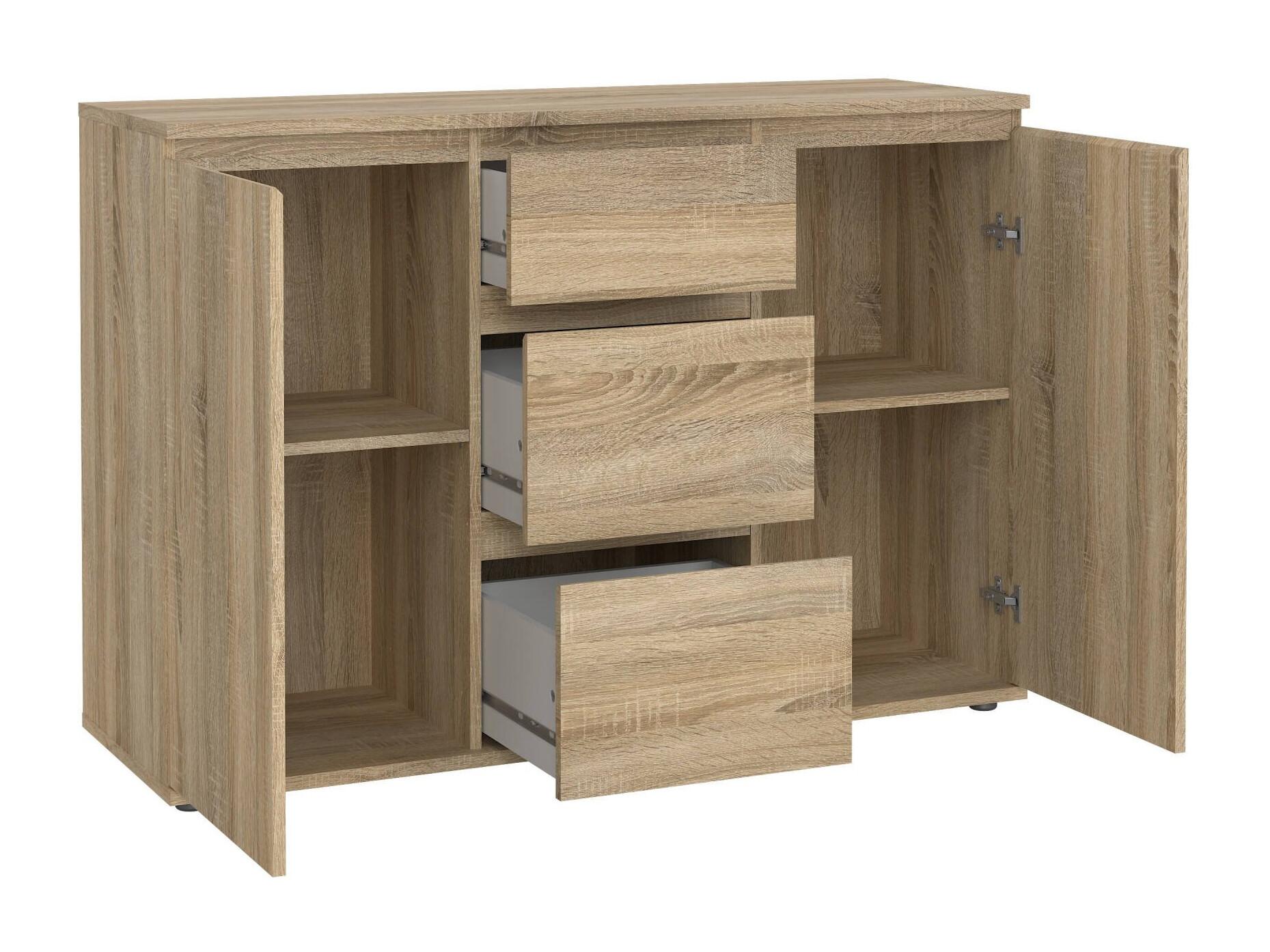 BUFFET - Buffet du salon, Commode de salon, Garde-manger de cuisine, 119x40 h84 cm, Chêne. STRUCTURE ET UTILISATION - Meuble de salon polyvalent, pratique et peu encombrant, au design élégant et fonctionnel - Il peut également être utilisé comme meuble TV où vous pourrez ranger vos décorations préférées - Ce meuble multifonctionnel est parfait pour décorer la salle à manger , salon, couloir, entrée ou bureau contenant soigneusement vaisselle, verres, nappes, couverts, livres, documents ou objets de décoration. QUALITÉ ET DESIGN - Meuble au design moderne et élégant, parfait pour meubler un environnement contemporain et lumineux - Idéal pour ceux qui recherchent des solutions fonctionnelles et peu encombrantes, ce produit est parfait pour les maisons et les appartements de toutes tailles - Garantie de deux ans à compter de la date d'achat. CARACTÉRISTIQUES TECHNIQUES - Accessoire d'ameublement polyvalent, conçu pour une intégration facile avec d'autres meubles - Emballage résistant, conçu pour le commerce électronique - Matériau: Panneau de particules mélaminé - Informations supplémentaires: Article certifié EPA 40 CFR TSCA - Libération de formaldéhyde conforme aux directives IOS/MAT/0181/EN 16606 - Démonté - Equipé d'un kit de montage - Trois tiroirs - Deux portes battantes. DIMENSIONS EN CM - Buffet : Longueur: 119,45 Largeur: 40 Hauteur: 83,7 - Dimensions supplémentaires: Ouverture tiroir 22,7 cm - Ouverture porte : 37,8 cm