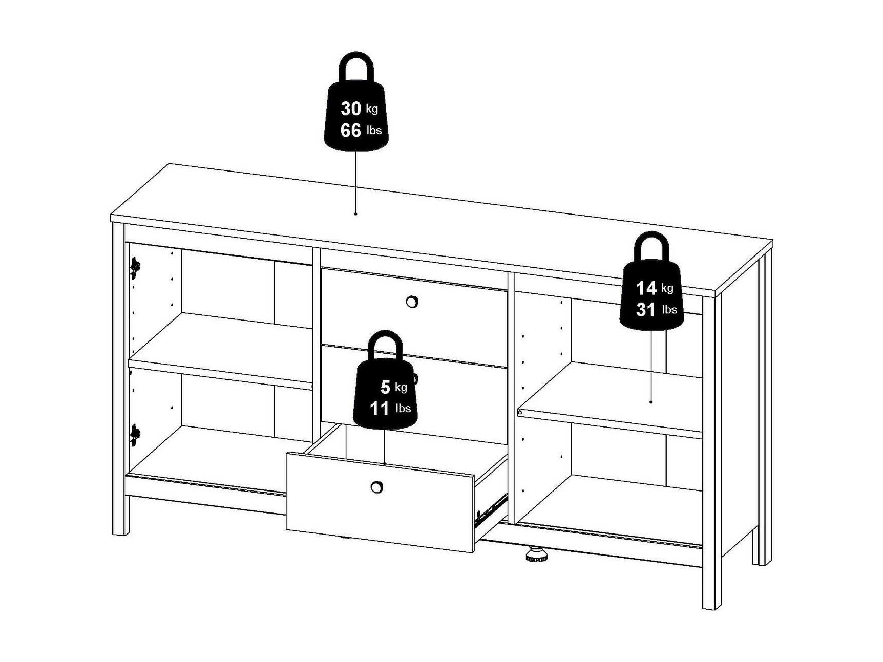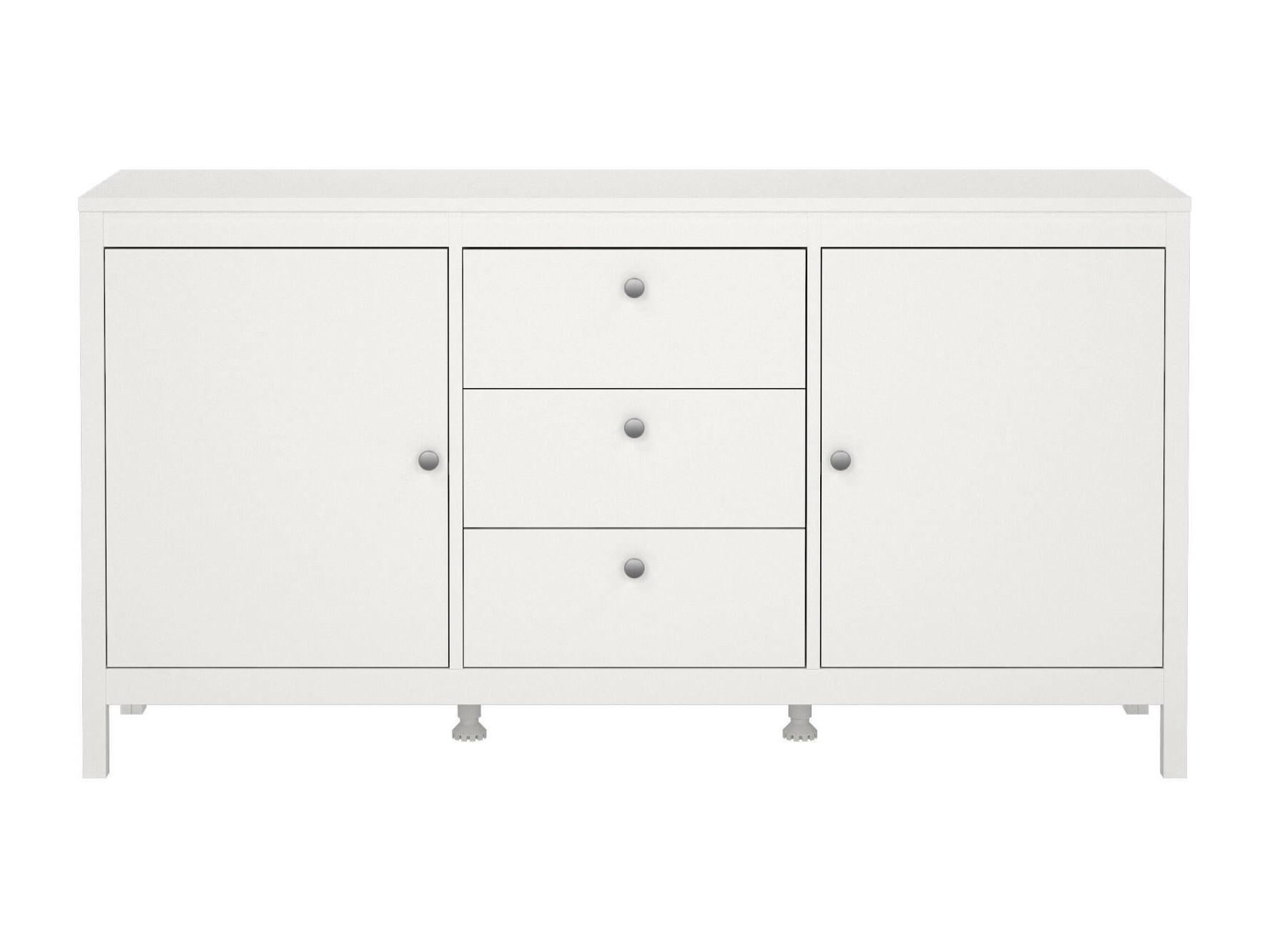 BUFFET - Buffet du salon, Commode de salon, Garde-manger de cuisine, 151x38 h80 cm, Blanc. STRUCTURE ET UTILISATION - Meuble de salon polyvalent, pratique et peu encombrant, au design élégant et fonctionnel - Il peut également être utilisé comme meuble TV où vous pourrez ranger vos décorations préférées - Ce meuble multifonctionnel est parfait pour décorer la salle à manger , salon, couloir, entrée ou bureau contenant soigneusement vaisselle, verres, nappes, couverts, livres, documents ou objets de décoration. QUALITÉ ET DESIGN - Meuble au design moderne et élégant, parfait pour meubler un environnement contemporain et lumineux - Idéal pour ceux qui recherchent des solutions fonctionnelles et peu encombrantes, ce produit est parfait pour les maisons et les appartements de toutes tailles - Garantie de deux ans à compter de la date d'achat. CARACTÉRISTIQUES TECHNIQUES - Accessoire d'ameublement polyvalent, conçu pour une intégration facile avec d'autres meubles - Emballage résistant, conçu pour le commerce électronique - Matériau: Panneau de particules mélaminé - Informations supplémentaires: Article certifié EPA 40 CFR TSCA - Libération de formaldéhyde conforme aux directives IOS/MAT/0181/EN 16884 - Démonté - Equipé d'un kit de montage - Deux portes - Trois tiroirs. DIMENSIONS EN CM - Buffet : Longueur: 151,4 Largeur: 38,4 Hauteur: 79,7 - Dimensions supplémentaires: Ouverture tiroir : 21,4 cm - Ouverture porte : 40,4 cm