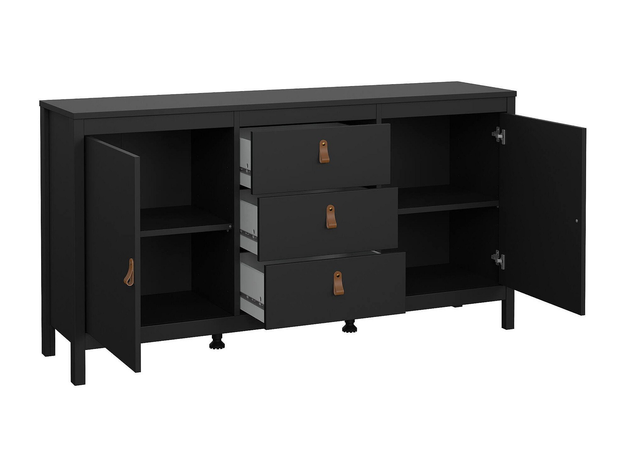 BUFFET - Buffet du salon, Commode de salon, Garde-manger de cuisine, 151x38 h80 cm, Noir. STRUCTURE ET UTILISATION - Meuble de salon polyvalent, pratique et peu encombrant, au design élégant et fonctionnel - Il peut également être utilisé comme meuble TV où vous pourrez ranger vos décorations préférées - Ce meuble multifonctionnel est parfait pour décorer la salle à manger , salon, couloir, entrée ou bureau contenant soigneusement vaisselle, verres, nappes, couverts, livres, documents ou objets de décoration. QUALITÉ ET DESIGN - Meuble au design moderne et élégant, parfait pour meubler un environnement contemporain et lumineux - Idéal pour ceux qui recherchent des solutions fonctionnelles et peu encombrantes, ce produit est parfait pour les maisons et les appartements de toutes tailles - Garantie de deux ans à compter de la date d'achat. CARACTÉRISTIQUES TECHNIQUES - Accessoire d'ameublement polyvalent, conçu pour une intégration facile avec d'autres meubles - Emballage résistant, conçu pour le commerce électronique - Matériau: Panneau de particules mélaminé - Informations supplémentaires: Article certifié EPA 40 CFR TSCA - Libération de formaldéhyde conforme aux directives IOS/MAT/0181/EN 16992 - Démonté - Equipé d'un kit de montage - Deux portes - Trois tiroirs. DIMENSIONS EN CM - Buffet : Longueur: 151,4 Largeur: 38,4 Hauteur: 79,7 - Dimensions supplémentaires: Ouverture tiroir : 21,4 cm - Ouverture porte : 40,4 cm