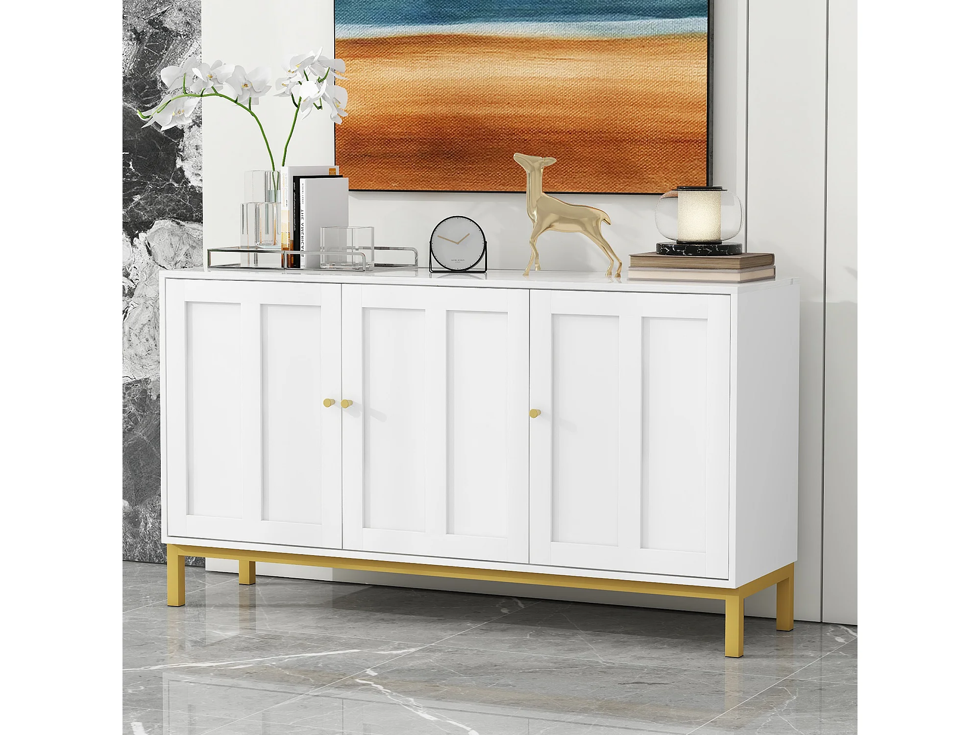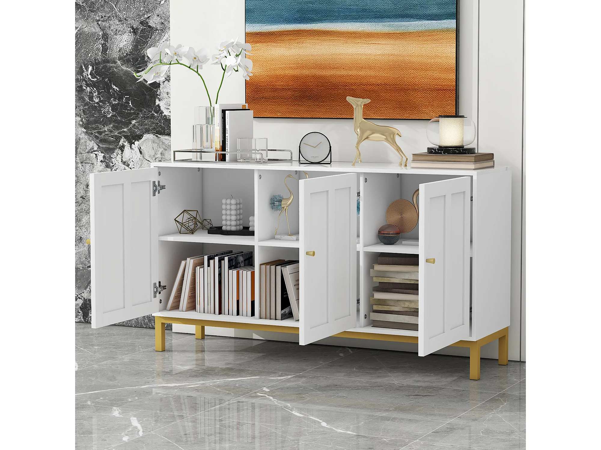 Buffet 140 x 37,8 x 82 cm – 4 portes, 4 tiroirs avec stratifié amovible – Poignées et pieds dorés – Meuble pour salon et salle à manger