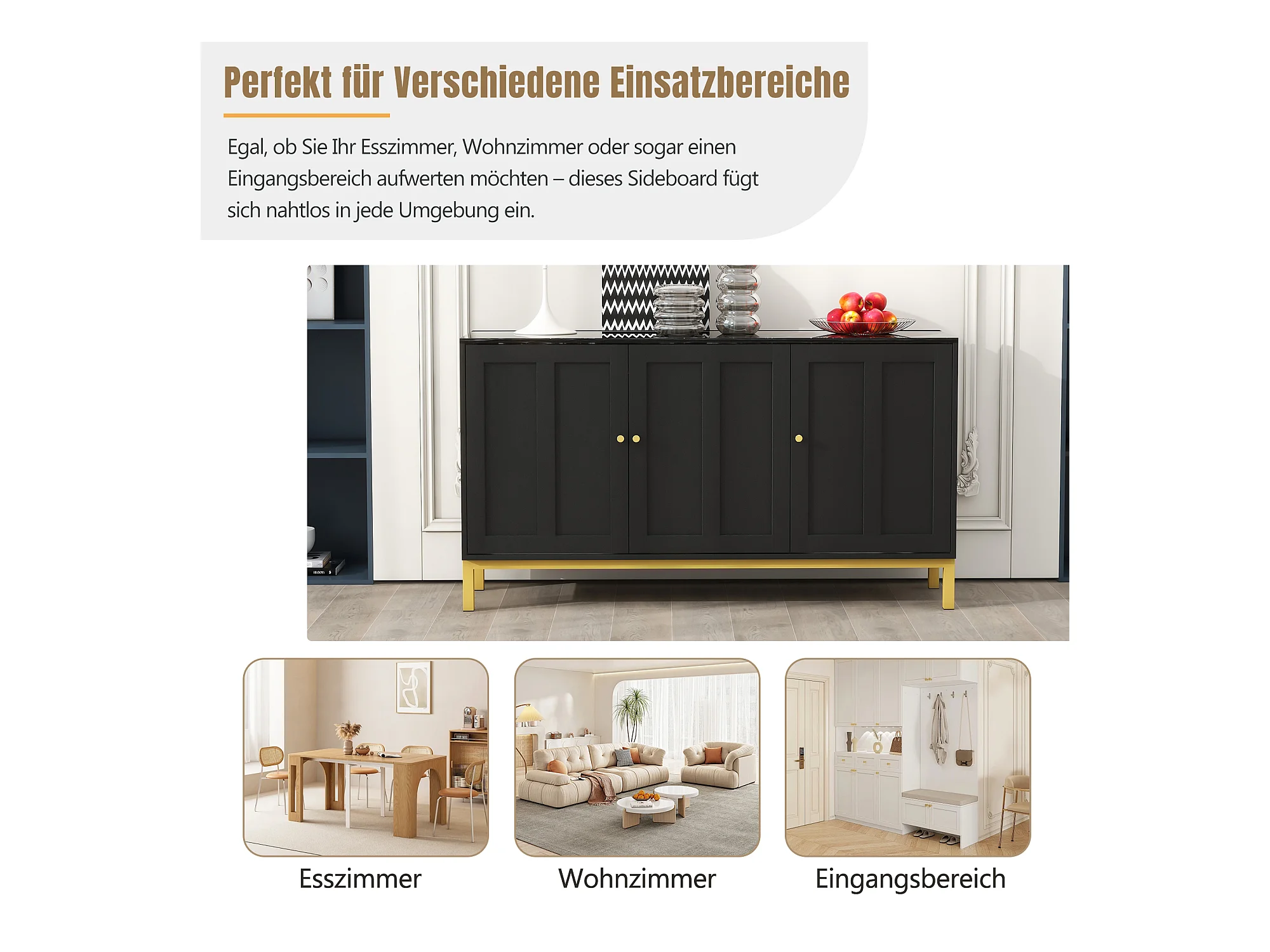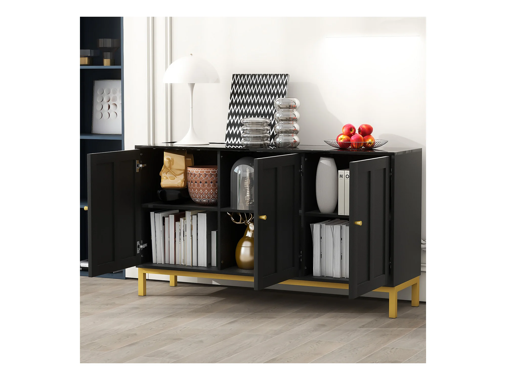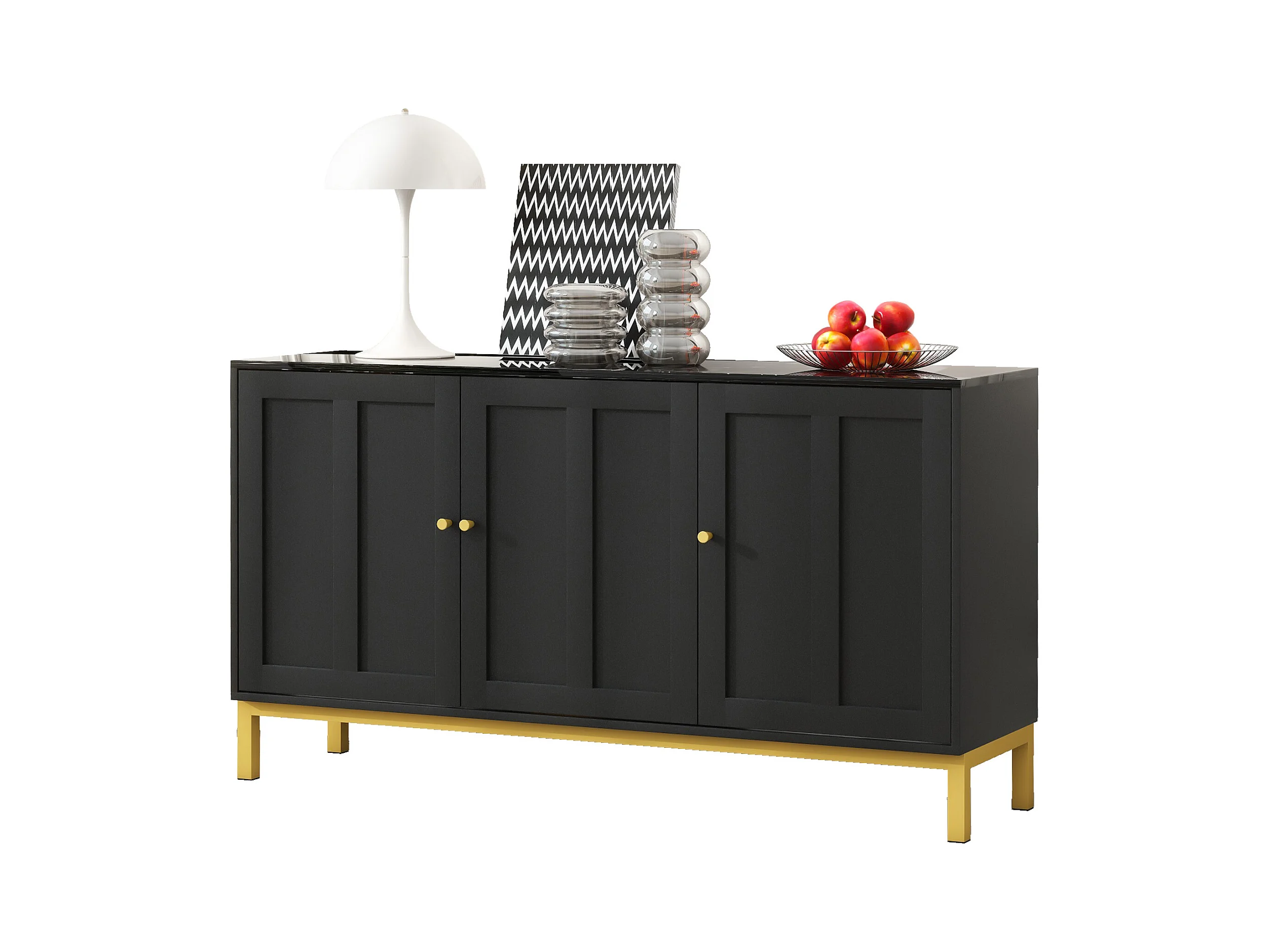 Buffet 4 portes, pieds en métal, MDF, noir+or (150x40x80 cm)