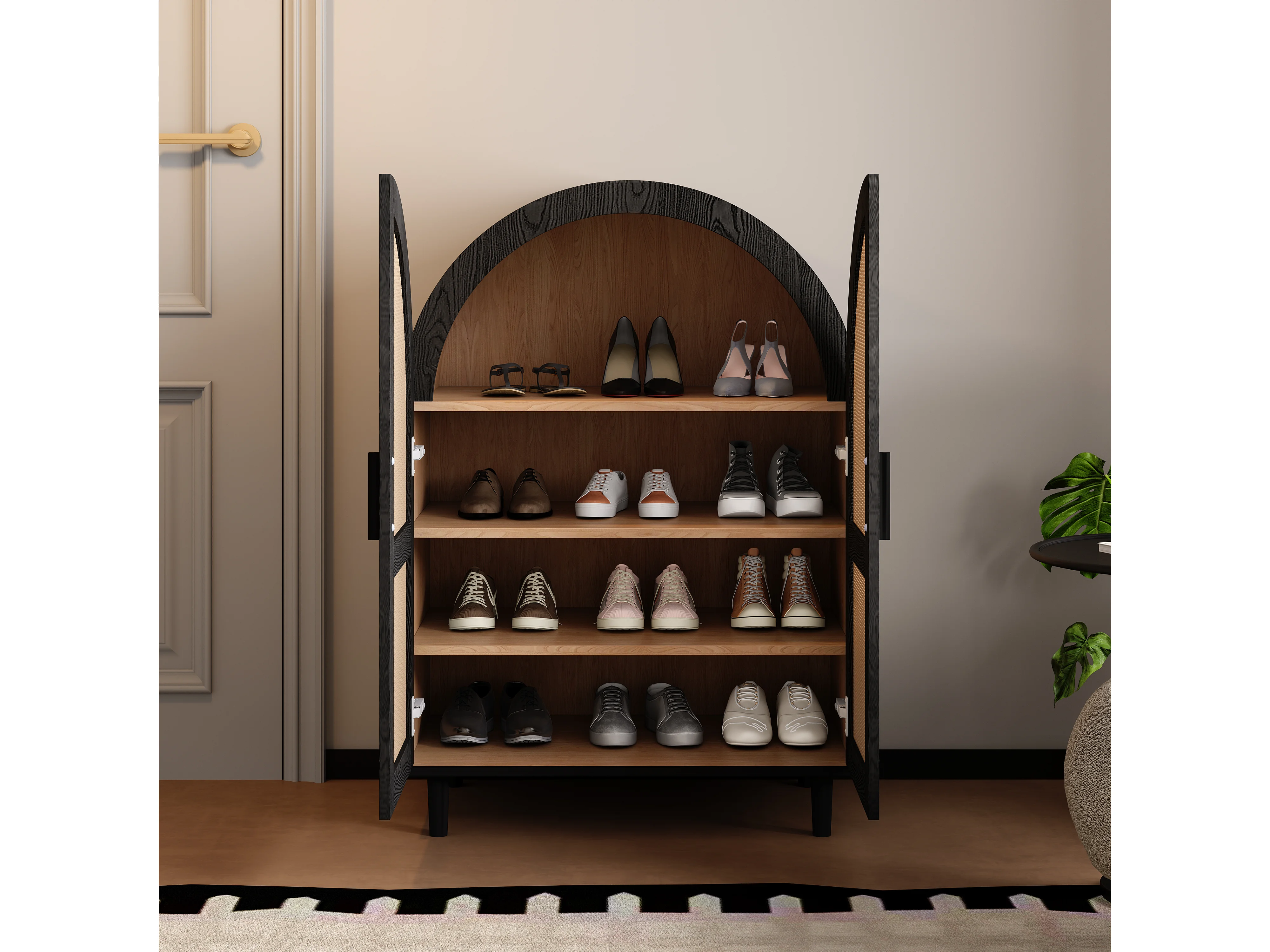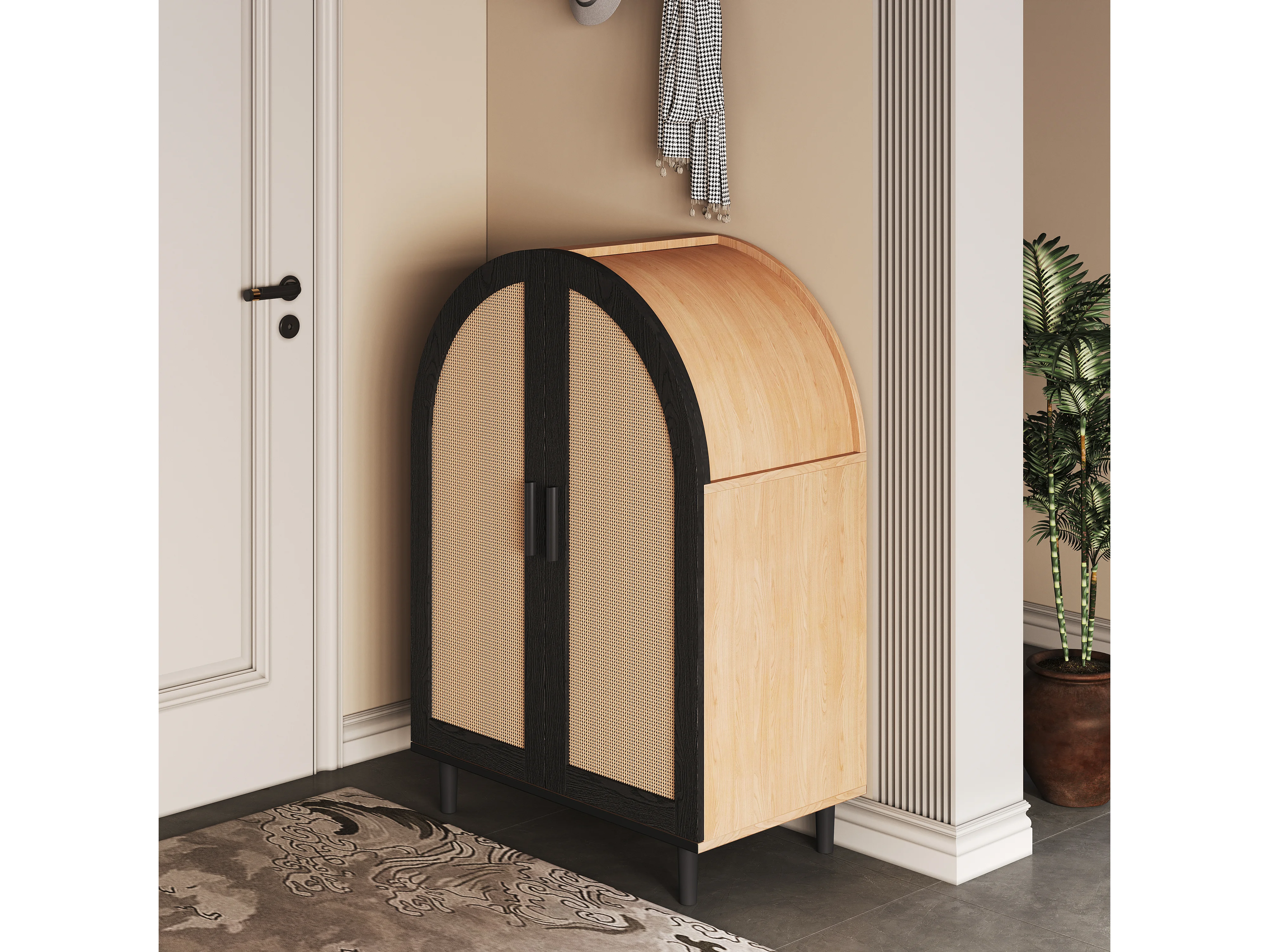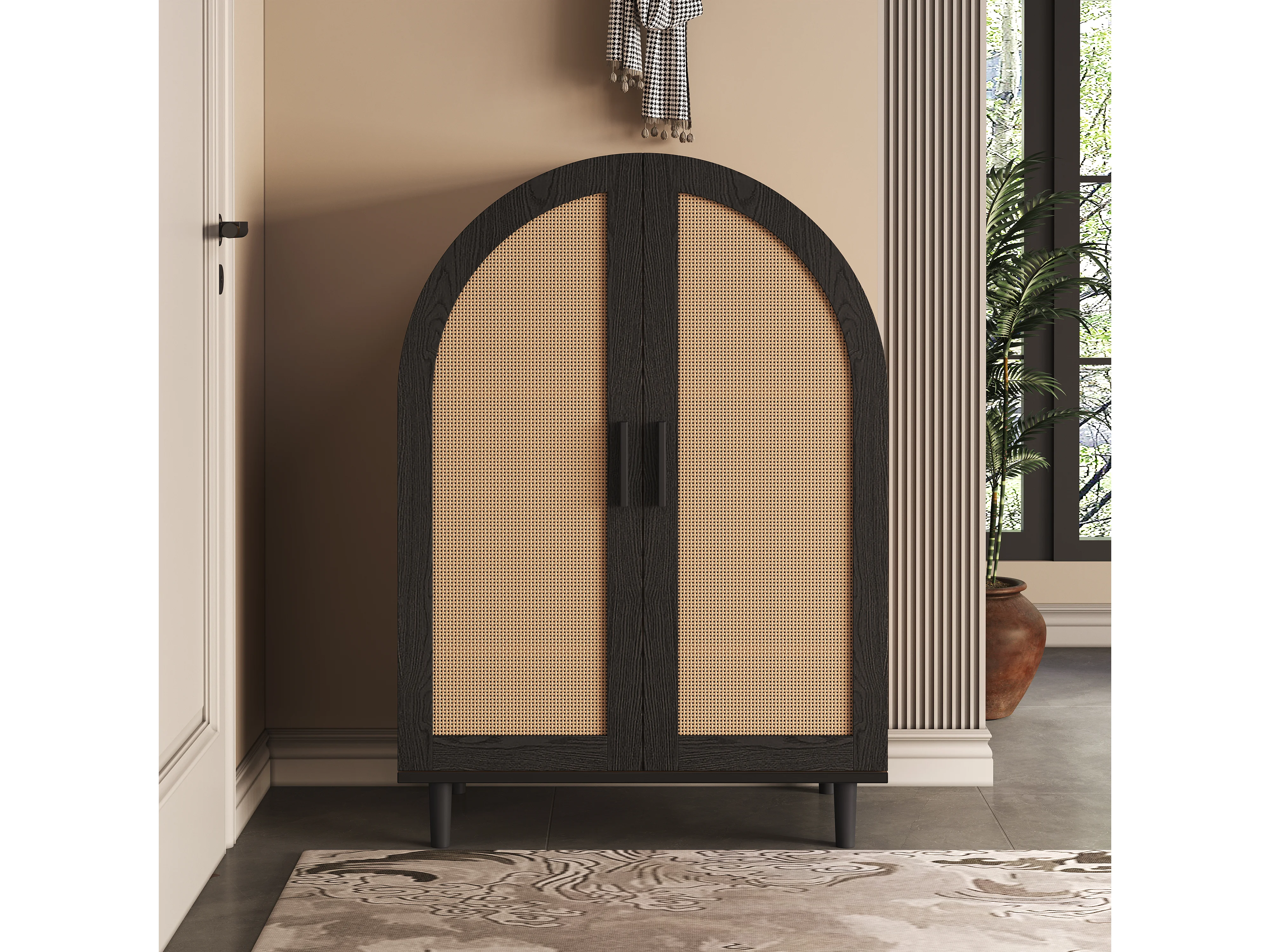 Buffet élégant avec portes en rotin, trois étagères, bois et noir, MDF (70x40x100 cm)