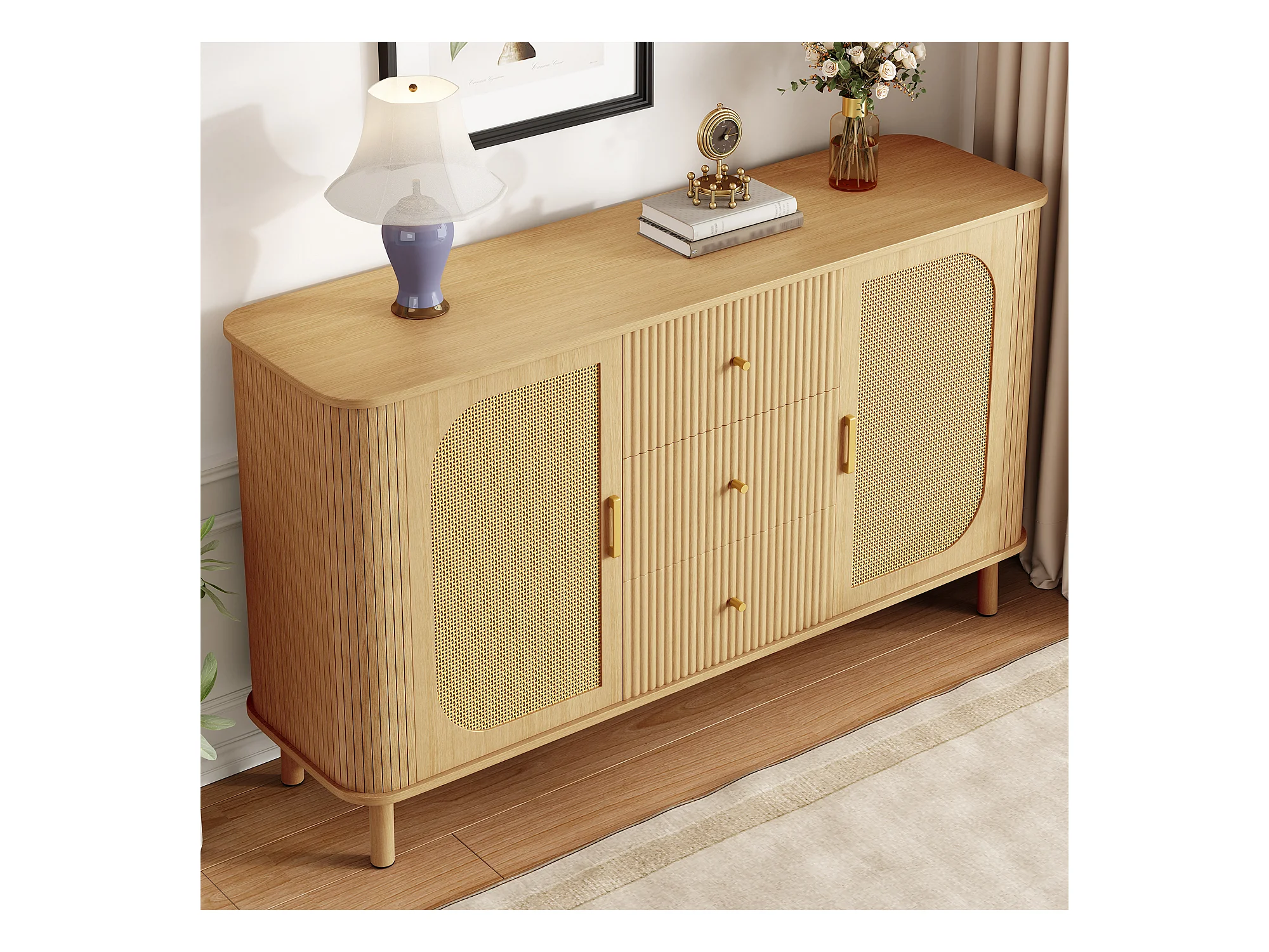 Buffet salle à manger 3 portes coulissantes en rotin 3 tiroirs - meuble de rangement en bois - chêne (140x40x78 cm)
