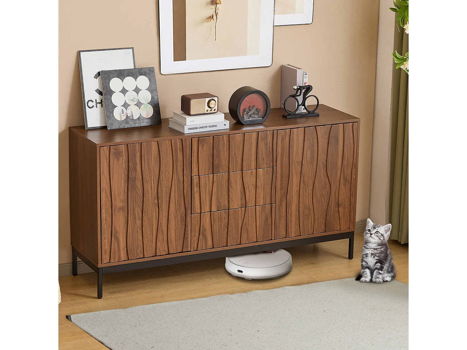Buffet 3 portes avec grand espace de rangement, portes en placage bois massif à texture concave et convexe, Petit meuble avec finition