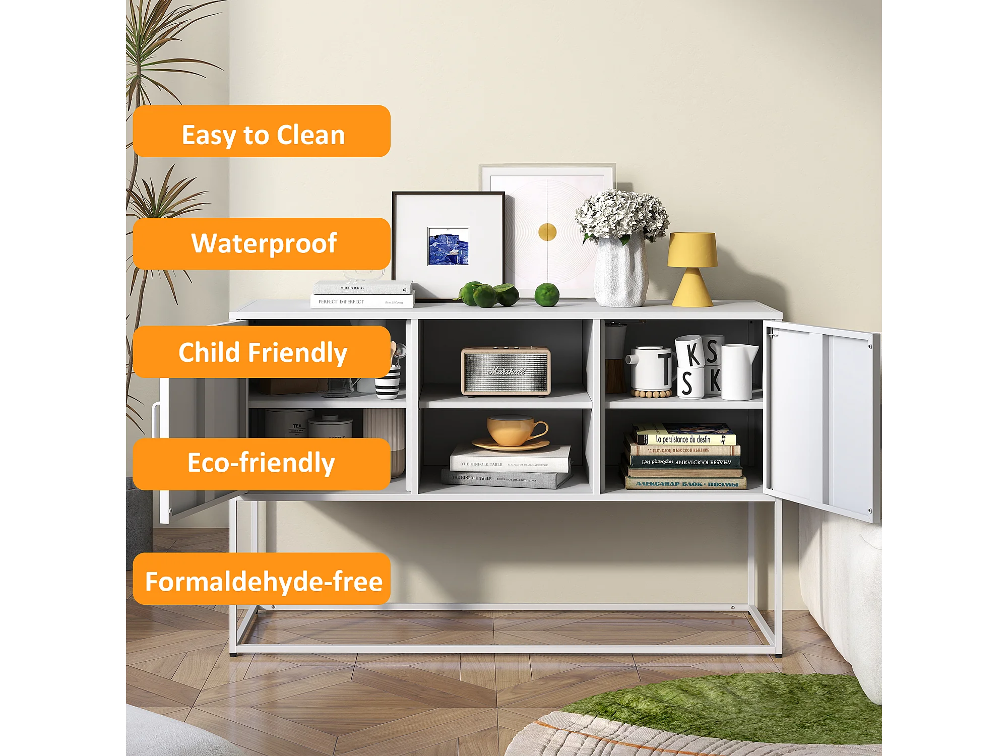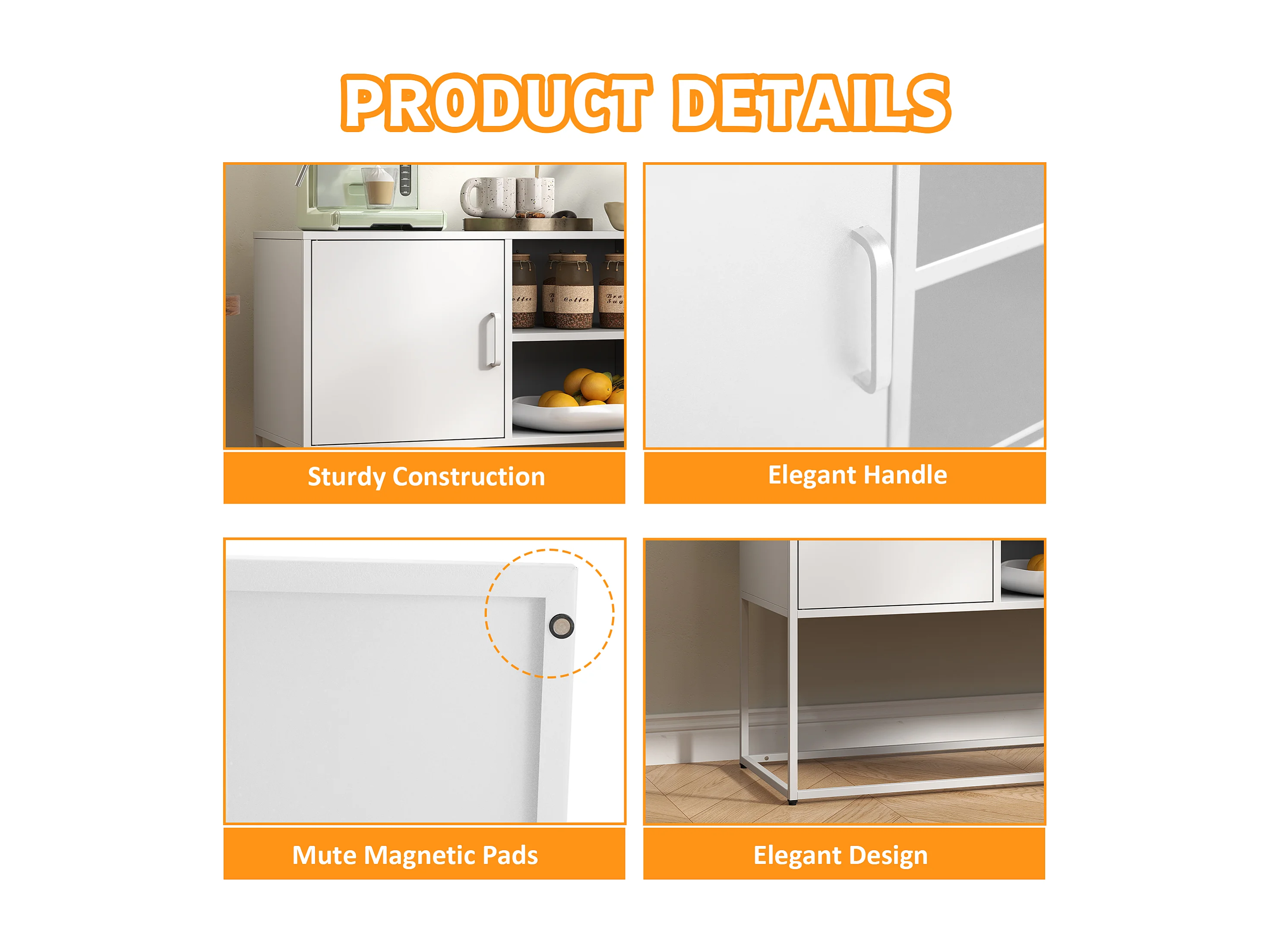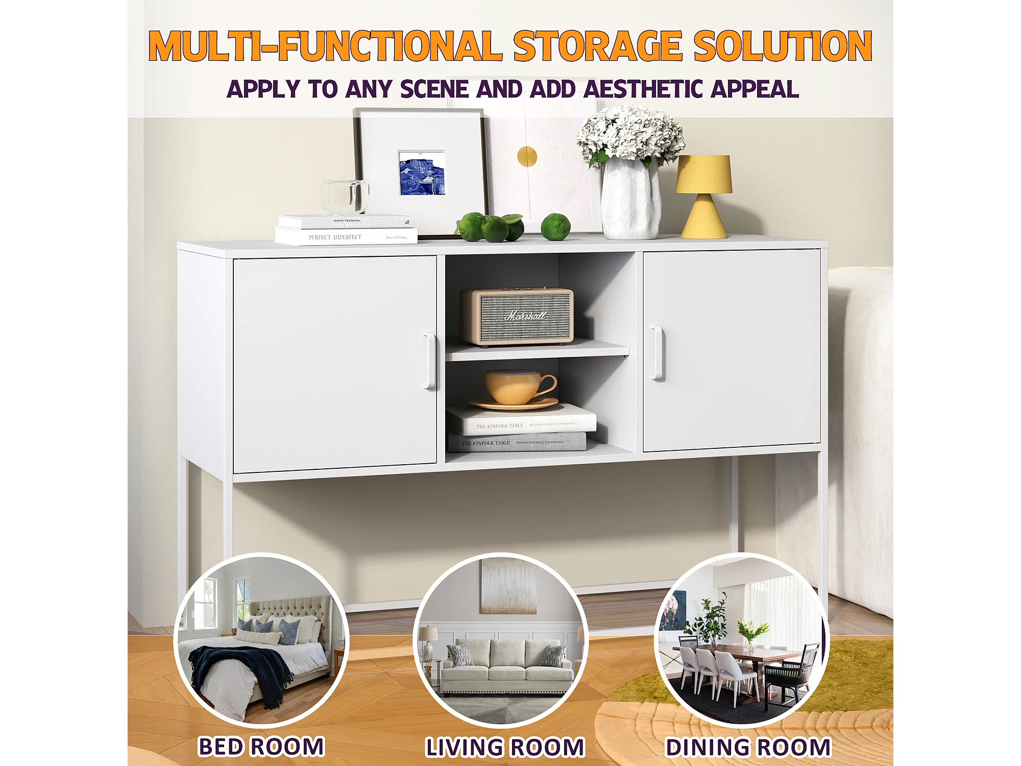Buffet en métal, blanc, 120cm, avec 6 compartiments et portes magnétiques, pour salon, cuisine