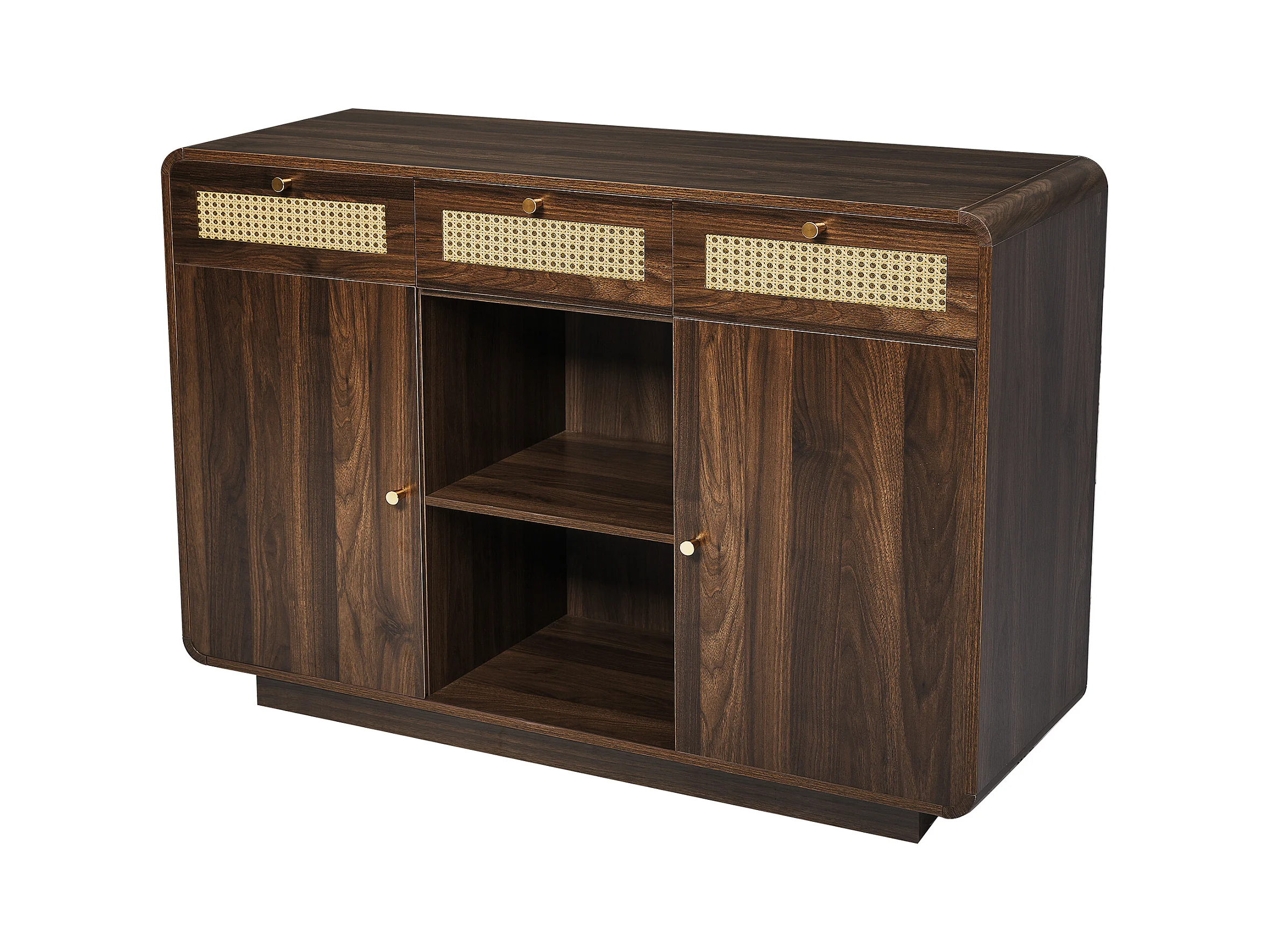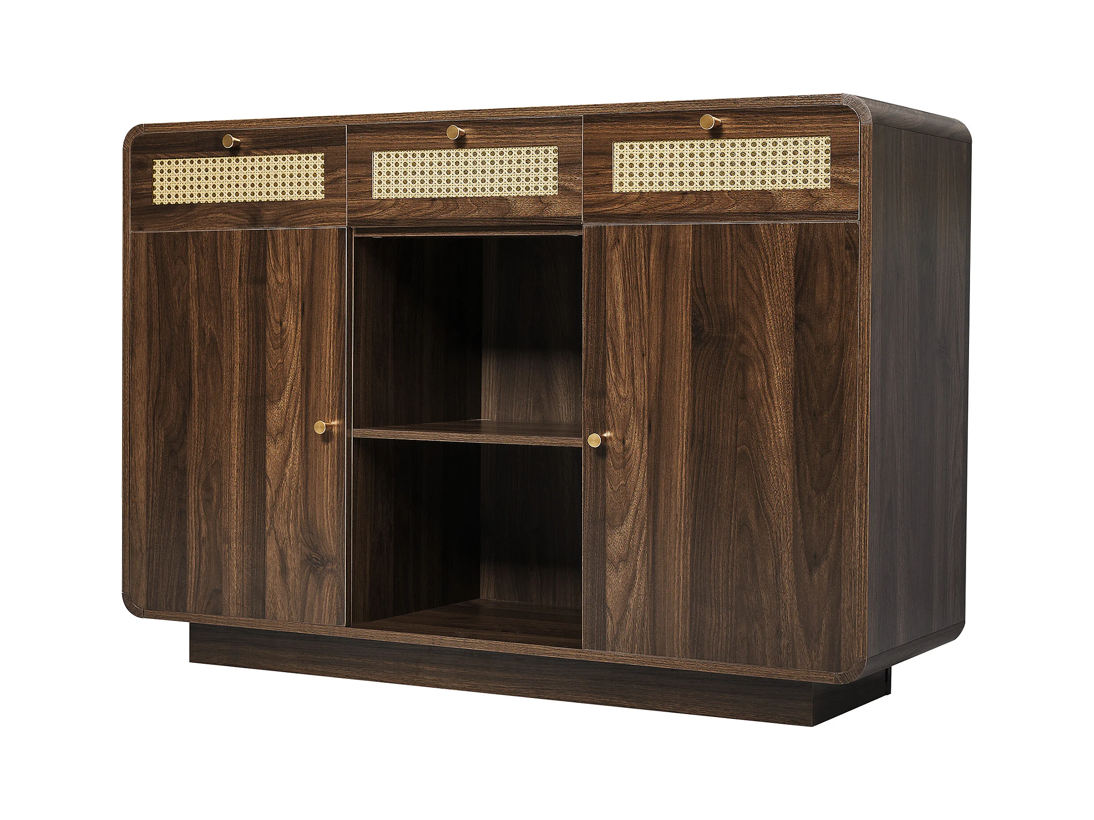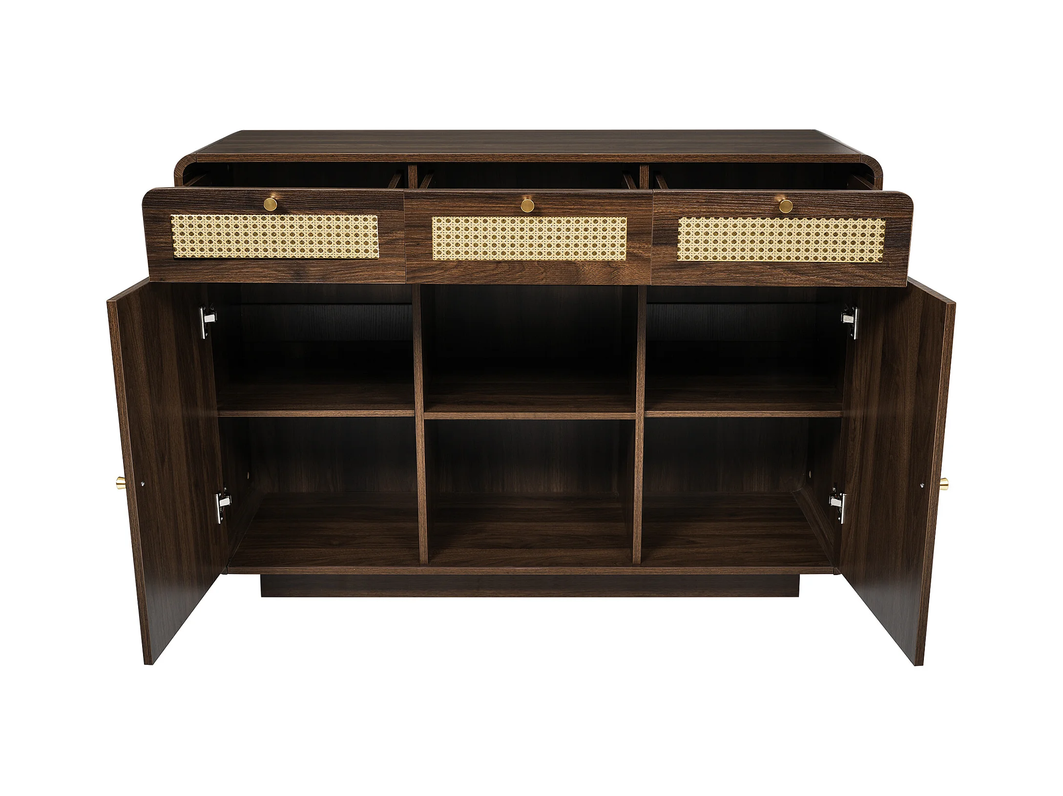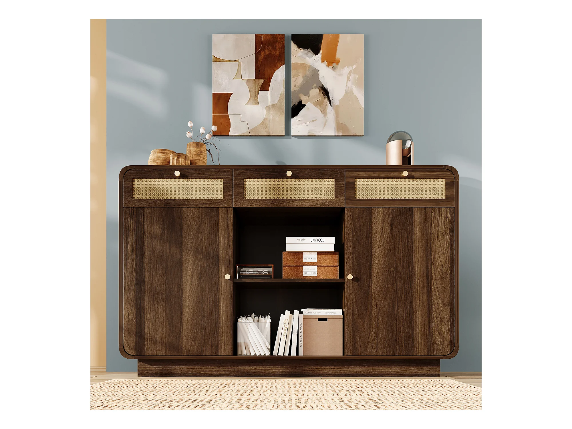 Buffet en noyer avec 2 portes et 3 tiroirs en rotin, étagères réglables en hauteur - pour salon