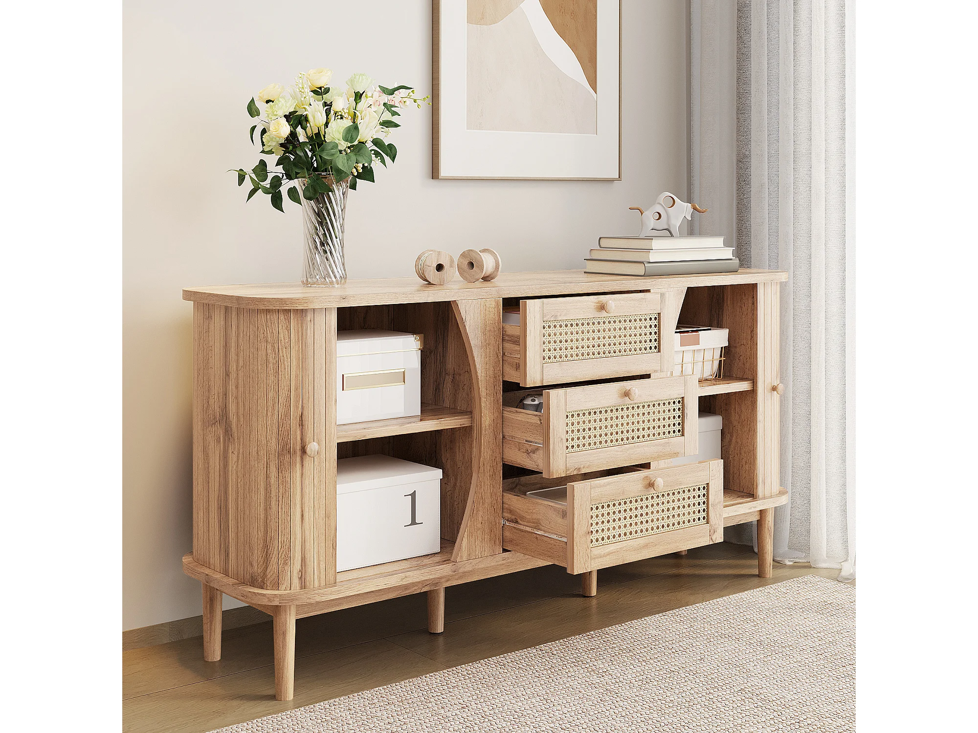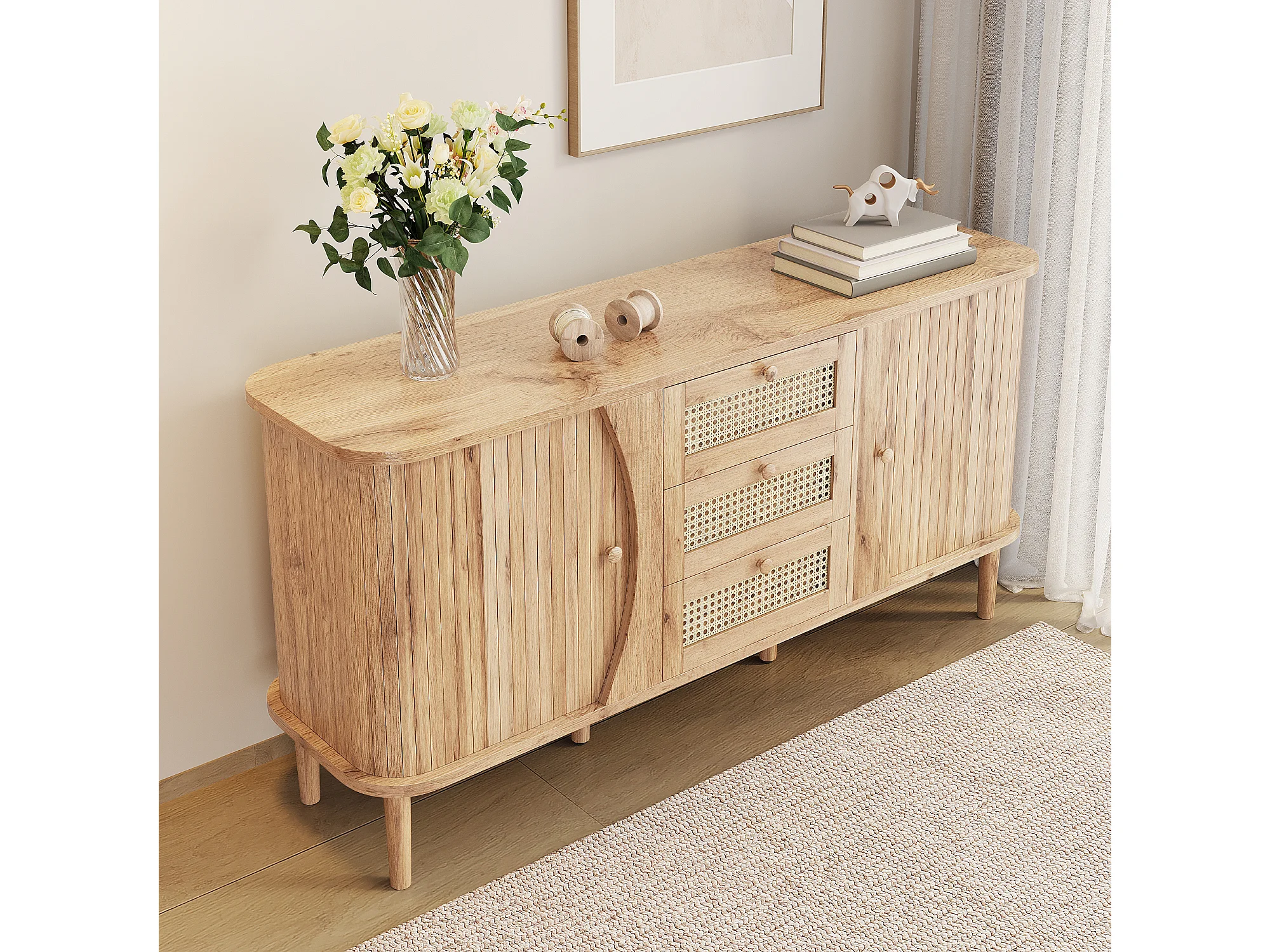Buffet en rotin - 140.5 x 40 x 76 cm - avec 2 portes coulissantes + 3 tiroirs - aggloméré - naturel