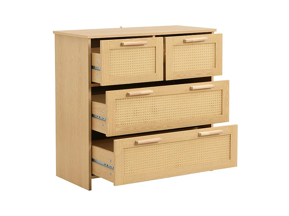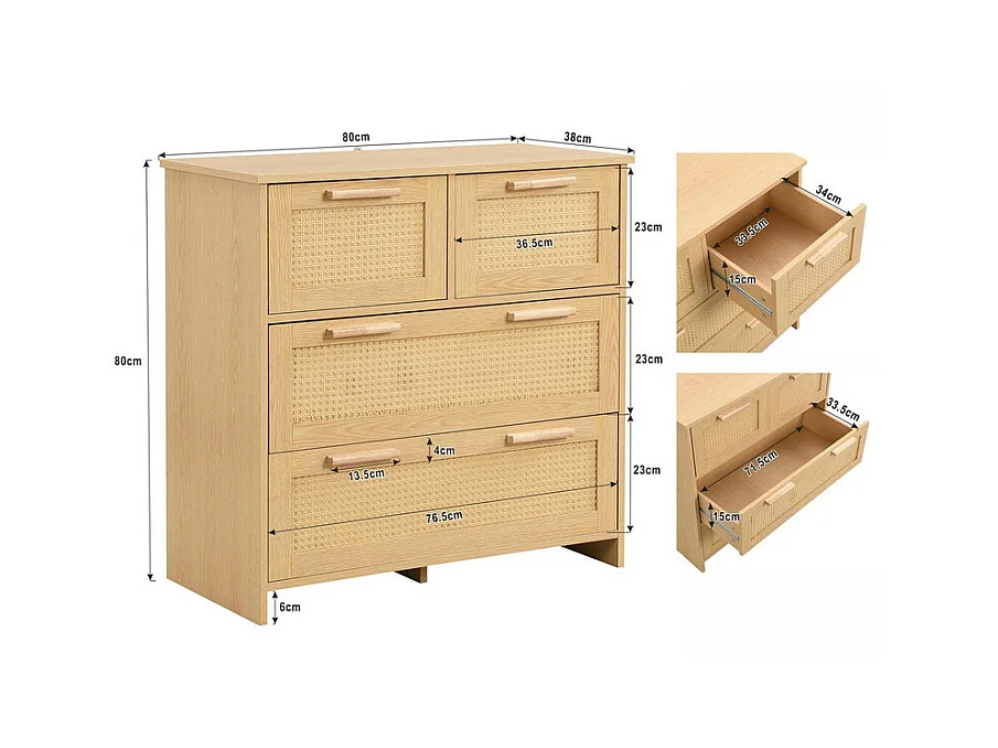 Buffet 80x40x80cm - avec 4 tiroirs en rotin - pieds en bois massif - panneaux de particules - naturel