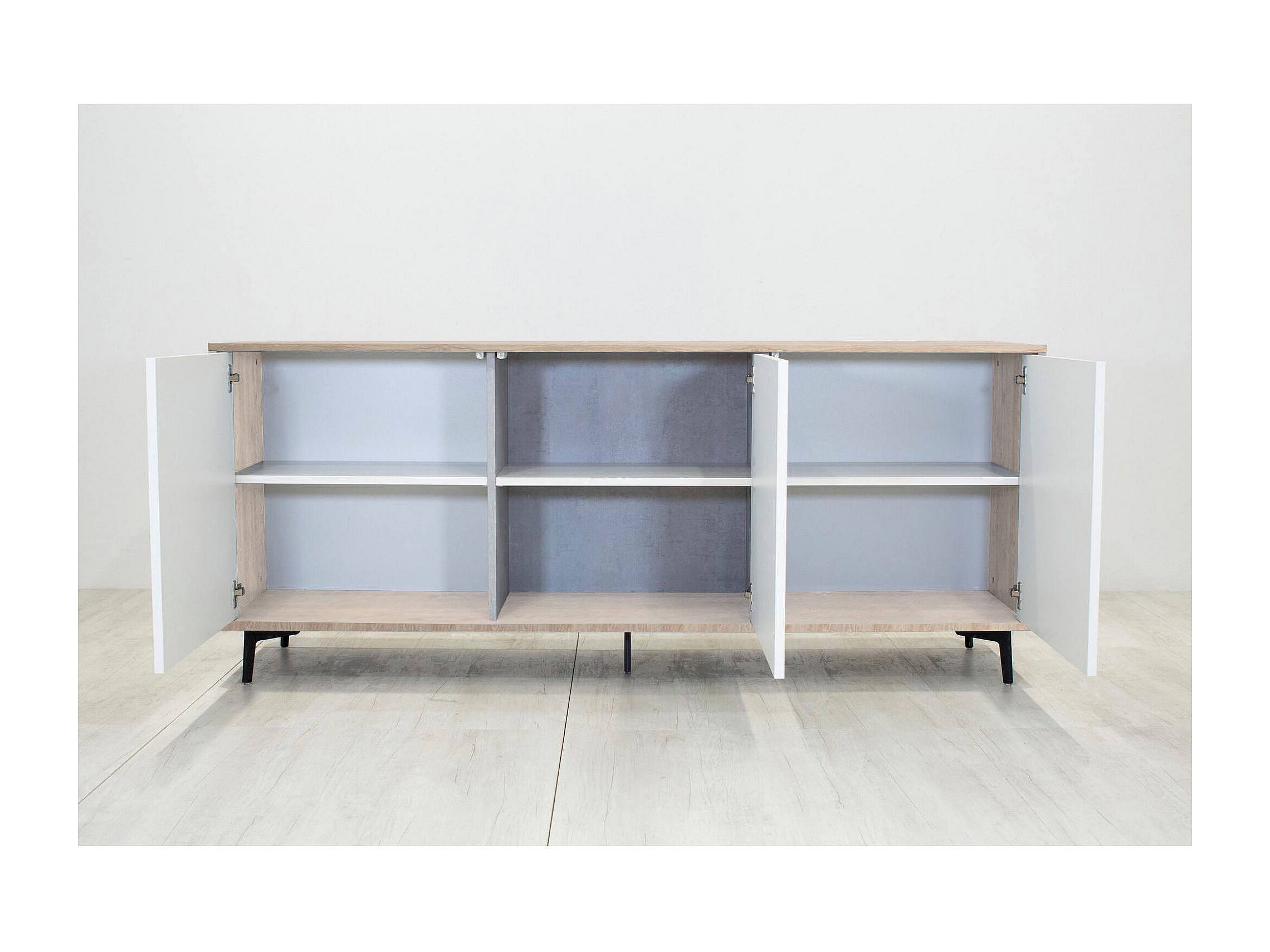 Buffet Loris, Buffet de cuisine avec 4 portes, Buffet de salon, 100% Made in Italy, 200x45h86 cm, Blanc brillant et érable