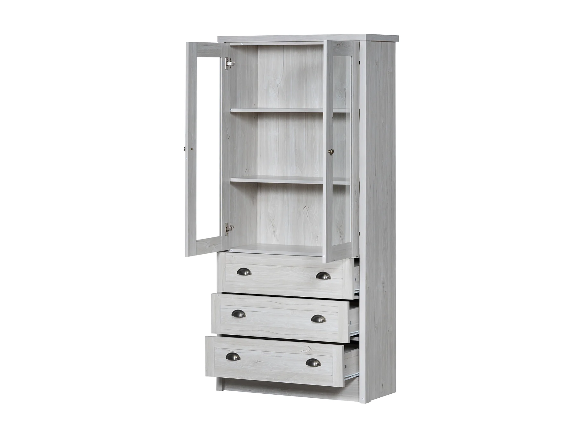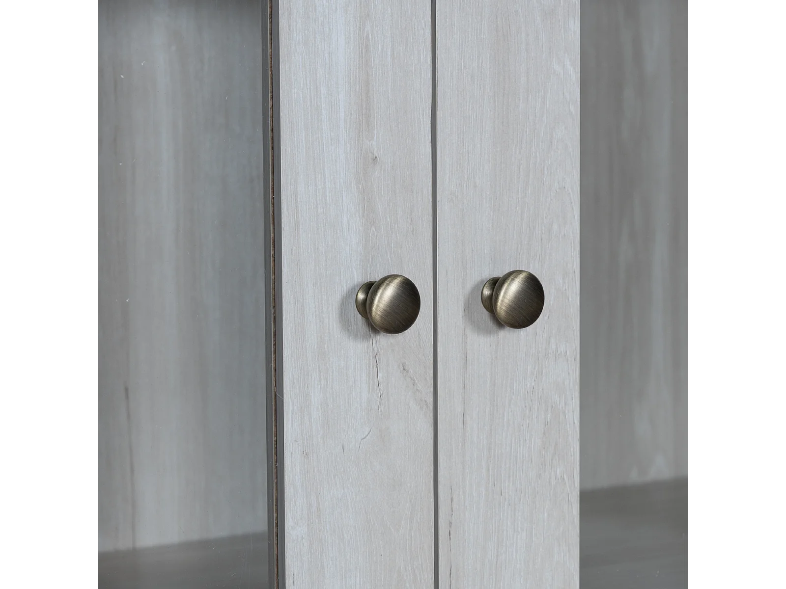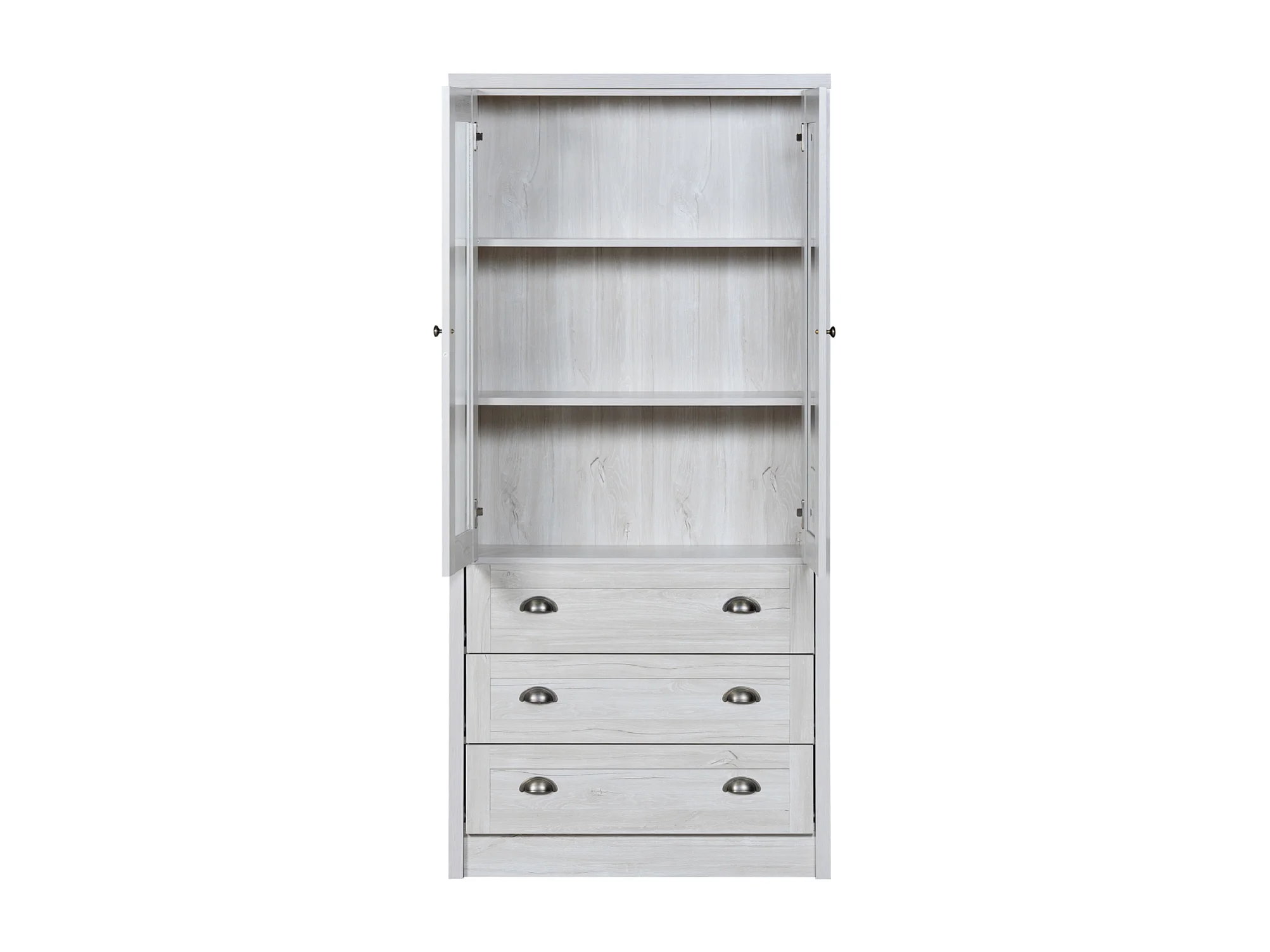 Buffet Haut 80x34x171 cm – Aspect Bois avec Portes vitrées, 3 tiroirs et poignées en cuivre, Gris