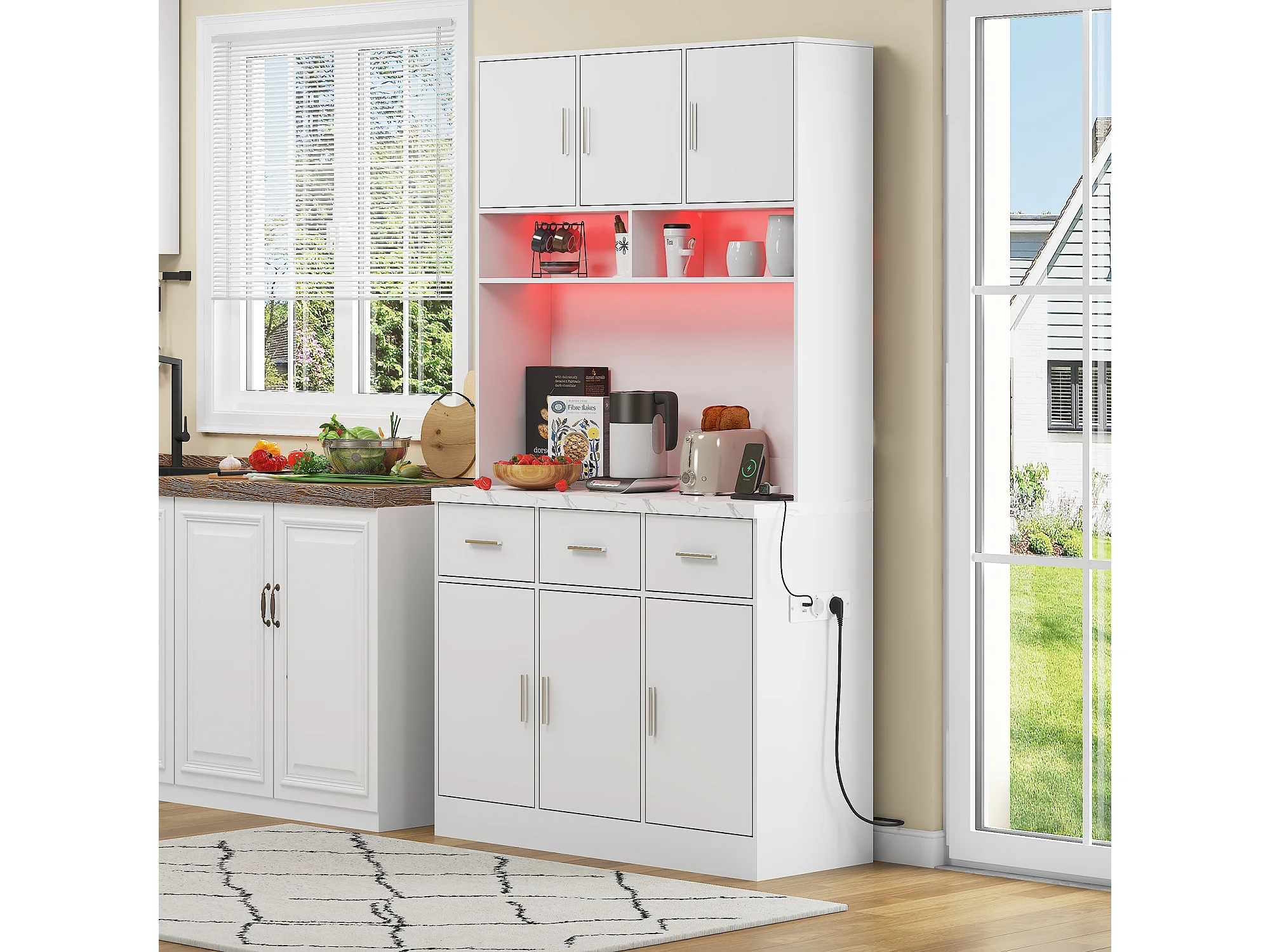 Buffet haut avec 6 portes et 3 tiroirs - 100 x 40 x 180 cm - LEDs et Port de chargement - Bois MDF - Etagères réglables - Blanc