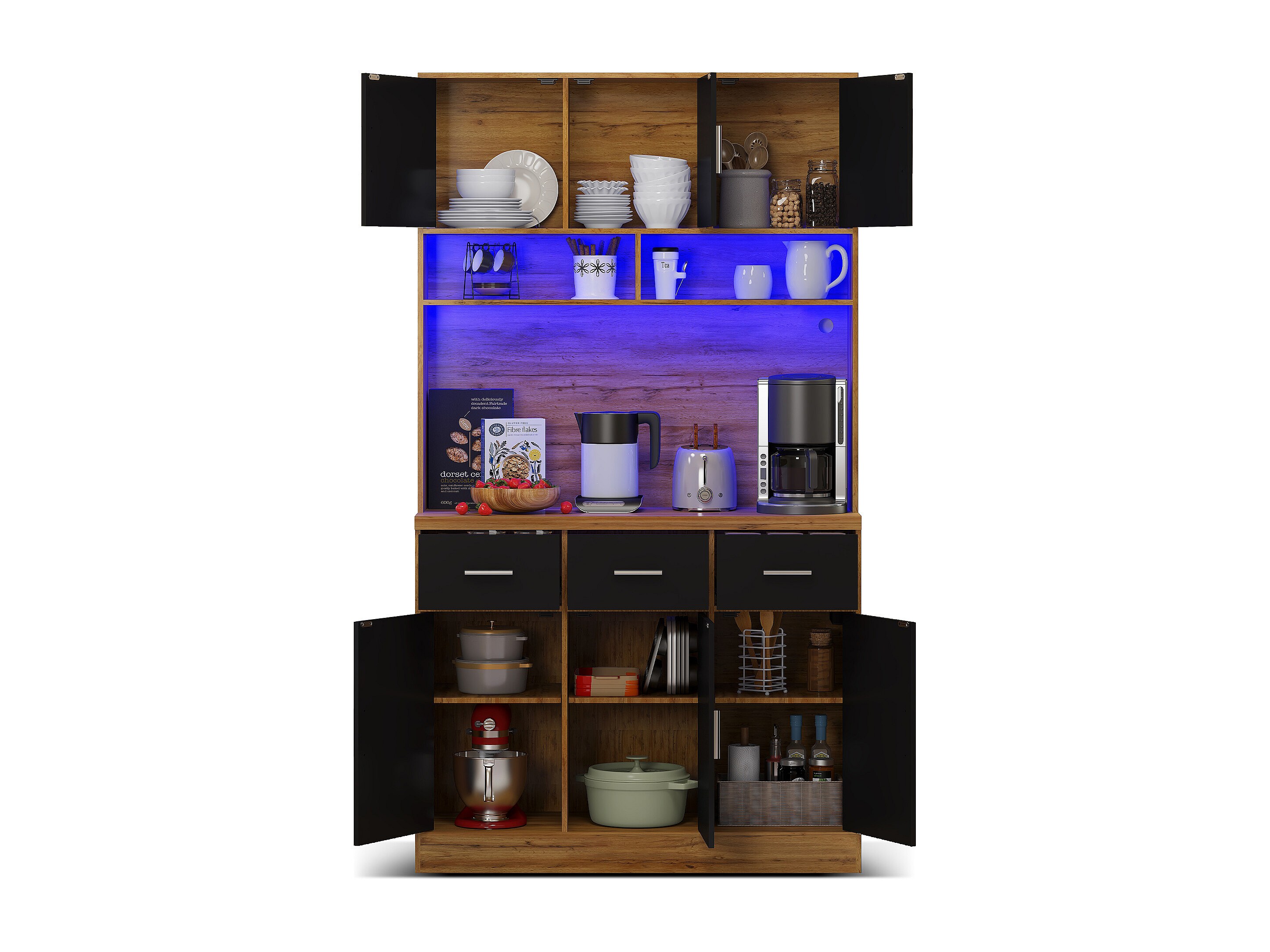 Buffet haut avec éclairage LED, 6 portes noires et 3 tiroirs de rangement - naturel