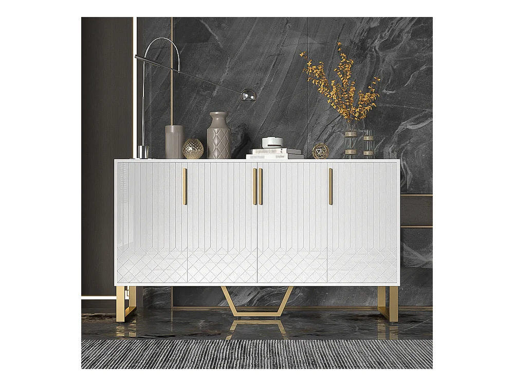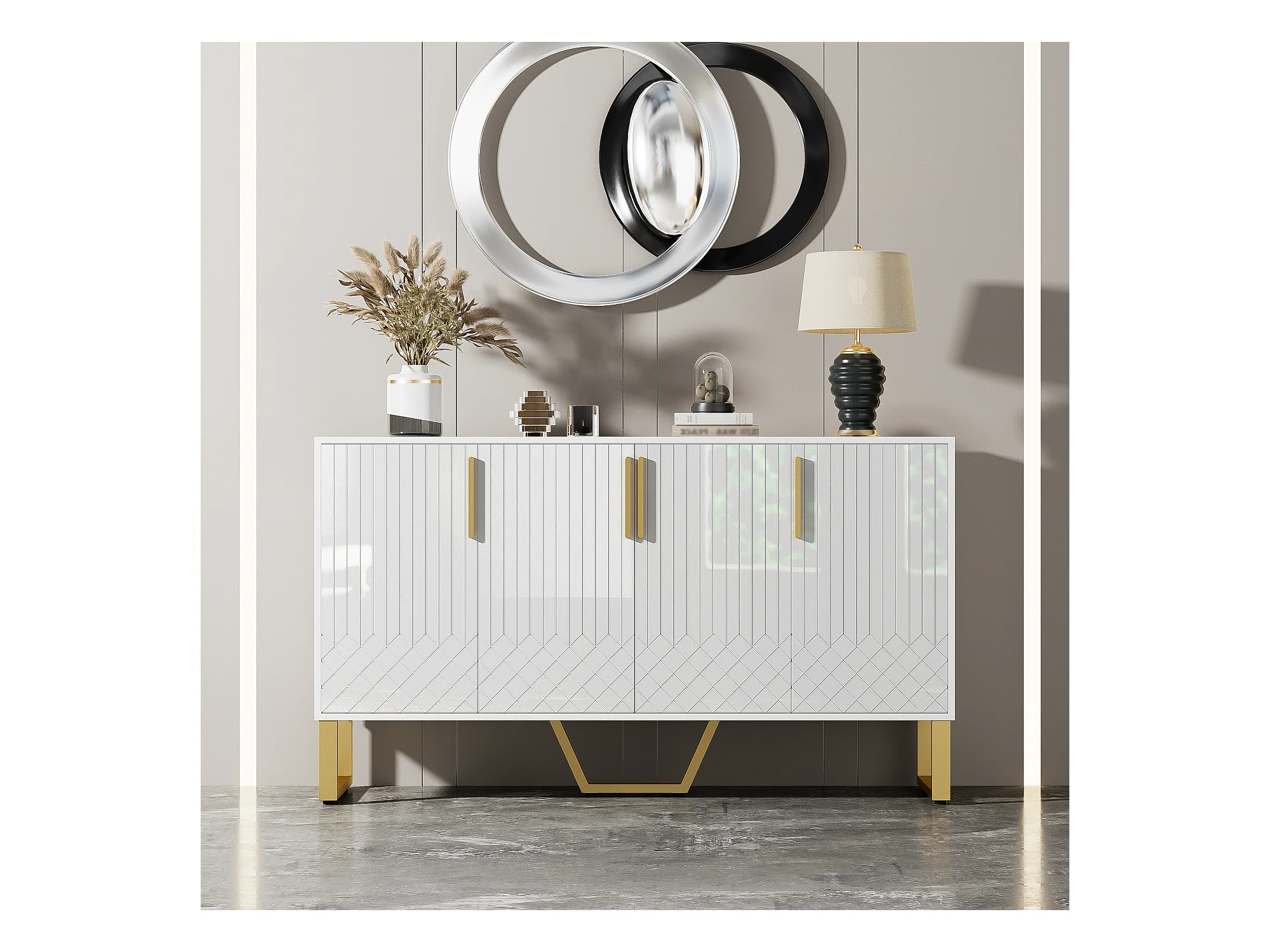 Buffet haut brillant, 4 portes, avec poignées et pieds en métal, design géométrique, MDF, blanc (140x40x80 cm)