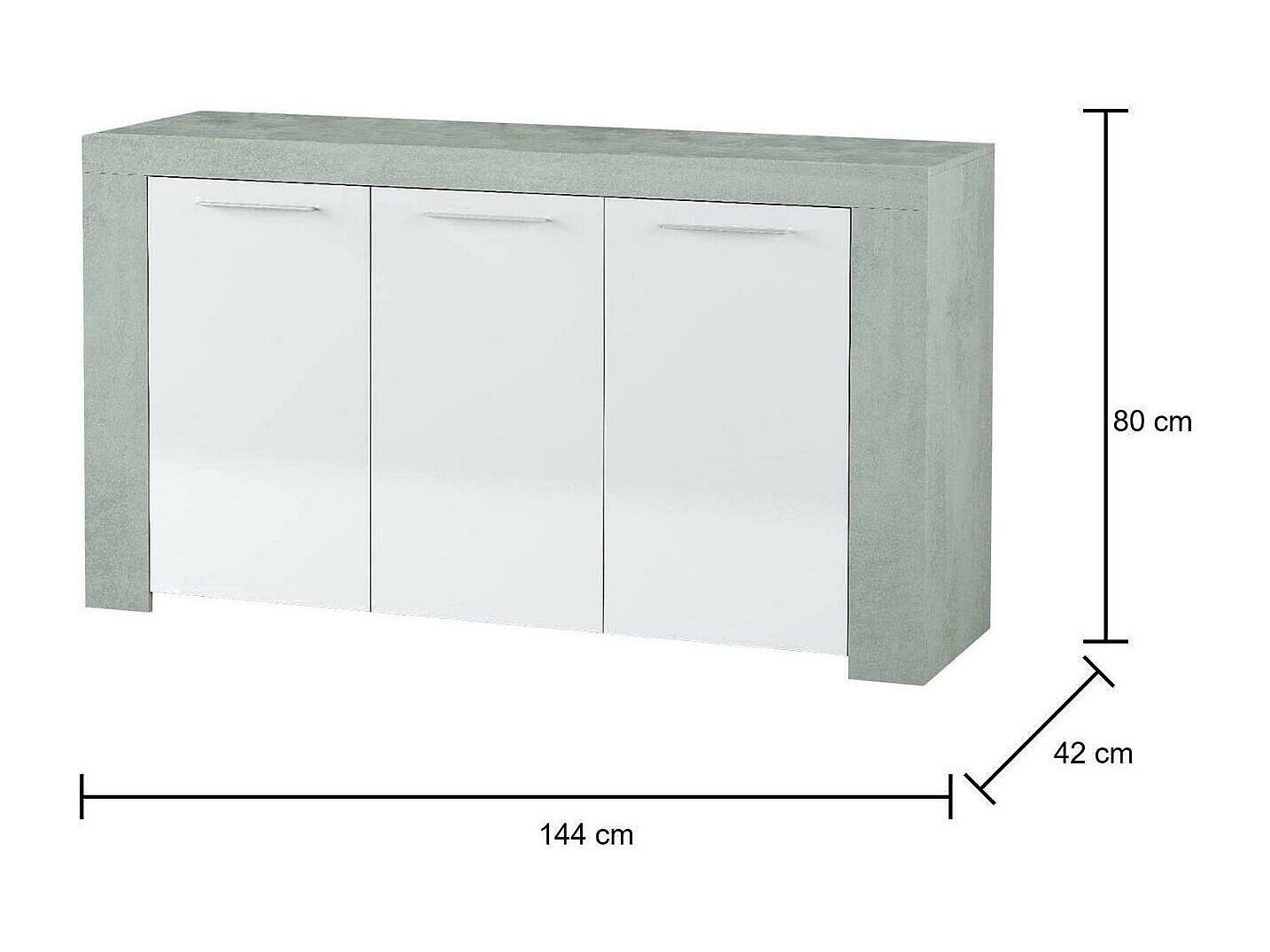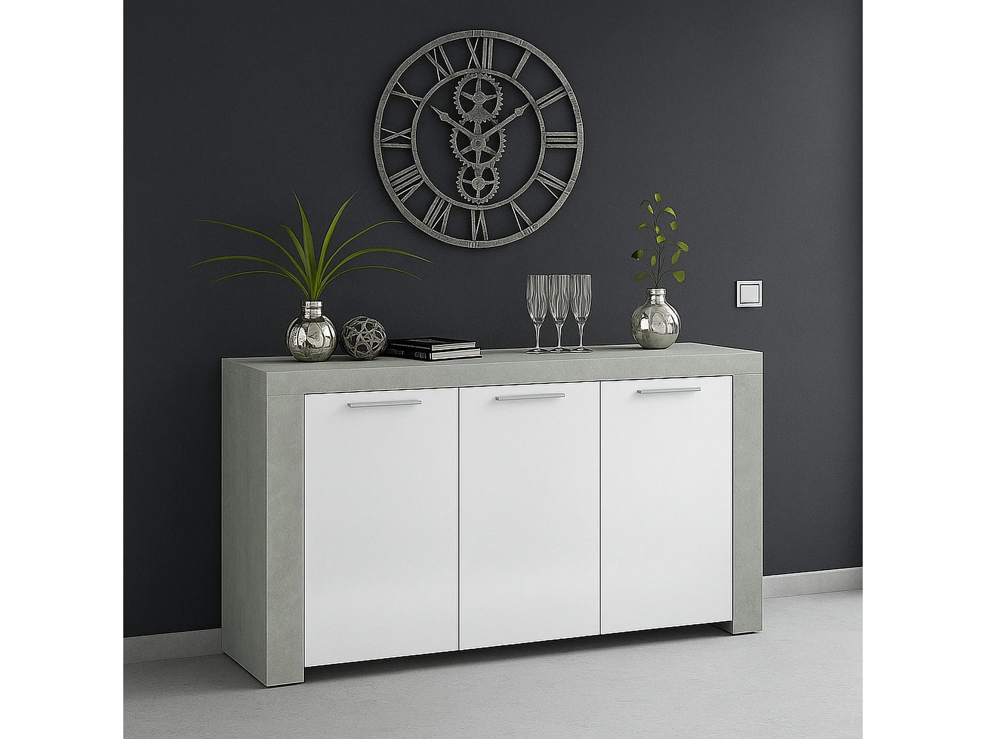 Buffet Dalbiera, Buffet de salon, Meuble TV, Buffet pour salon, Armoire moderne avec 3 portes, 144x42h80 cm, Ciment et Blanc