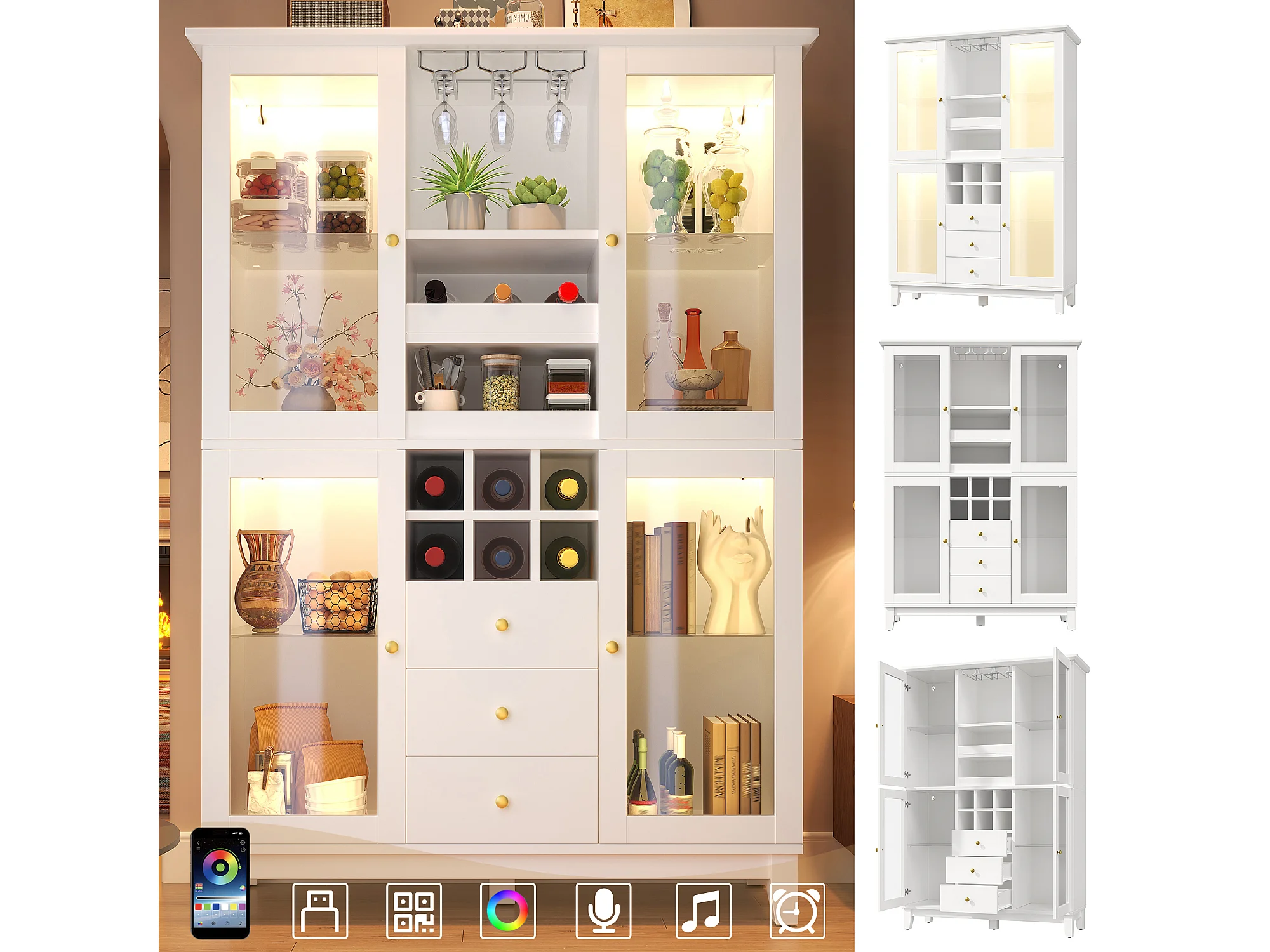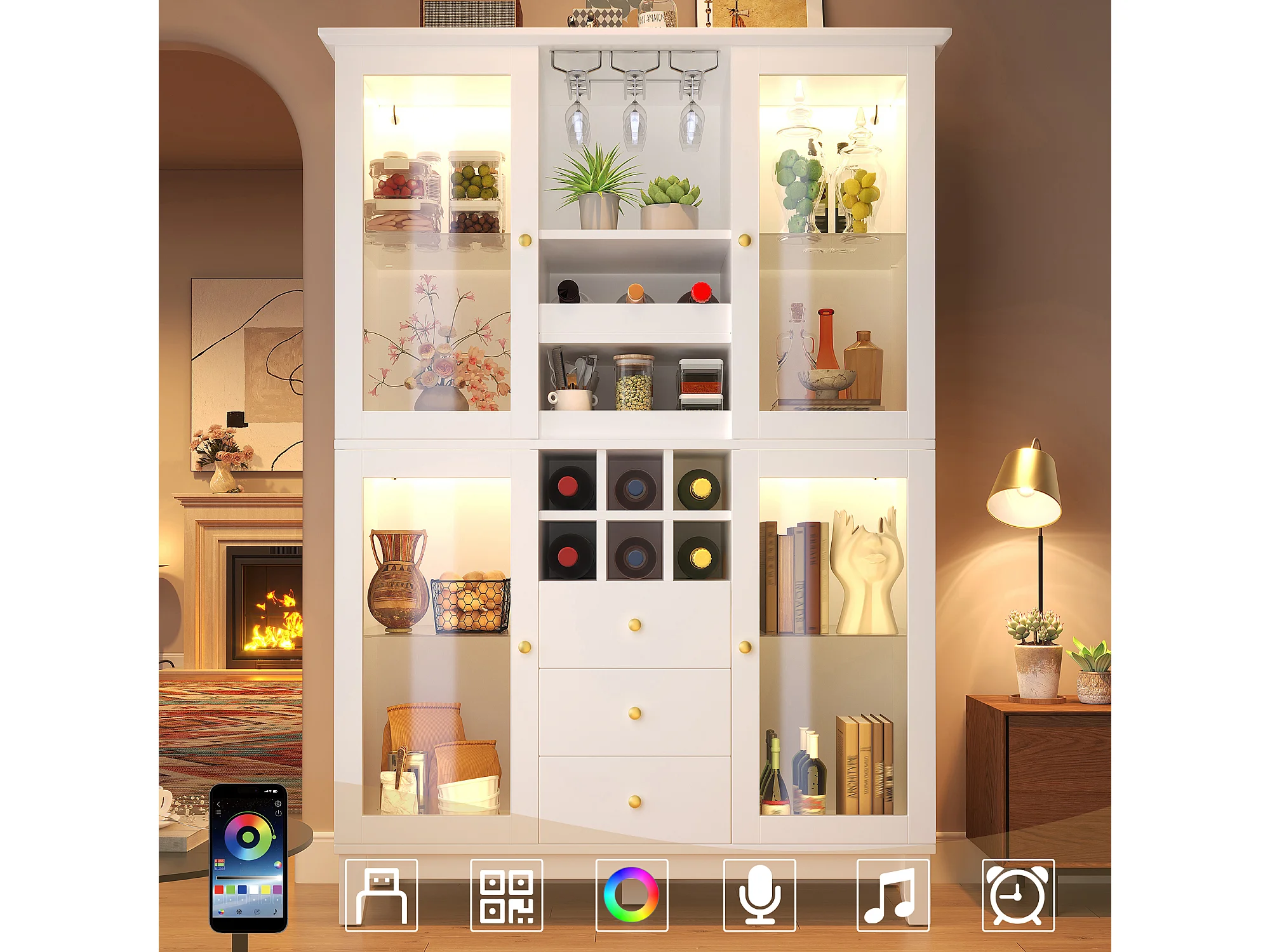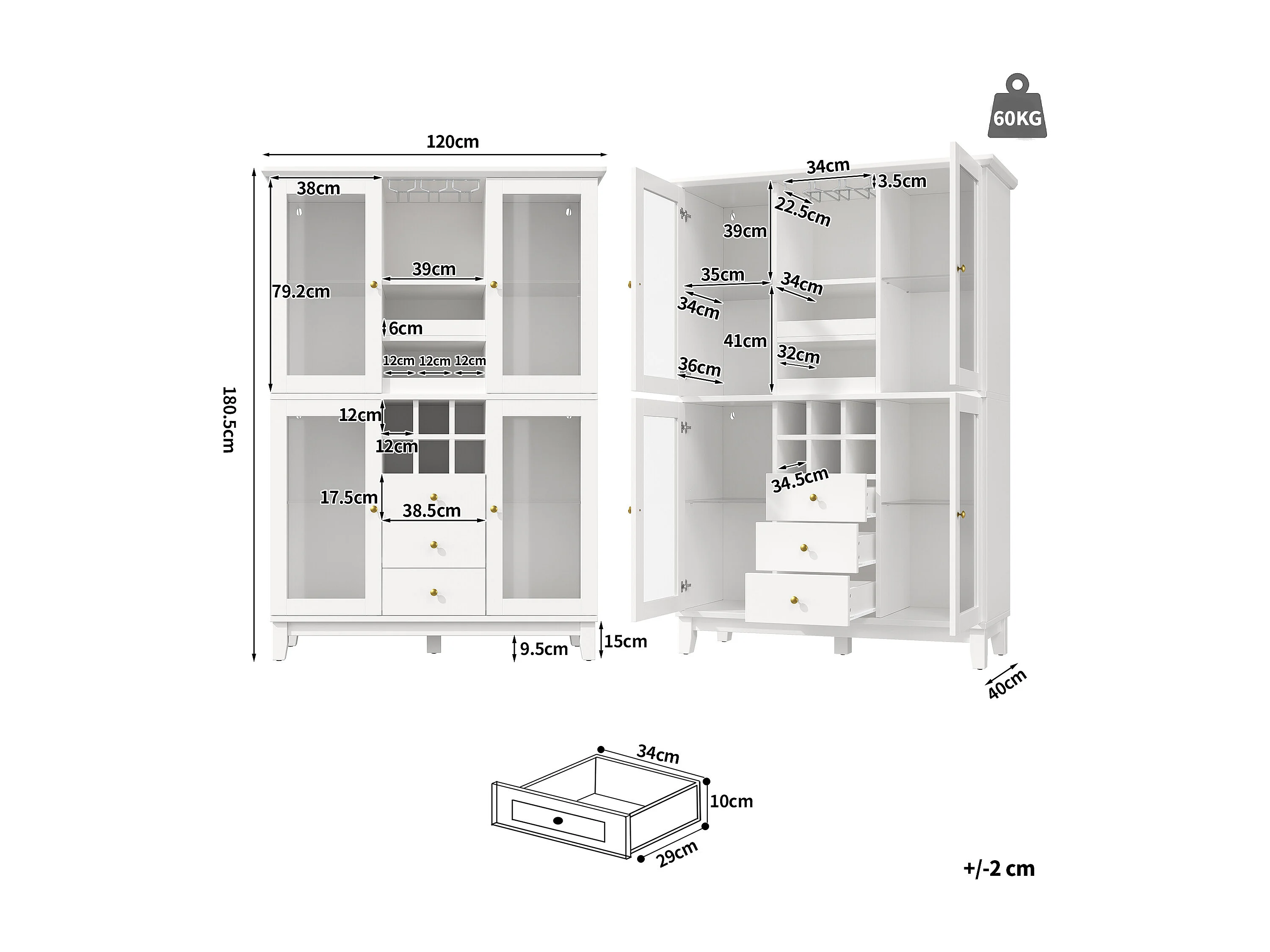 Buffet haut de cuisine moderne - 180.5 x 40 x 120 cm - avec 3 tiroirs + porte-verres + cave à vin + Leds - MDF - blanc