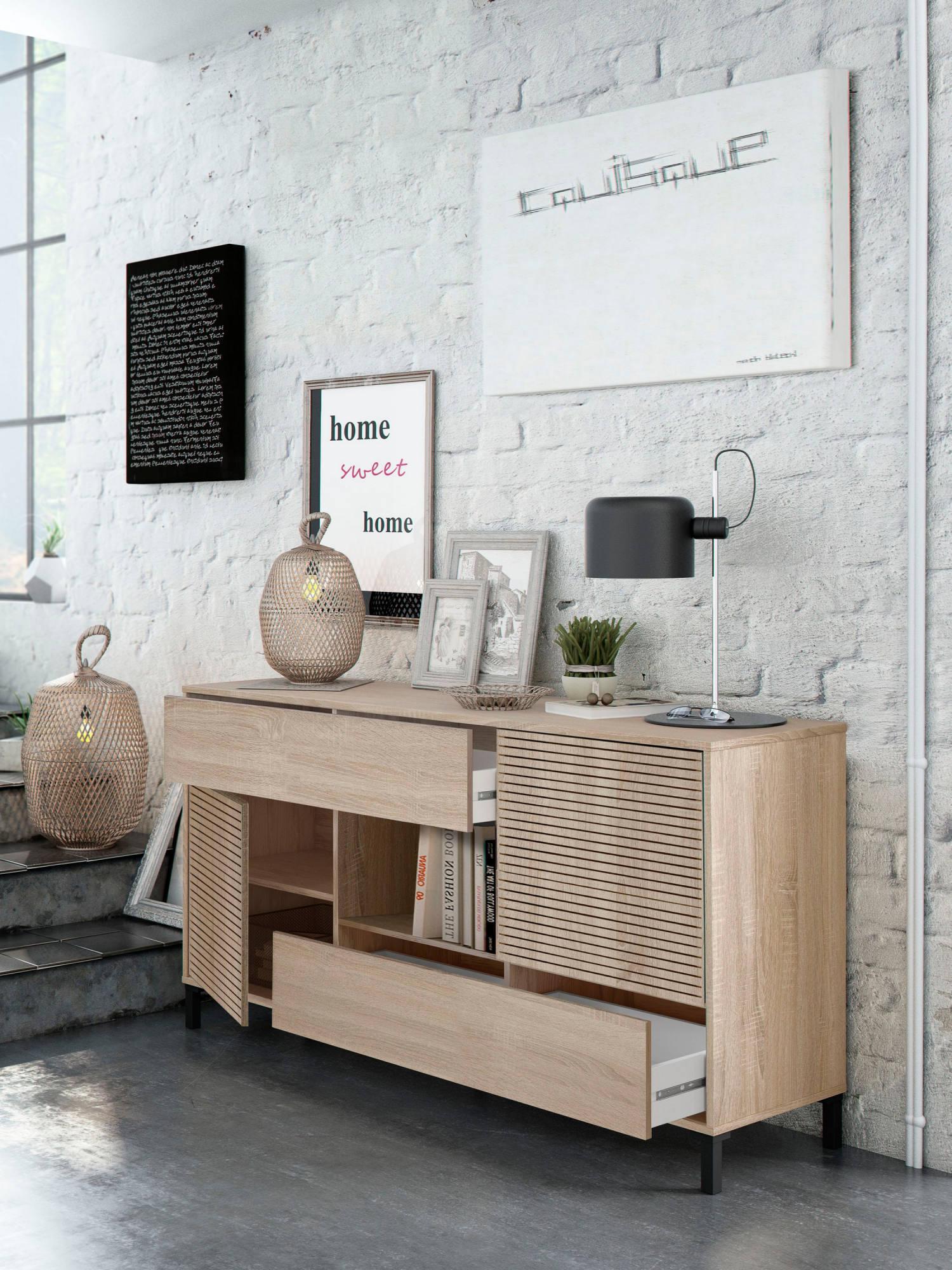 Buffet Dndo, Buffet de salon, Meuble TV, Buffet avec pieds pour salon, Armoire moderne avec 2 portes, 151x41h80 cm, Chêne